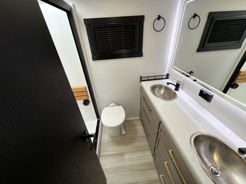 With any Wildwood Heritage Glen fifth wheel by Forest River, the quality construction, attention to detail and design along with a bright and welcoming interior allows you to relax in comfort. You'll love the high-end solid surface countertops included in the Elevated Value Package, along with a JBL sound system, full-length barreled ceilings, and an ultimate interior lighting upgrade. The included Expedition Package features an Accesibelly underbelly panel with 12V tank heaters, nitrogen-filled tires with aluminum rims, and a spacious 30" wide main entry door with a window. The Lippert On-The-Go ladder prep and back-up camera prep let you customize your fifth wheel even more, and the LED awning, front cap, marker and taillights will make it easier than ever to set up camp!