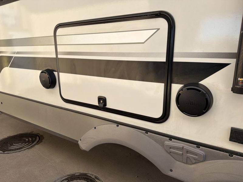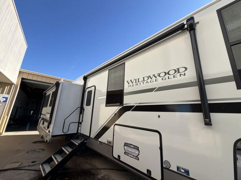 With any Wildwood Heritage Glen fifth wheel by Forest River, the quality construction, attention to detail and design along with a bright and welcoming interior allows you to relax in comfort. You'll love the high-end solid surface countertops included in the Elevated Value Package, along with a JBL sound system, full-length barreled ceilings, and an ultimate interior lighting upgrade. The included Expedition Package features an Accesibelly underbelly panel with 12V tank heaters, nitrogen-filled tires with aluminum rims, and a spacious 30" wide main entry door with a window. The Lippert On-The-Go ladder prep and back-up camera prep let you customize your fifth wheel even more, and the LED awning, front cap, marker and taillights will make it easier than ever to set up camp!