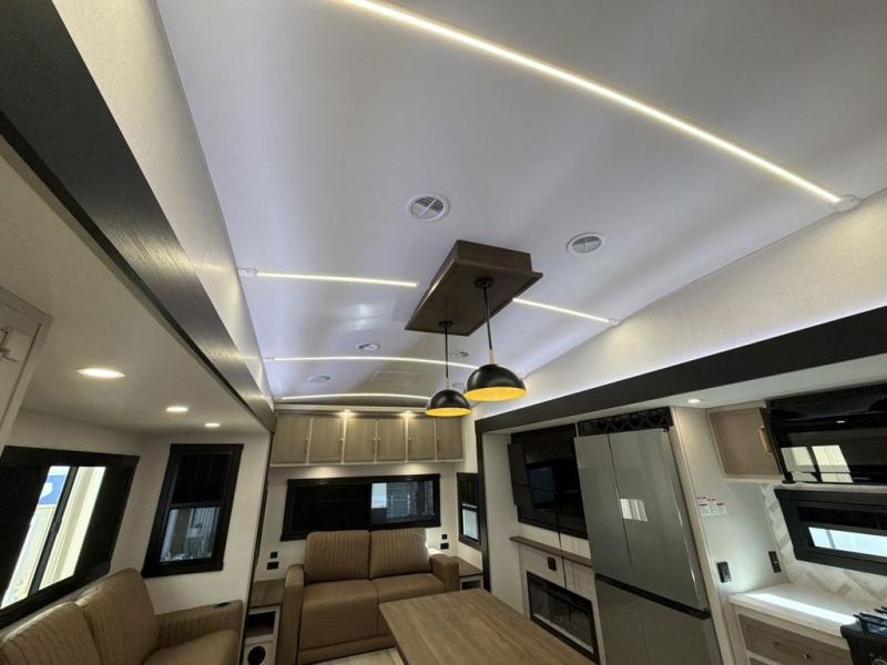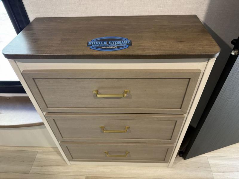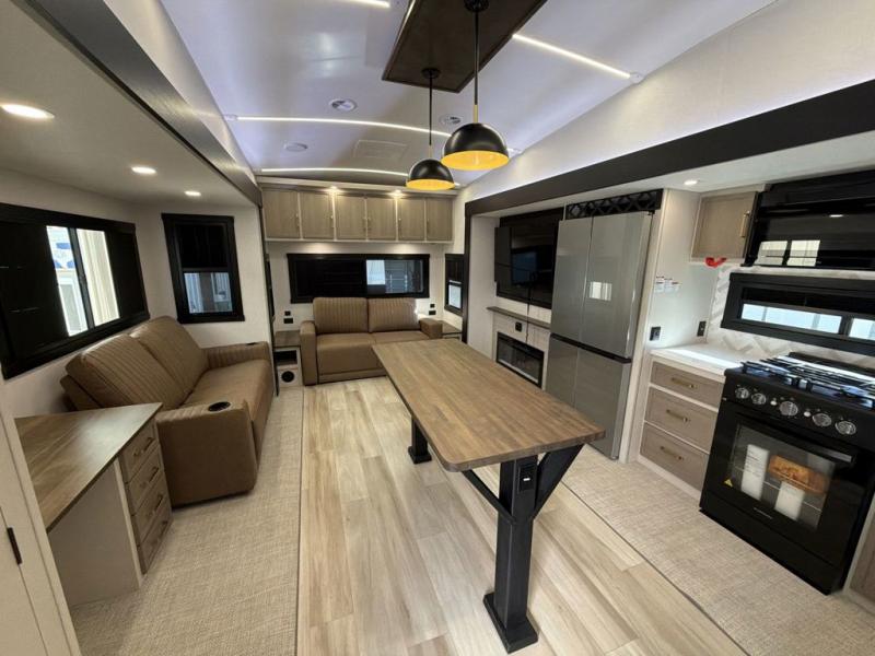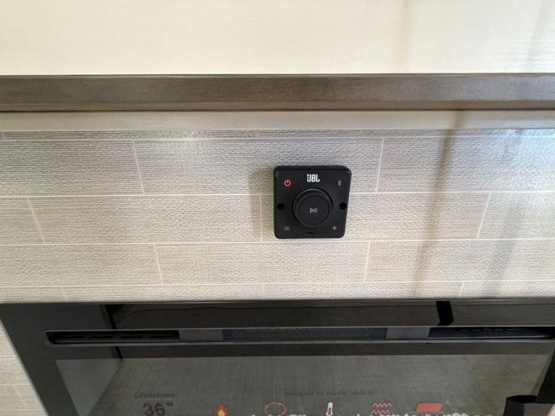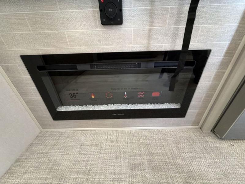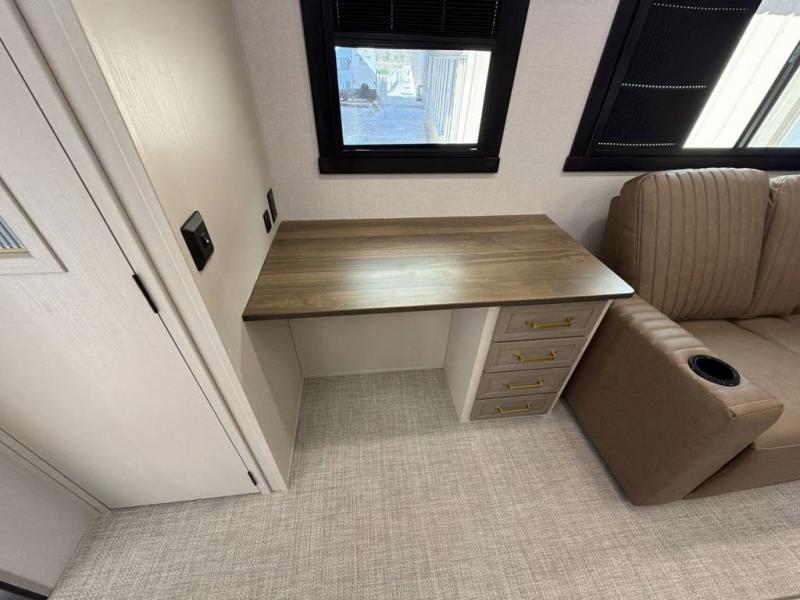 It won't be hard to find comfort in this spacious fifth wheel for four! Once you've unloaded the pass-thru storage, you can head inside to make lunch in the full kitchen. There is a 16-cu. ft. 12V refrigerator here to keep food fresh, and everyone can dine at the kitchen island with four chairs. The theater seating is directly across from the 50" TV and fireplace, and you'll appreciate the hidden storage behind the TV for movies, games, and books! A desk with a chair is also found in the combined kitchen and living area if you need to get some work done, and a rear tri-fold sofa provides sleeping space for guests. Don't overlook the spacious full bath with dual sinks and the front private bedroom with a custom king bed slide. A front wardrobe plus a dresser will let you keep your space tidy, and there is washer/dryer prep if you plan to add those appliances!