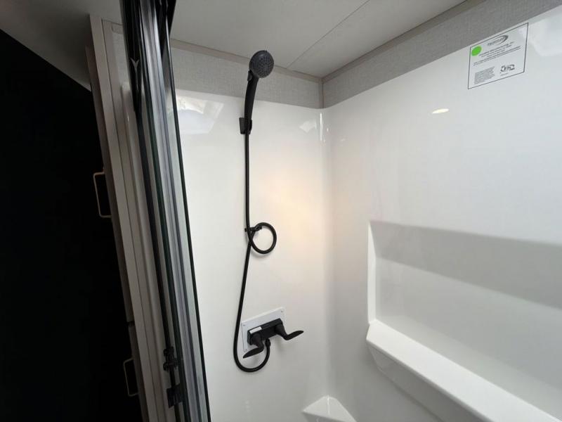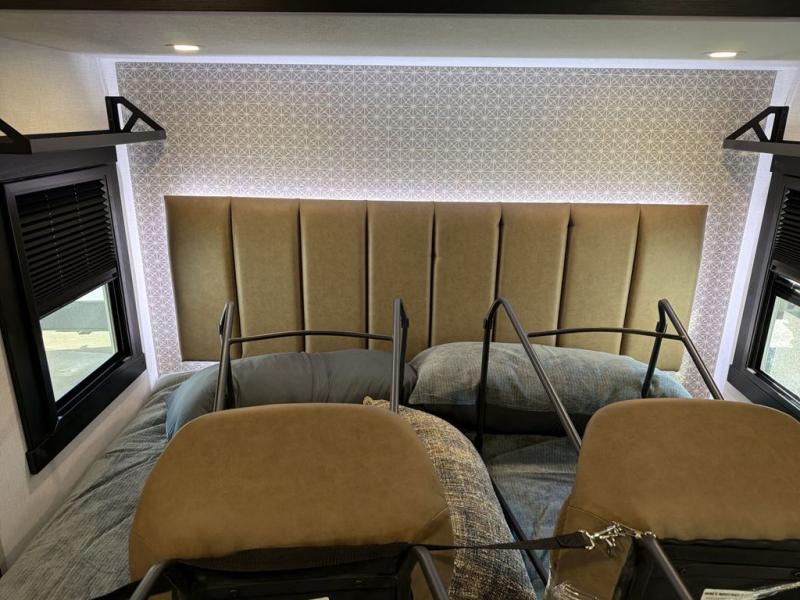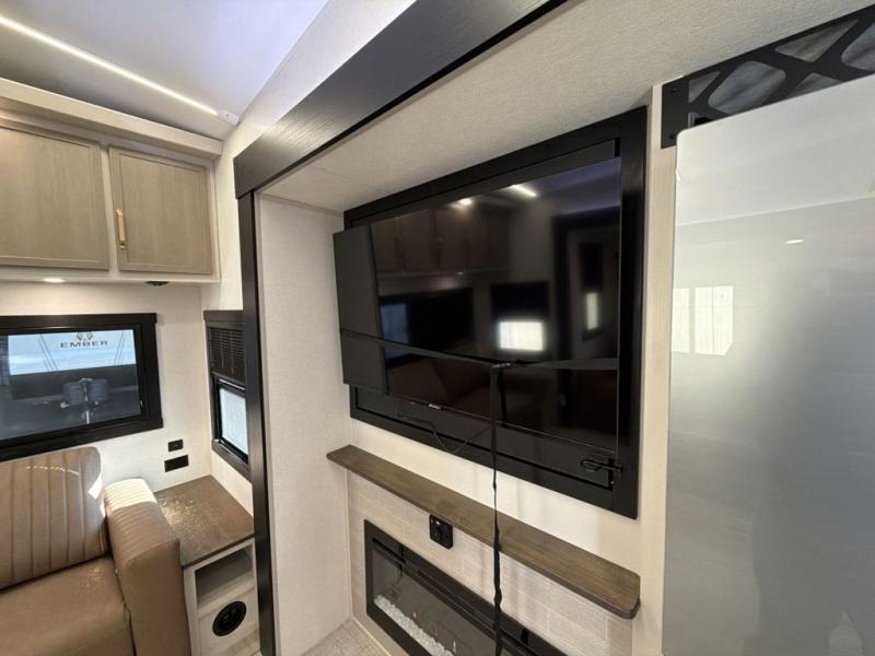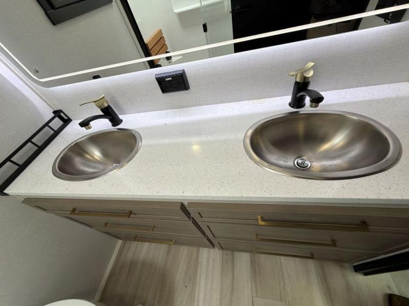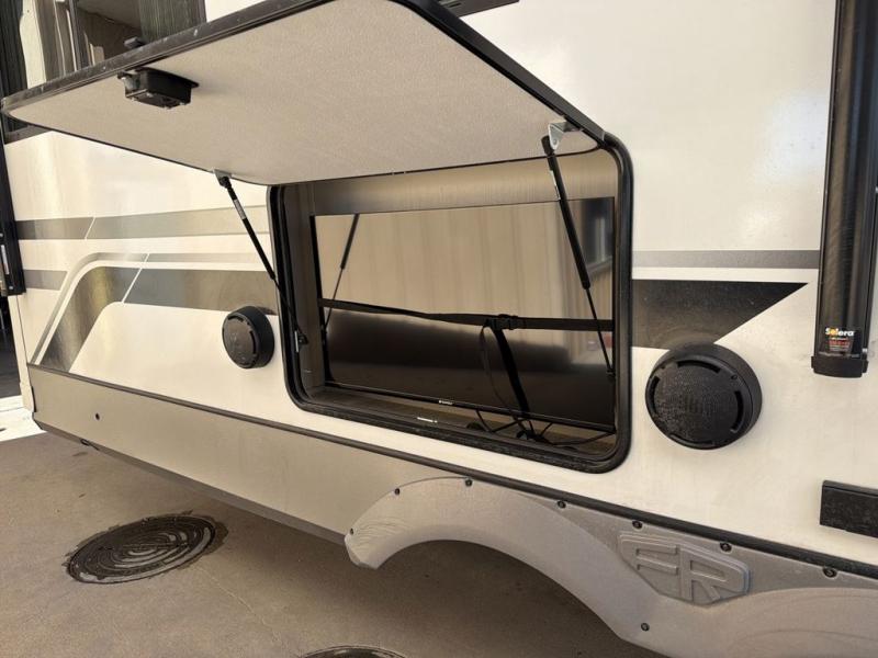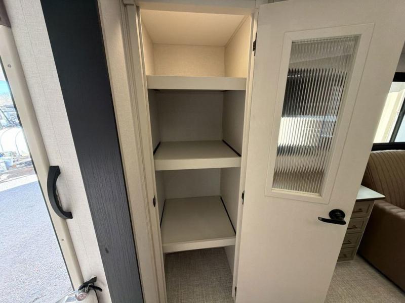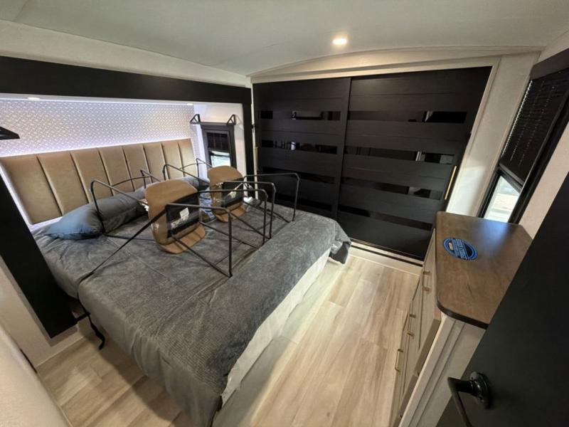 It won't be hard to find comfort in this spacious fifth wheel for four! Once you've unloaded the pass-thru storage, you can head inside to make lunch in the full kitchen. There is a 16-cu. ft. 12V refrigerator here to keep food fresh, and everyone can dine at the kitchen island with four chairs. The theater seating is directly across from the 50" TV and fireplace, and you'll appreciate the hidden storage behind the TV for movies, games, and books! A desk with a chair is also found in the combined kitchen and living area if you need to get some work done, and a rear tri-fold sofa provides sleeping space for guests. Don't overlook the spacious full bath with dual sinks and the front private bedroom with a custom king bed slide. A front wardrobe plus a dresser will let you keep your space tidy, and there is washer/dryer prep if you plan to add those appliances!