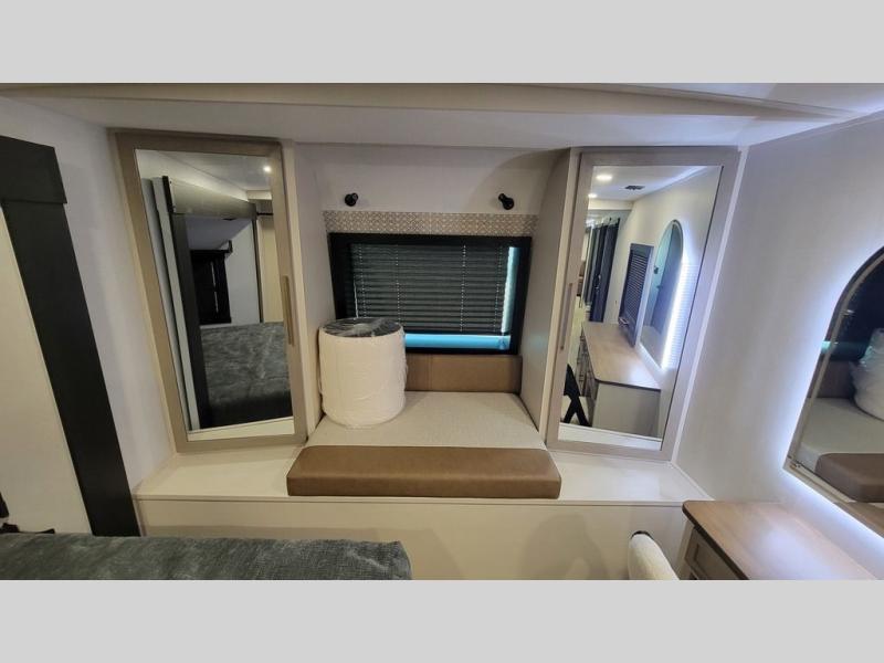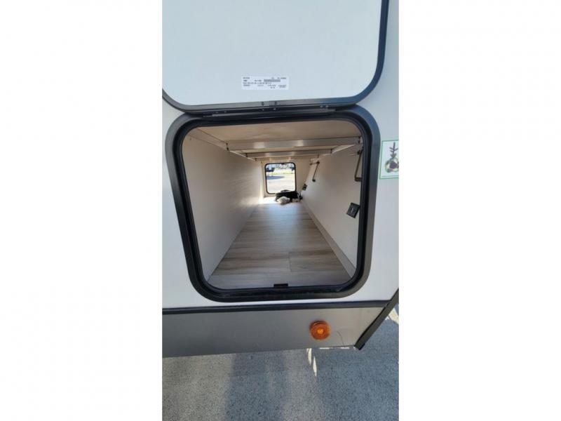 Enjoy comfortable stays at the campground in this spacious travel trailer. The rear living area with panoramic windows will be a favorite place to relax with its L-shaped sofa and ottoman, which is in direct view of the 50" TV and fireplace. There is also a hidden storage behind the TV, and a designated desk space in the back where you can get some work done. The chef of your group can create meals in the full kitchen, and there is dining space at the kitchen island with four chairs. Towards the front, a full bath will let you freshen up each day, and the front private bedroom with a queen bed slide is sure to bring comfort. There are also dual wardrobes with a bench in between, plus a dresser with an ottoman!