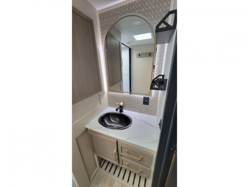 With any Wildwood Heritage Glen travel trailer by Forest River, the quality construction, attention to detail and design along with a bright and welcoming interior allows you to relax in comfort. Each model includes a WeatherShield one piece fiberglass roof, nitrogen-filled radial tires, and an enclosed underbelly with 12V tank heaters on all holding tanks for added protection. You will appreciate the on-demand tankless water heater, along with power stabilizer and tongue jacks, and an extra-large pass-thru storage with slam latch baggage doors. Head inside to enjoy matte gold hardware, wood door casings in place of plastic door casings, and an ultimate interior lighting upgrade with 4k puck/strip lights and a stylish LED back-lit bath mirror!