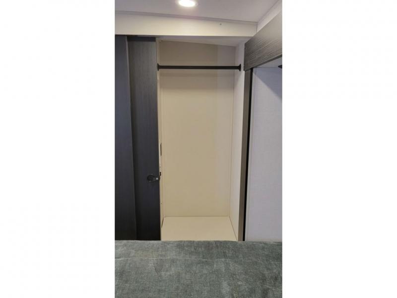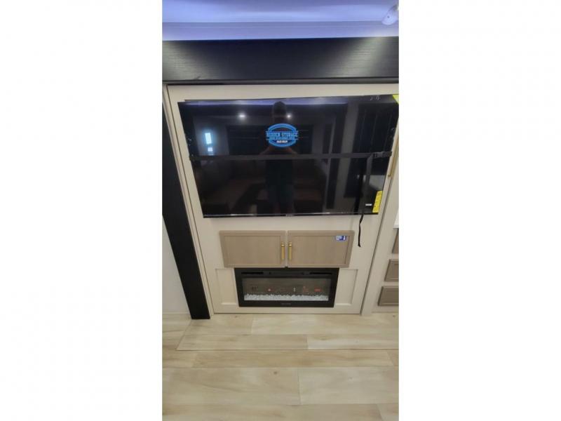 Enjoy comfortable stays at the campground in this spacious travel trailer. The rear living area with panoramic windows will be a favorite place to relax with its L-shaped sofa and ottoman, which is in direct view of the 50" TV and fireplace. There is also a hidden storage behind the TV, and a designated desk space in the back where you can get some work done. The chef of your group can create meals in the full kitchen, and there is dining space at the kitchen island with four chairs. Towards the front, a full bath will let you freshen up each day, and the front private bedroom with a queen bed slide is sure to bring comfort. There are also dual wardrobes with a bench in between, plus a dresser with an ottoman!