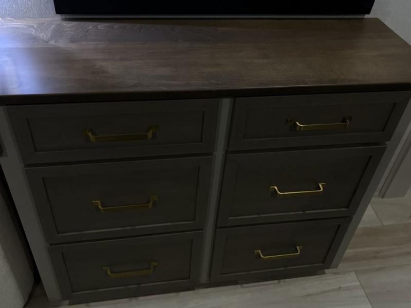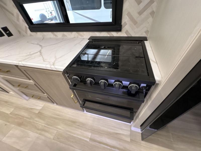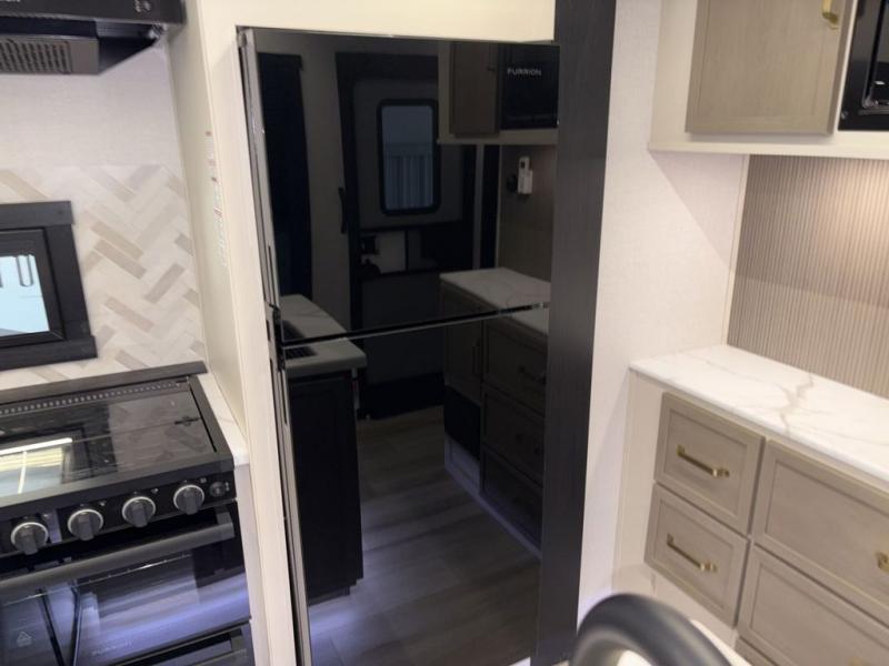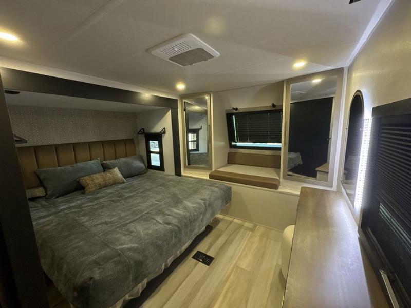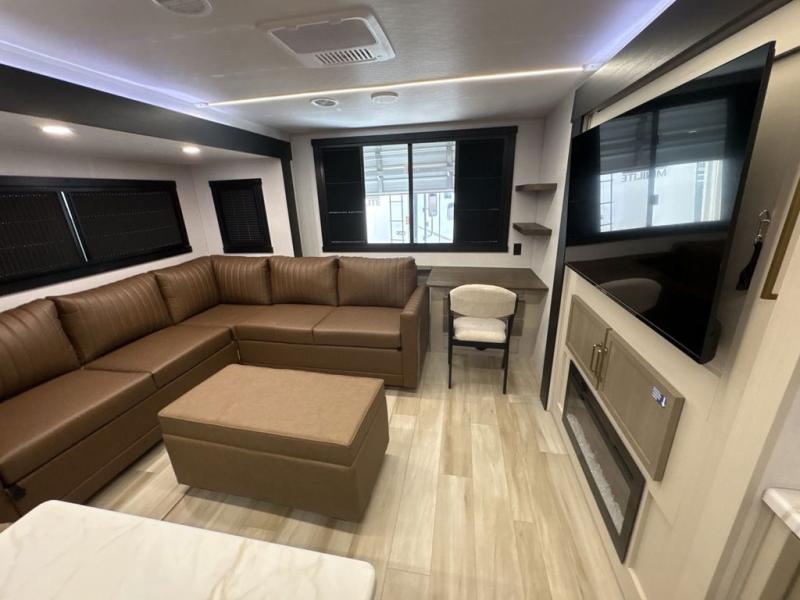 Enjoy comfortable stays at the campground in this spacious travel trailer. The rear living area with panoramic windows will be a favorite place to relax with its L-shaped sofa and ottoman, which is in direct view of the 50" TV and fireplace. There is also a hidden storage behind the TV, and a designated desk space in the back where you can get some work done. The chef of your group can create meals in the full kitchen, and there is dining space at the kitchen island with four chairs. Towards the front, a full bath will let you freshen up each day, and the front private bedroom with a queen bed slide is sure to bring comfort. There are also dual wardrobes with a bench in between, plus a dresser with an ottoman!