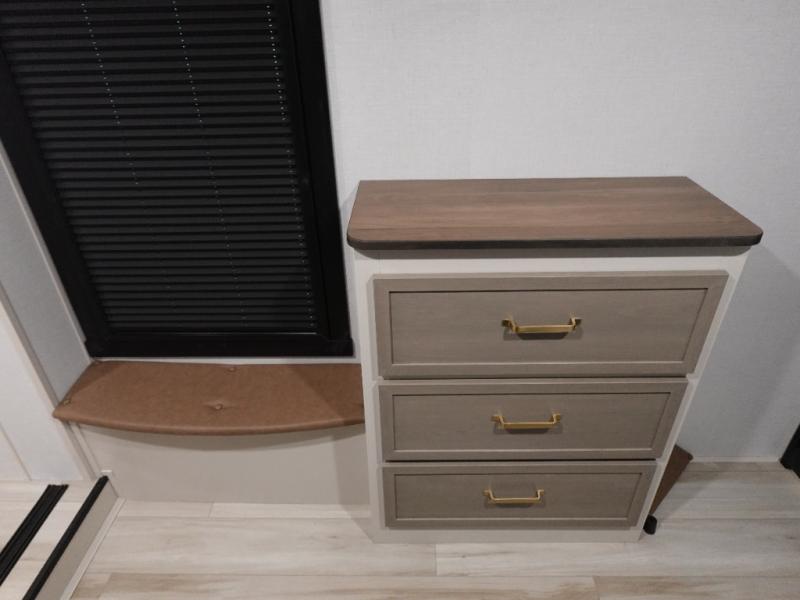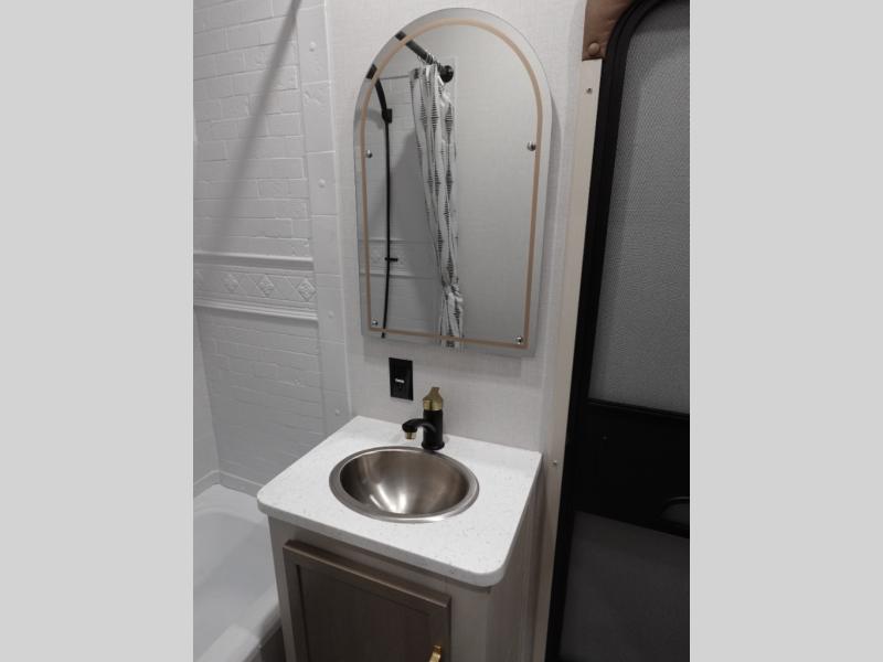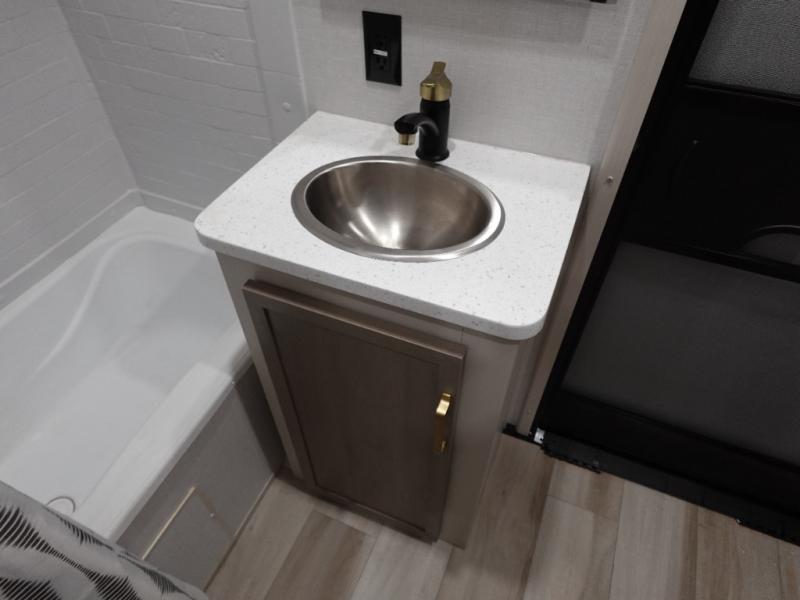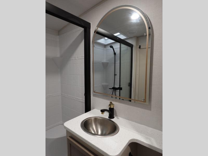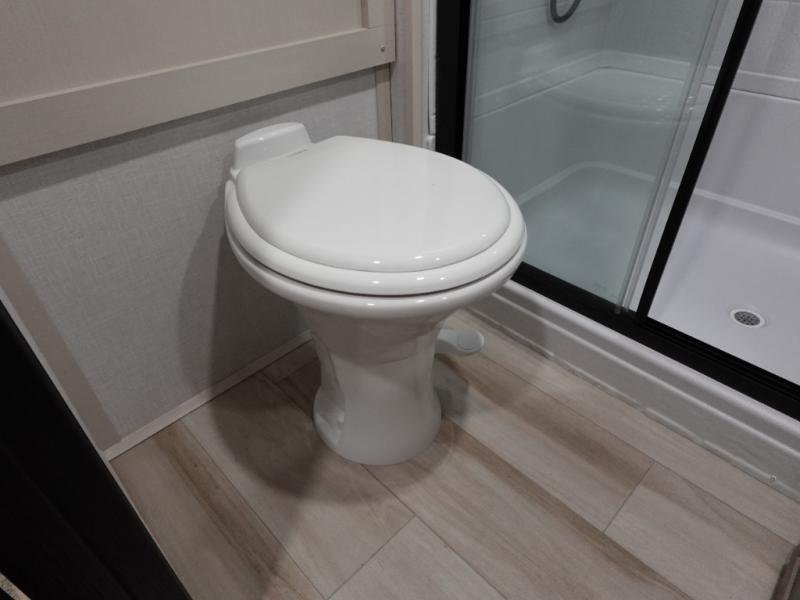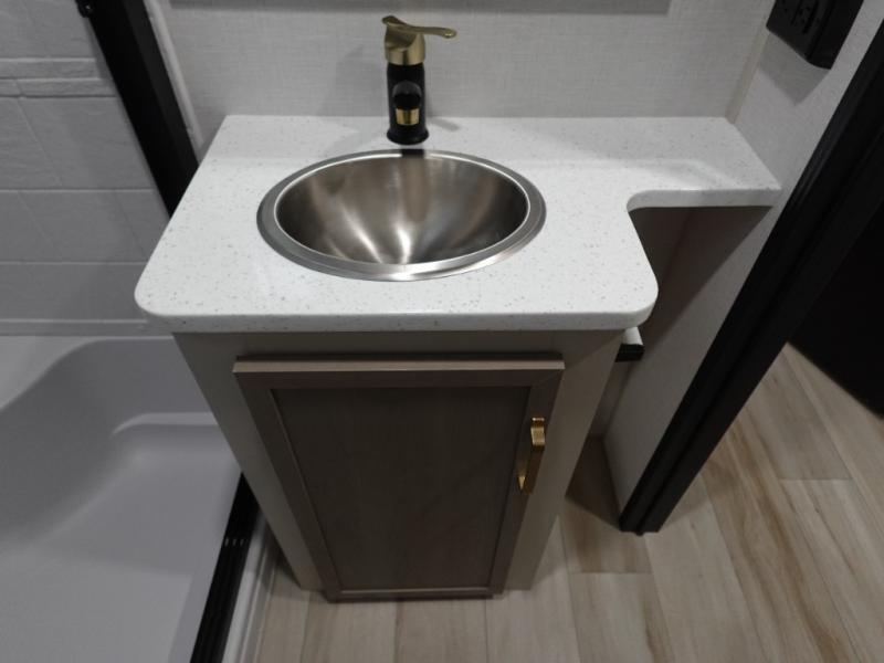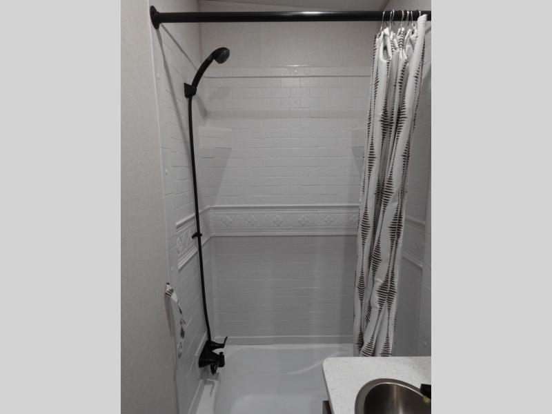 With any Wildwood Heritage Glen fifth wheel by Forest River, the quality construction, attention to detail and design along with a bright and welcoming interior allows you to relax in comfort with conveniences while exploring outdoors. The Summer Wind colored horizontal plank linoleum flooring is unique, beautiful and durable, and there are gold-accented faucets with stainless steel sinks in the bathrooms for added luxury. The Accessibelly underbelly with 12V tank heaters will help protect your unit from the elements, and the power stabilizer jacks and landing gear will make set-up a breeze. More features that provide convenience include the high-end solid surface countertops, an RV Airflow System that provides at least 25% better airflow, and solar prep for off-grid capabilities.