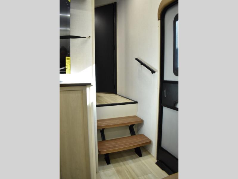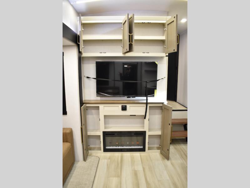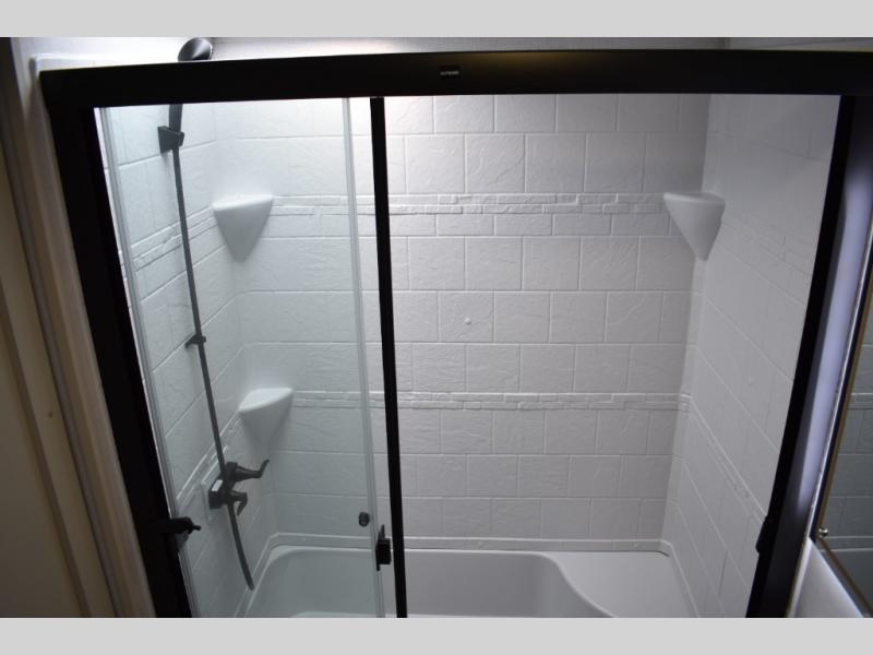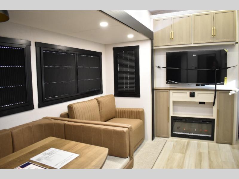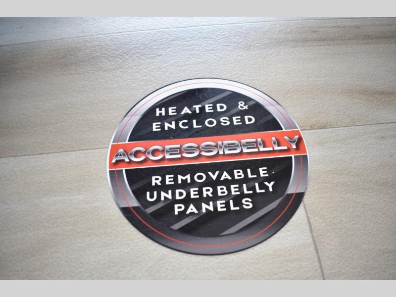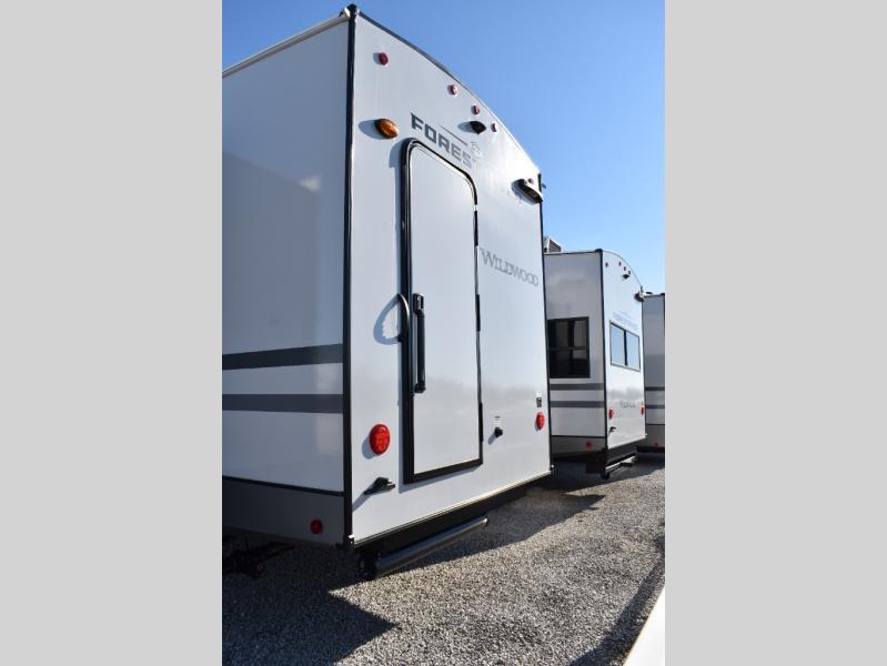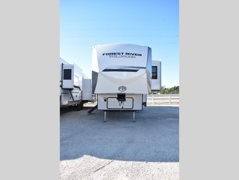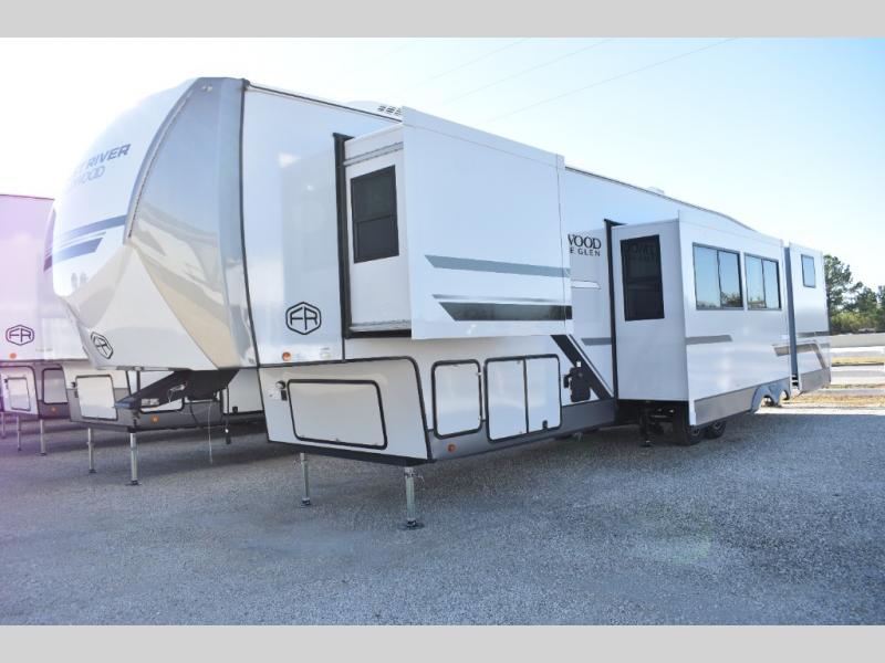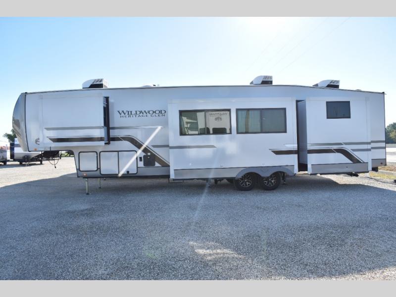 With any Wildwood Heritage Glen fifth wheel by Forest River, the quality construction, attention to detail and design along with a bright and welcoming interior allows you to relax in comfort. You'll love the high-end solid surface countertops included in the Elevated Value Package, along with a JBL sound system, full-length barreled ceilings, and an ultimate interior lighting upgrade. The included Expedition Package features an Accesibelly underbelly panel with 12V tank heaters, nitrogen-filled tires with aluminum rims, and a spacious 30" wide main entry door with a window. The Lippert On-The-Go ladder prep and back-up camera prep let you customize your fifth wheel even more, and the LED awning, front cap, marker and taillights will make it easier than ever to set up camp!