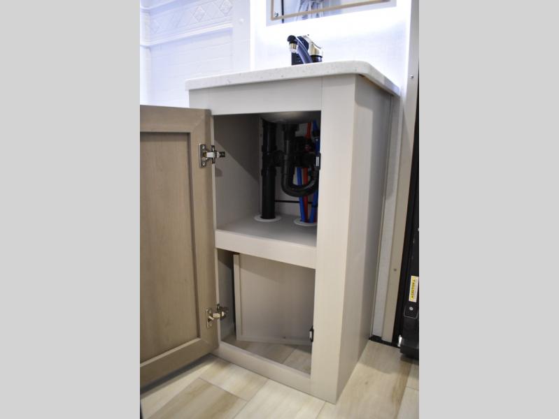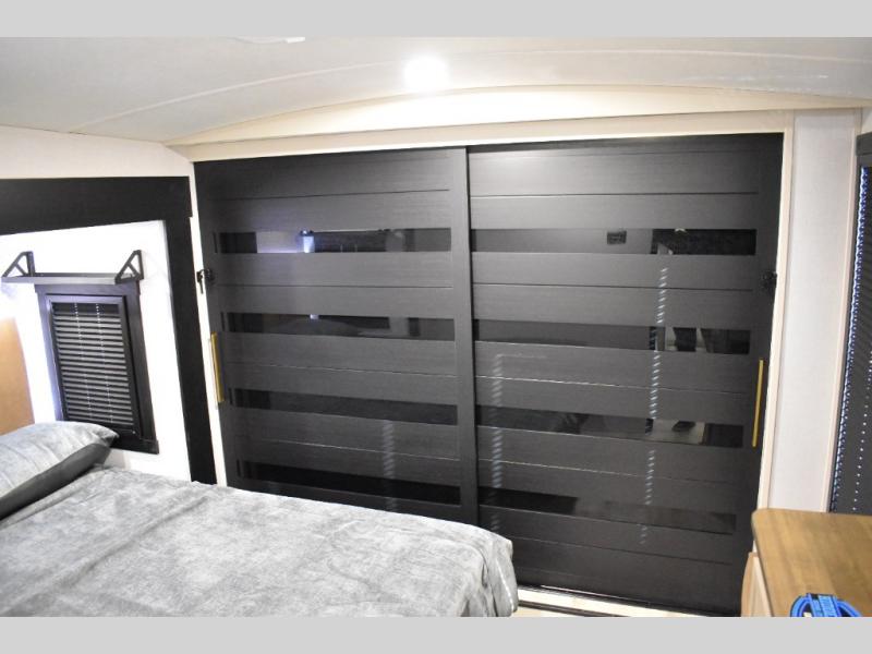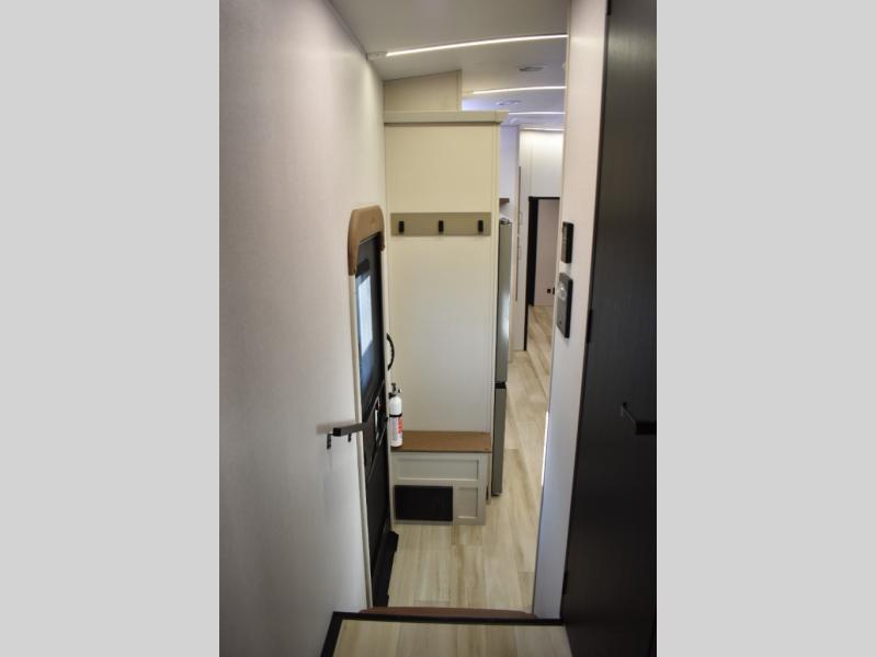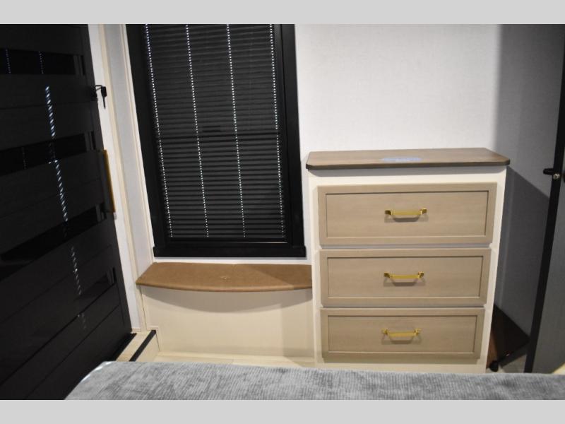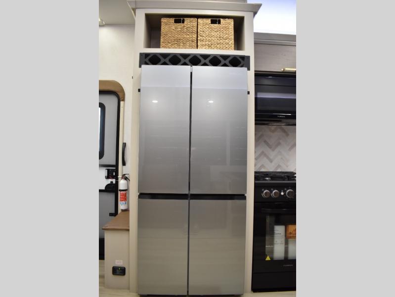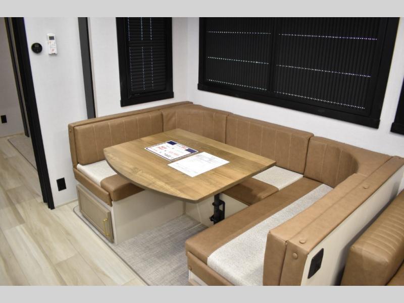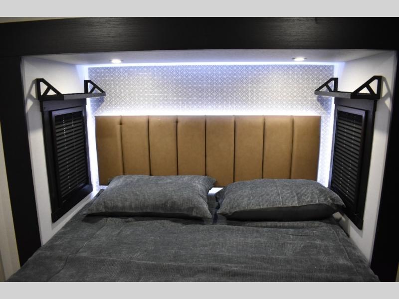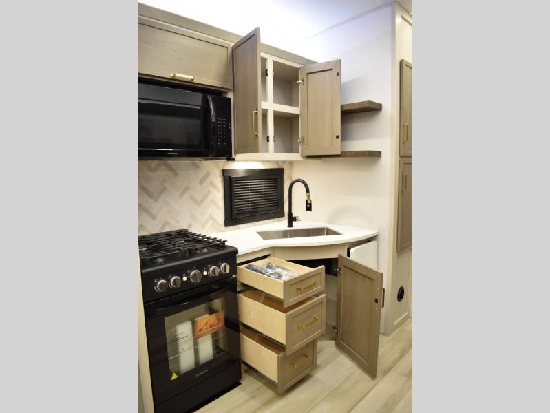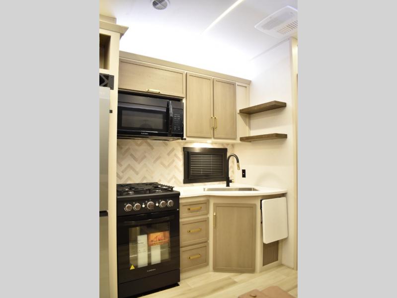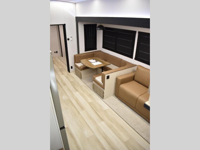 With any Wildwood Heritage Glen fifth wheel by Forest River, the quality construction, attention to detail and design along with a bright and welcoming interior allows you to relax in comfort. You'll love the high-end solid surface countertops included in the Elevated Value Package, along with a JBL sound system, full-length barreled ceilings, and an ultimate interior lighting upgrade. The included Expedition Package features an Accesibelly underbelly panel with 12V tank heaters, nitrogen-filled tires with aluminum rims, and a spacious 30" wide main entry door with a window. The Lippert On-The-Go ladder prep and back-up camera prep let you customize your fifth wheel even more, and the LED awning, front cap, marker and taillights will make it easier than ever to set up camp!