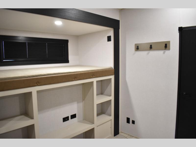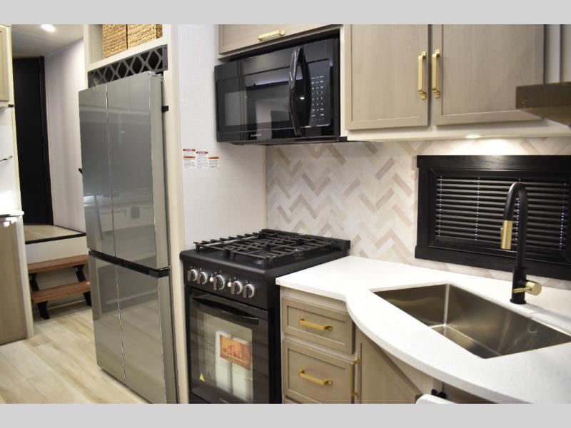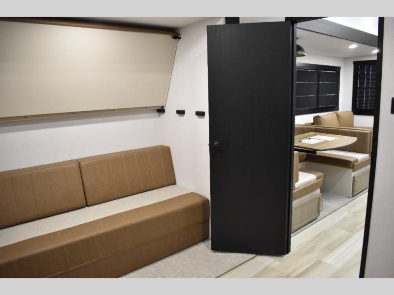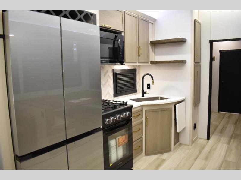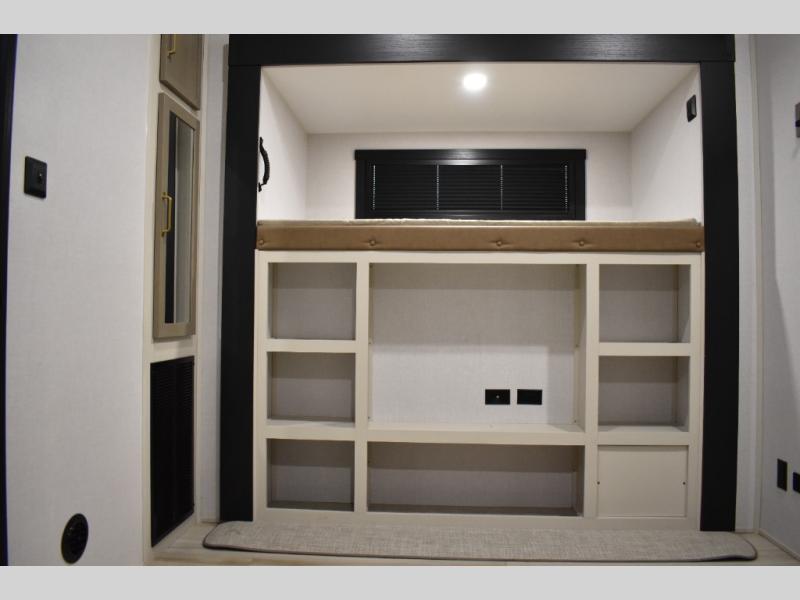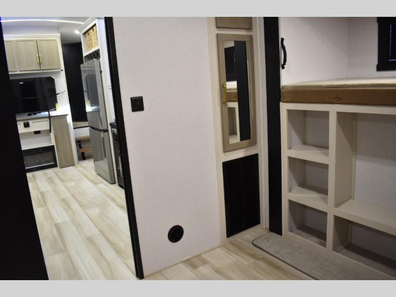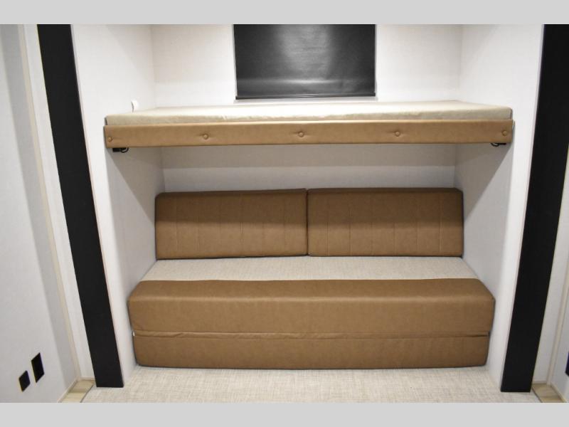 Not all fifth wheels are alike, and once you own this Wildwood Heritage Glen, you will understand! The rear entry into the second full bathroom allows the kids or your friends to enter and exit quickly to get back outside to the fun. They will also be able to shower and then enter their private bunkhouse that has two bunks, a convertible sofa bed, and two slides that offer lots of floor space to play. You will have your own oasis on the opposite side in the front private bedroom that has a custom king bed, a full-width wardrobe, and washer and dryer prep. The other full bathroom is only steps away from the main entrance and living area. The inside kitchen offers even more amenities, and the fourth slide provides a family U-shaped dinette and tri-fold sofa.