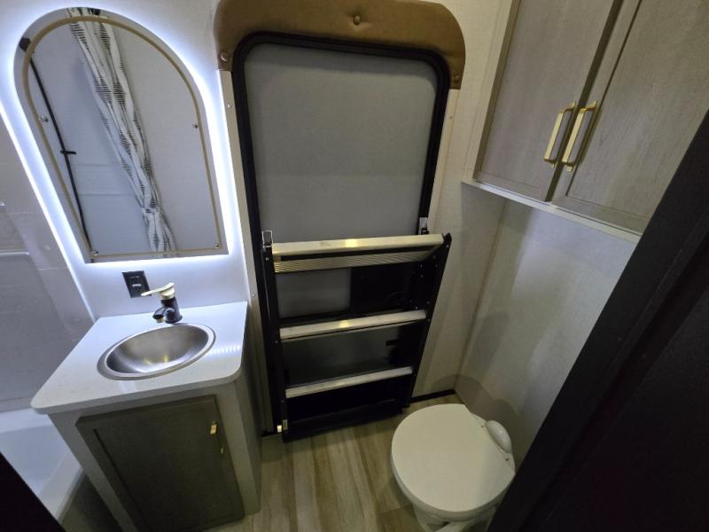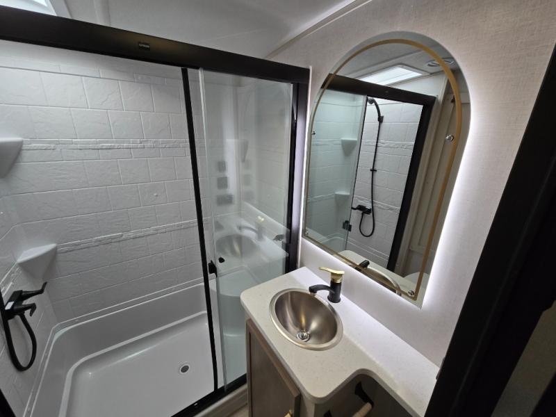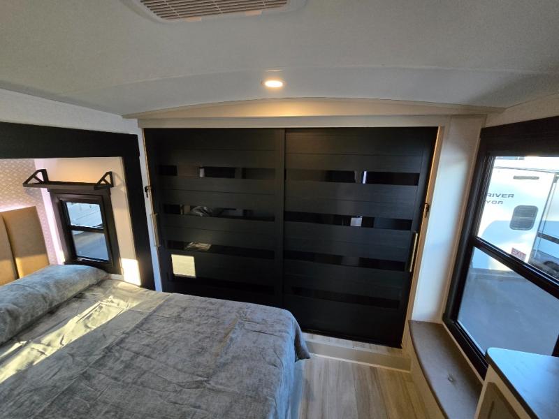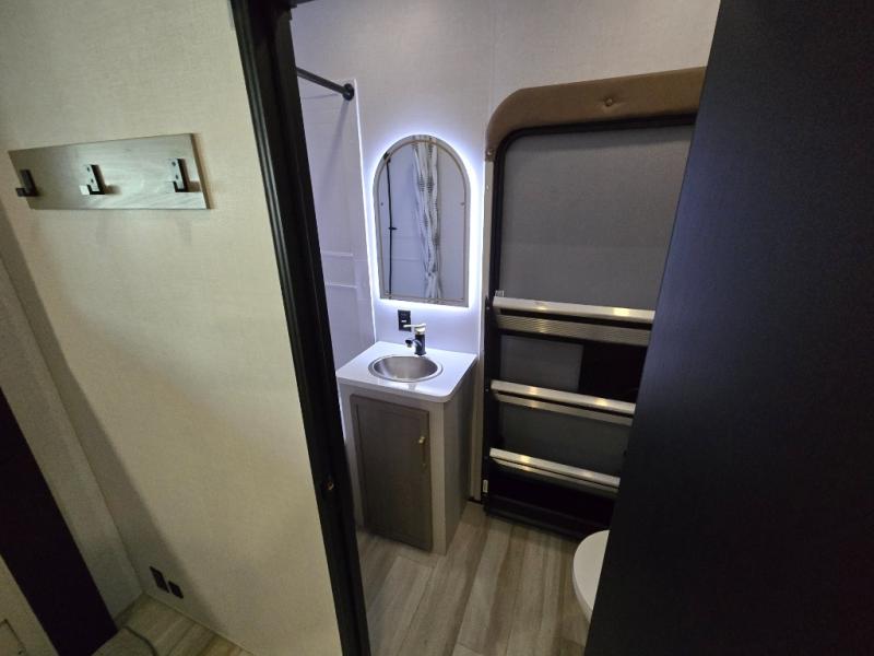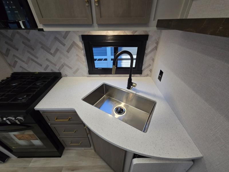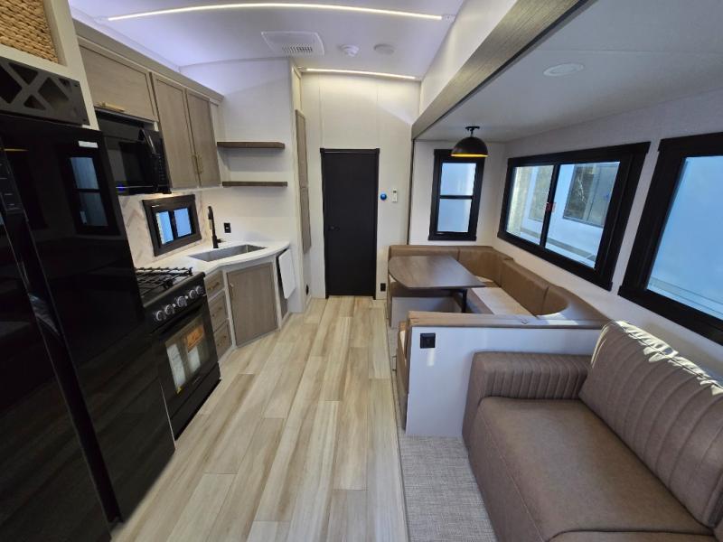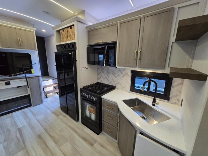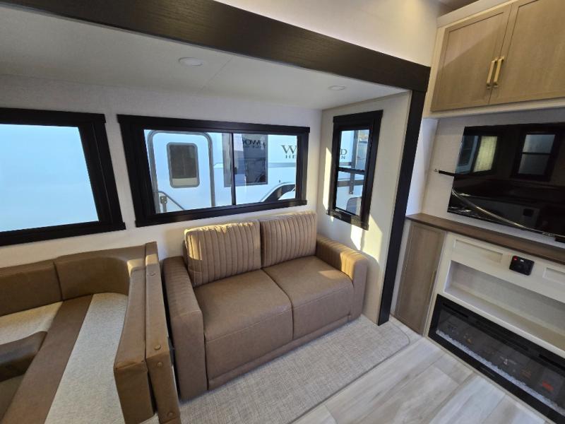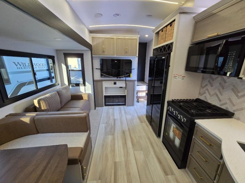 With any Wildwood Heritage Glen fifth wheel by Forest River, the quality construction, attention to detail and design along with a bright and welcoming interior allows you to relax in comfort. You'll love the high-end solid surface countertops included in the Elevated Value Package, along with a JBL sound system, full-length barreled ceilings, and an ultimate interior lighting upgrade. The included Expedition Package features an Accesibelly underbelly panel with 12V tank heaters, nitrogen-filled tires with aluminum rims, and a spacious 30" wide main entry door with a window. The Lippert On-The-Go ladder prep and back-up camera prep let you customize your fifth wheel even more, and the LED awning, front cap, marker and taillights will make it easier than ever to set up camp!