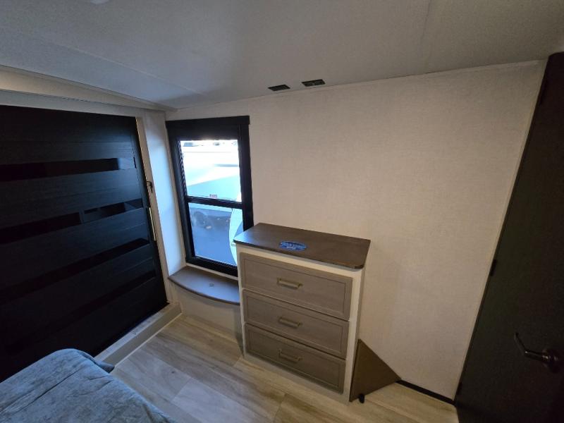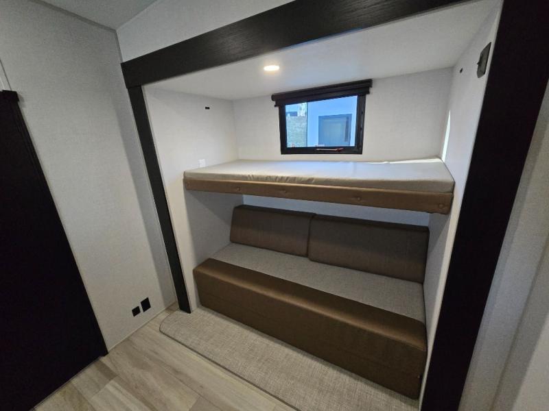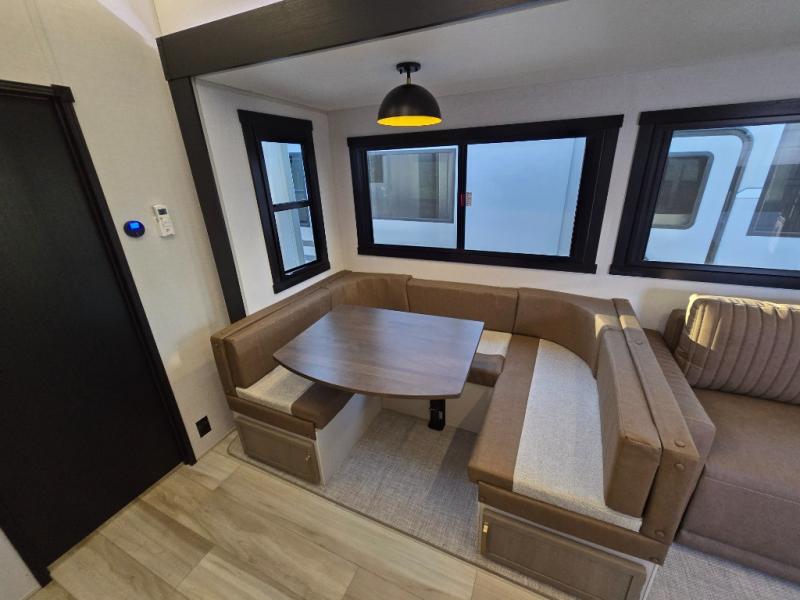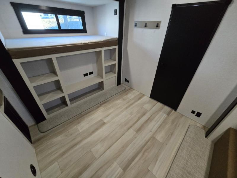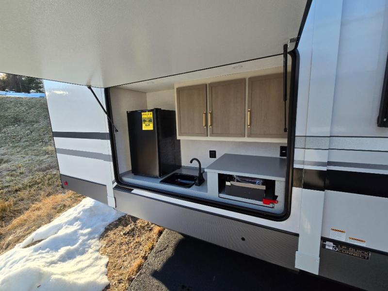 Not all fifth wheels are alike, and once you own this Wildwood Heritage Glen, you will understand! The rear entry into the second full bathroom allows the kids or your friends to enter and exit quickly to get back outside to the fun. They will also be able to shower and then enter their private bunkhouse that has two bunks, a convertible sofa bed, and two slides that offer lots of floor space to play. You will have your own oasis on the opposite side in the front private bedroom that has a custom king bed, a full-width wardrobe, and washer and dryer prep. The other full bathroom is only steps away from the main entrance and living area. The inside kitchen offers even more amenities, and the fourth slide provides a family U-shaped dinette and tri-fold sofa.