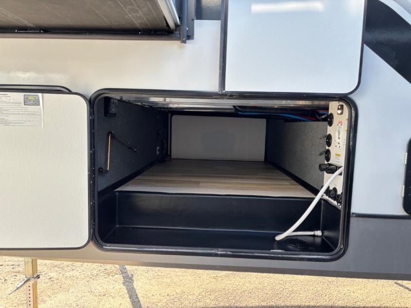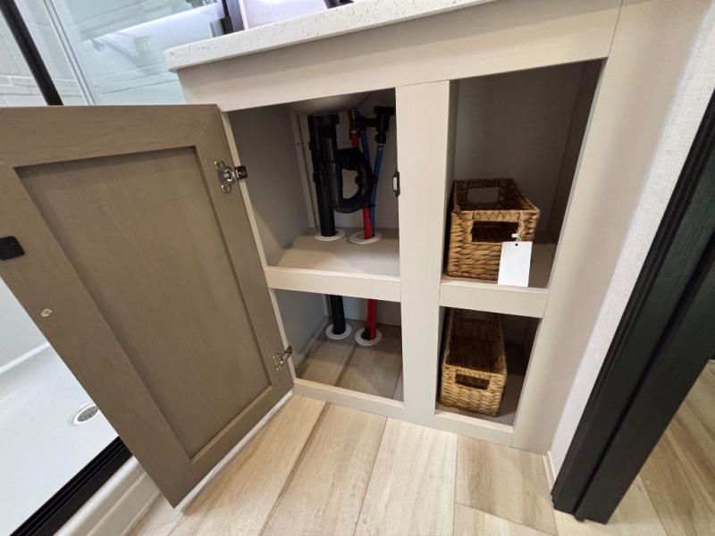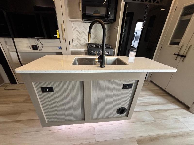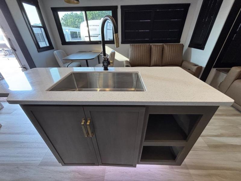 With any Wildwood Heritage Glen fifth wheel by Forest River, the quality construction, attention to detail and design along with a bright and welcoming interior allows you to relax in comfort with conveniences while exploring outdoors. The Summer Wind colored horizontal plank linoleum flooring is unique, beautiful and durable, and there are gold-accented faucets with stainless steel sinks in the bathrooms for added luxury. The Accessibelly underbelly with 12V tank heaters will help protect your unit from the elements, and the power stabilizer jacks and landing gear will make set-up a breeze. More features that provide convenience include the high-end solid surface countertops, an RV Airflow System that provides at least 25% better airflow, and solar prep for off-grid capabilities.