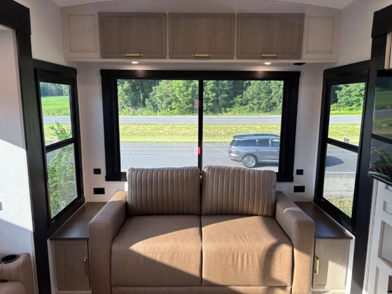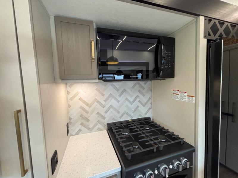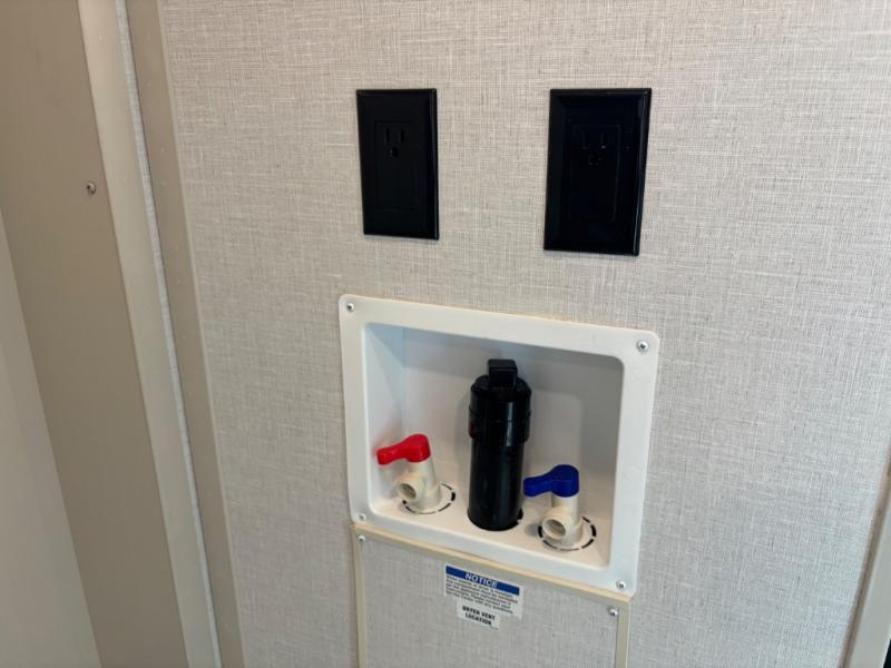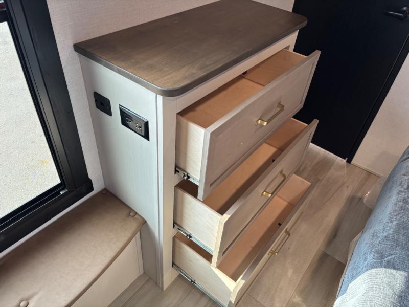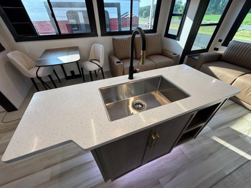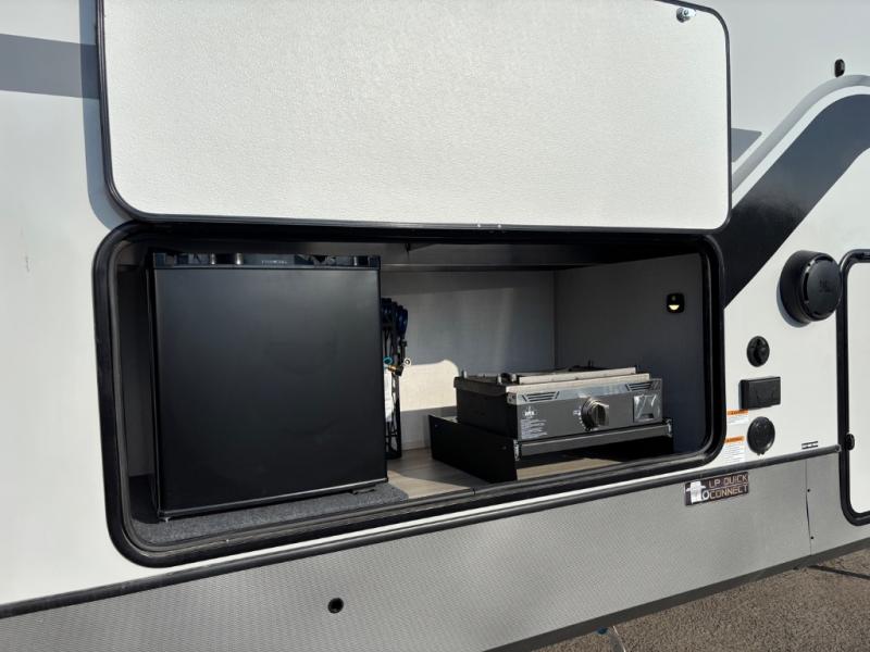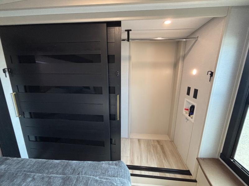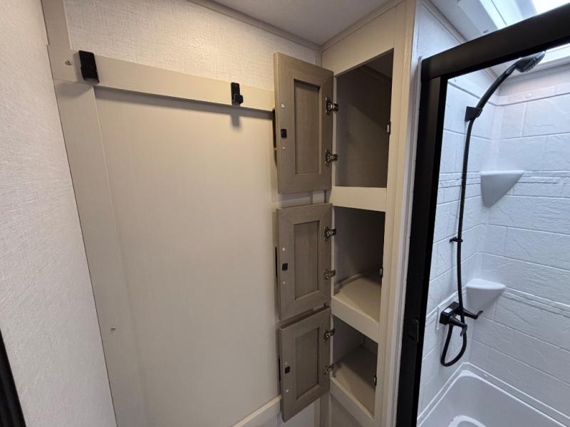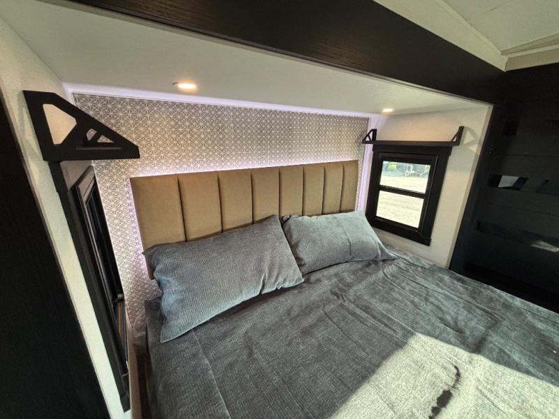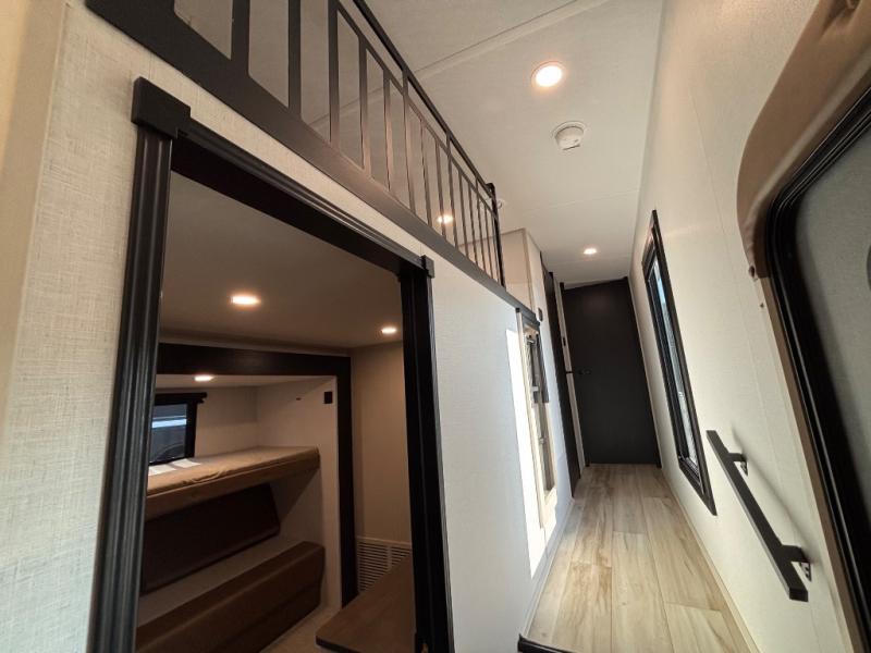 Imagine having your own master bedroom with a custom king bed, a full-width wardrobe, plus washer and dryer prep in this Wildwood Heritage Glen fifth wheel. You might even use the bench to put on your slippers before heading to the bathroom to get cleaned up in the residential walk-in shower. Your kids or friends can sleep in the middle bunkhouse that has a flip-up bunk, a Versa queen convertible sofa bed, and a loft above. You might also utilize this room as an office thanks to the desk. The chef will love all the appliances, the kitchen island, the deluxe French door pantry, and the 16 cu. ft. 12V refrigerator. There is also plenty of seating on all the furniture, and the cupholders in the theatre seats are handy.