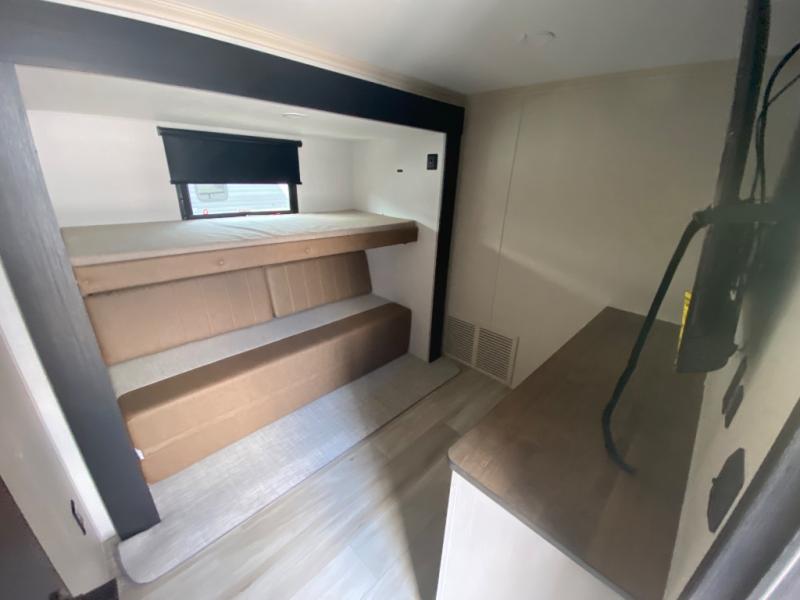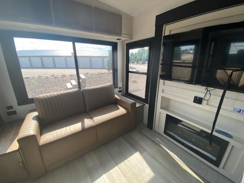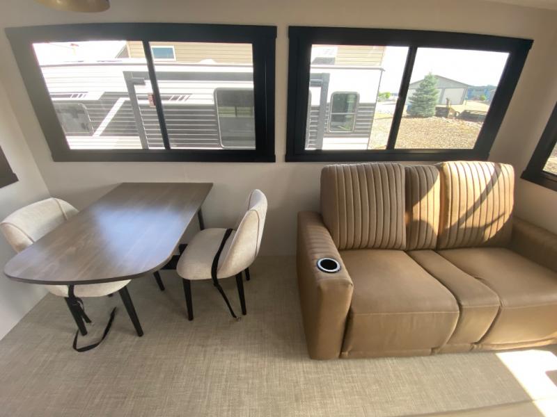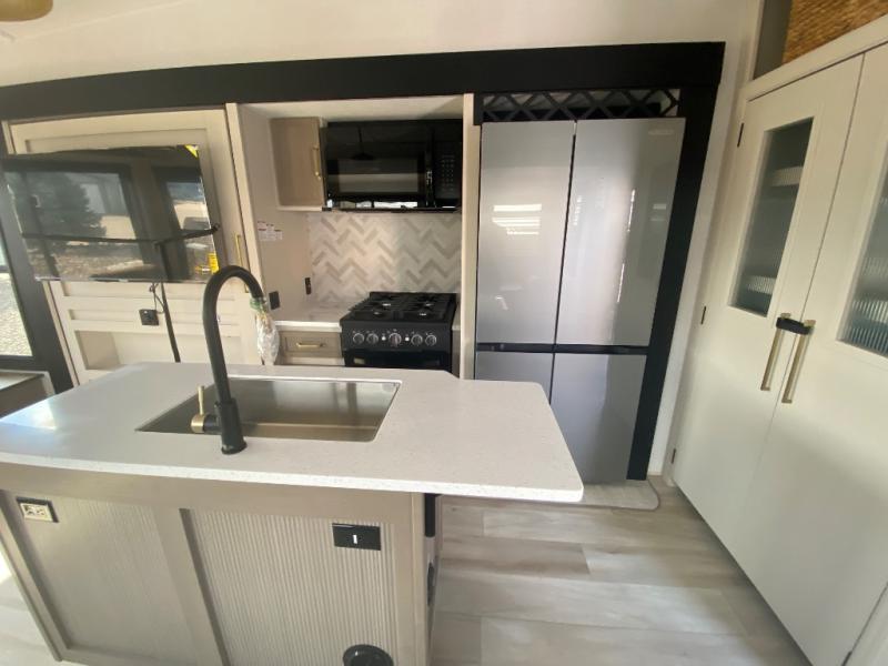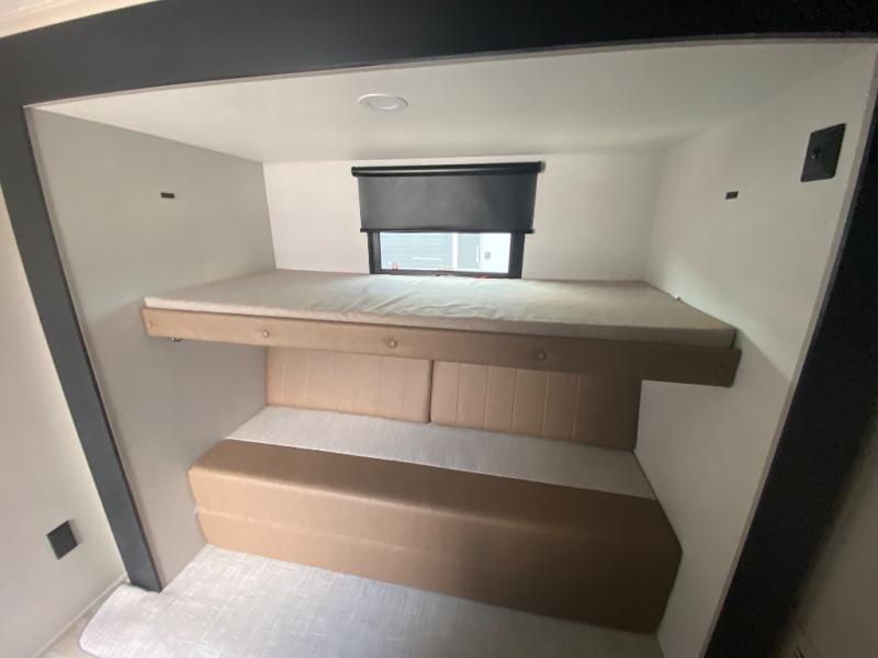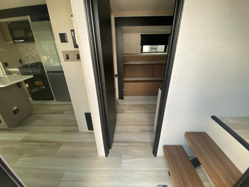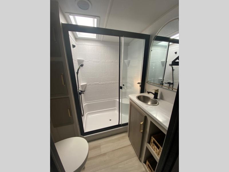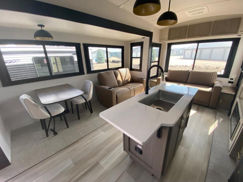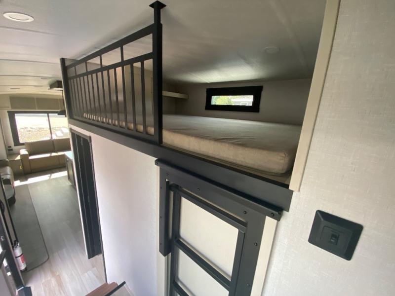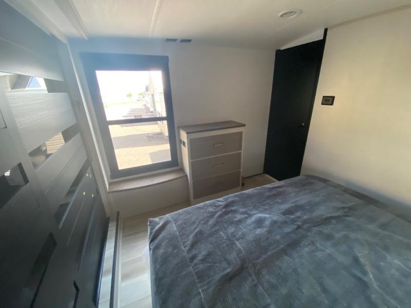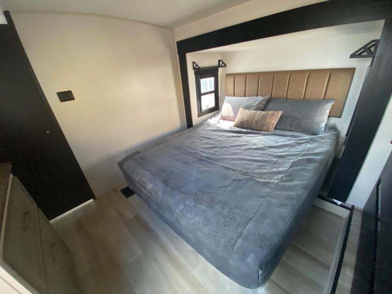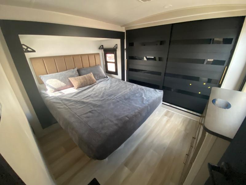 Imagine having your own master bedroom with a custom king bed, a full-width wardrobe, plus washer and dryer prep in this Wildwood Heritage Glen fifth wheel. You might even use the bench to put on your slippers before heading to the bathroom to get cleaned up in the residential walk-in shower. Your kids or friends can sleep in the middle bunkhouse that has a flip-up bunk, a Versa queen convertible sofa bed, and a loft above. You might also utilize this room as an office thanks to the desk. The chef will love all the appliances, the kitchen island, the deluxe French door pantry, and the 16 cu. ft. 12V refrigerator. There is also plenty of seating on all the furniture, and the cupholders in the theatre seats are handy.