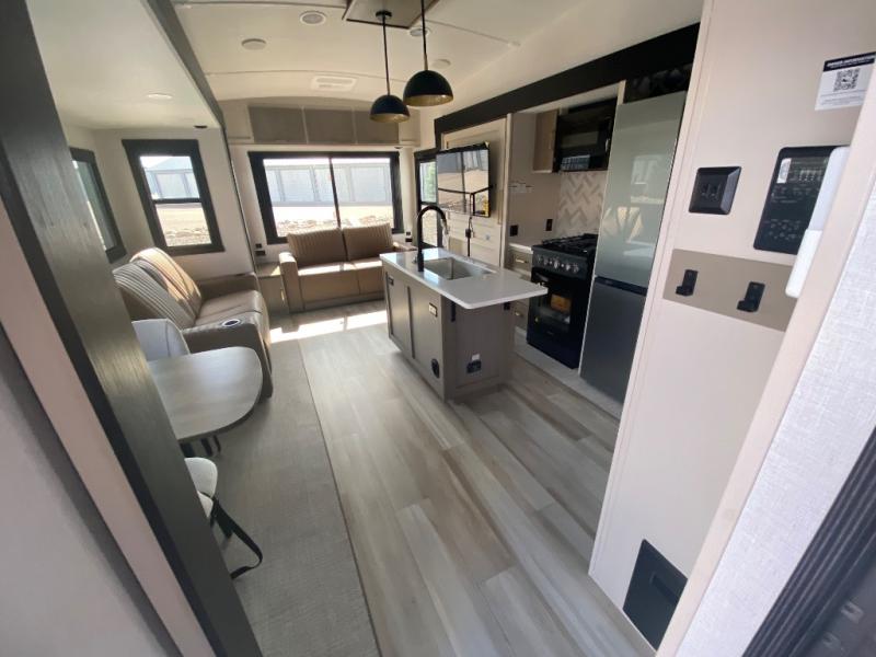 With any Wildwood Heritage Glen fifth wheel by Forest River, the quality construction, attention to detail and design along with a bright and welcoming interior allows you to relax in comfort with conveniences while exploring outdoors. The Summer Wind colored horizontal plank linoleum flooring is unique, beautiful and durable, and there are gold-accented faucets with stainless steel sinks in the bathrooms for added luxury. The Accessibelly underbelly with 12V tank heaters will help protect your unit from the elements, and the power stabilizer jacks and landing gear will make set-up a breeze. More features that provide convenience include the high-end solid surface countertops, an RV Airflow System that provides at least 25% better airflow, and solar prep for off-grid capabilities.