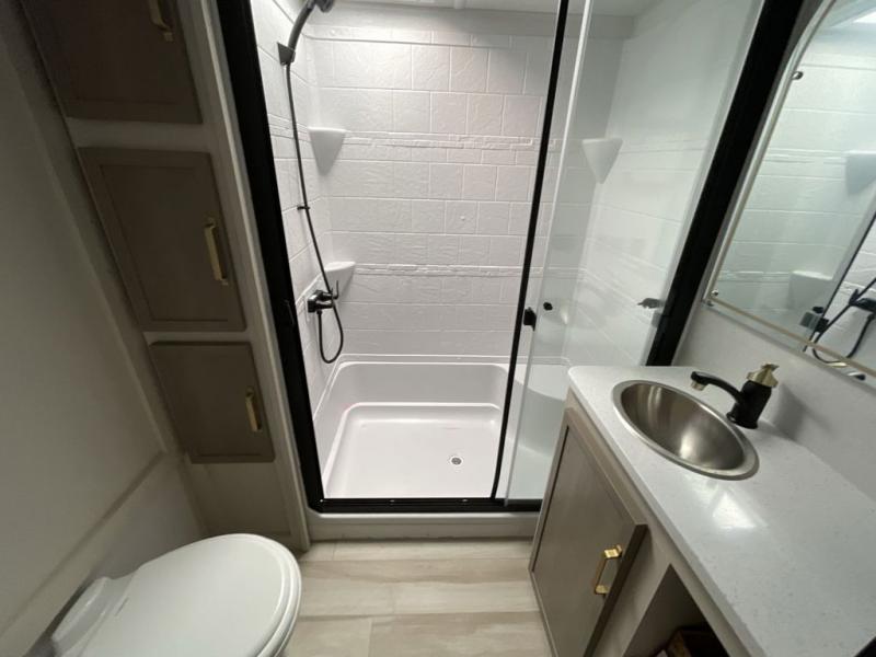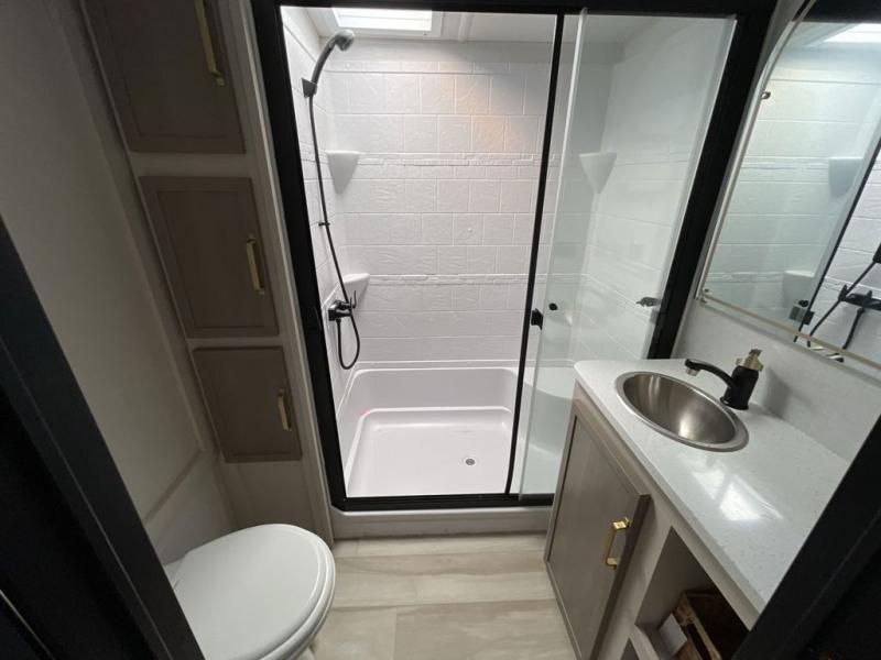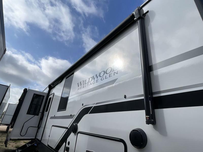 With any Wildwood Heritage Glen fifth wheel by Forest River, the quality construction, attention to detail and design along with a bright and welcoming interior allows you to relax in comfort with conveniences while exploring outdoors. The Summer Wind colored horizontal plank linoleum flooring is unique, beautiful and durable, and there are gold-accented faucets with stainless steel sinks in the bathrooms for added luxury. The Accessibelly underbelly with 12V tank heaters will help protect your unit from the elements, and the power stabilizer jacks and landing gear will make set-up a breeze. More features that provide convenience include the high-end solid surface countertops, an RV Airflow System that provides at least 25% better airflow, and solar prep for off-grid capabilities.