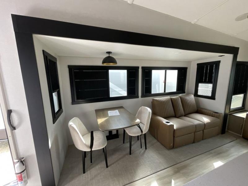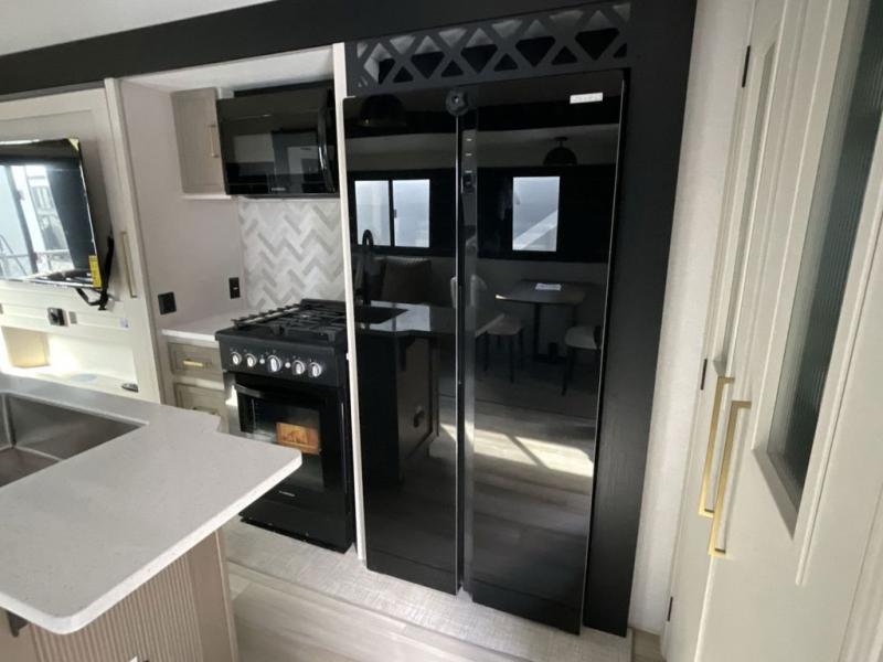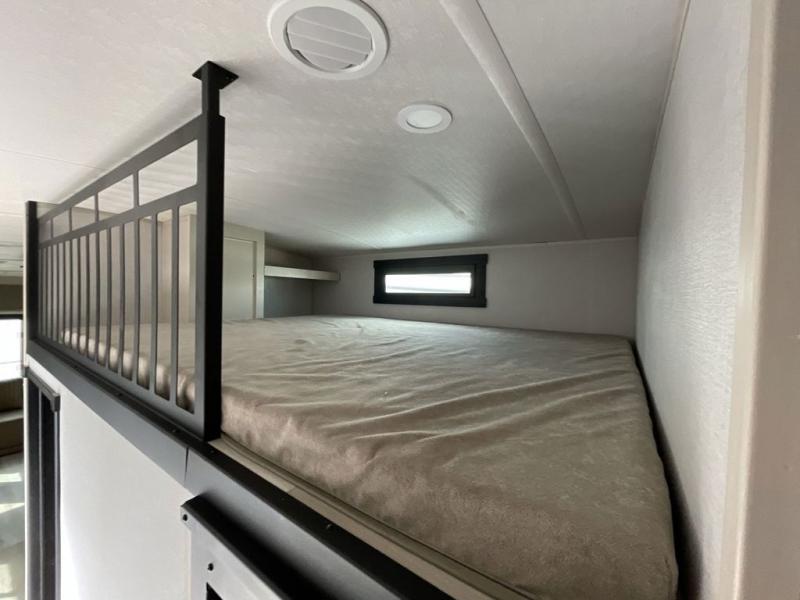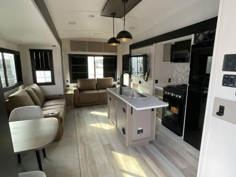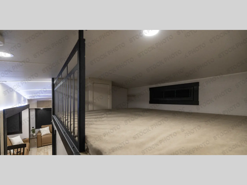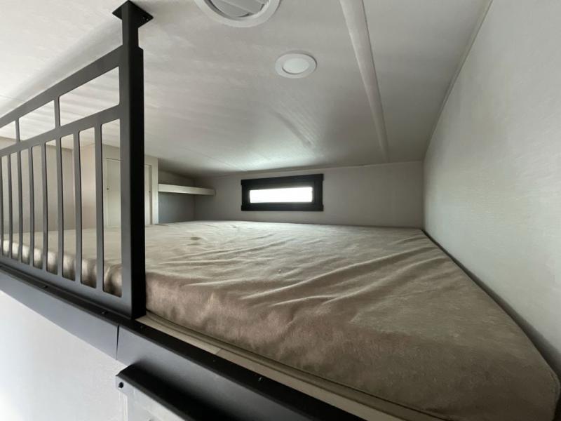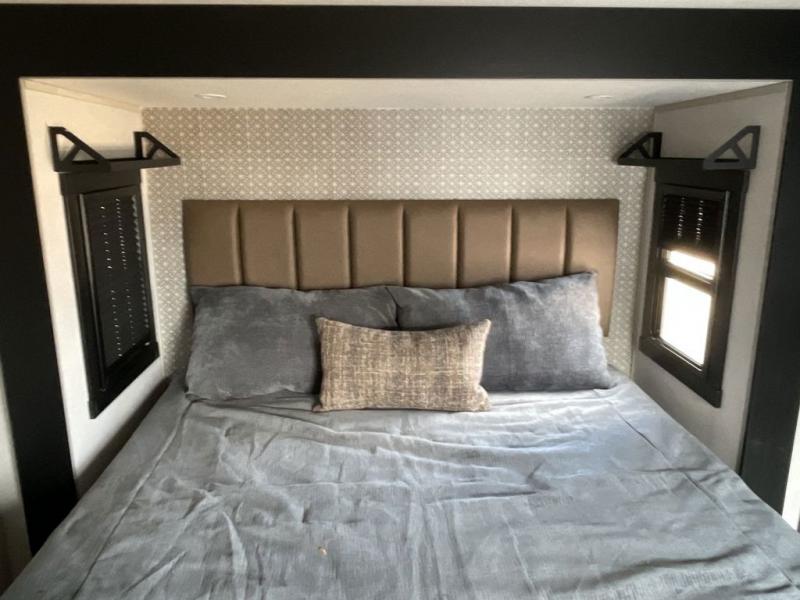 Imagine having your own master bedroom with a custom king bed, a full-width wardrobe, plus washer and dryer prep in this Wildwood Heritage Glen fifth wheel. You might even use the bench to put on your slippers before heading to the bathroom to get cleaned up in the residential walk-in shower. Your kids or friends can sleep in the middle bunkhouse that has a flip-up bunk, a Versa queen convertible sofa bed, and a loft above. You might also utilize this room as an office thanks to the desk. The chef will love all the appliances, the kitchen island, the deluxe French door pantry, and the 16 cu. ft. 12V refrigerator. There is also plenty of seating on all the furniture, and the cupholders in the theatre seats are handy.