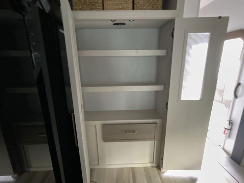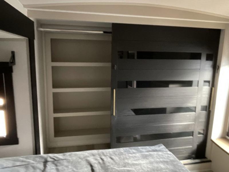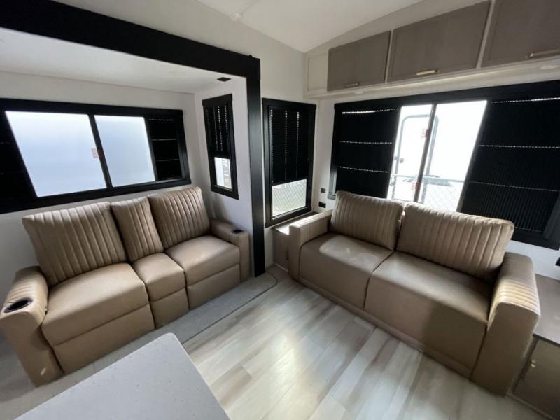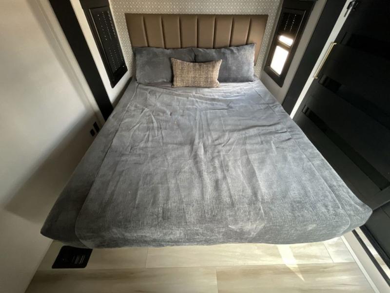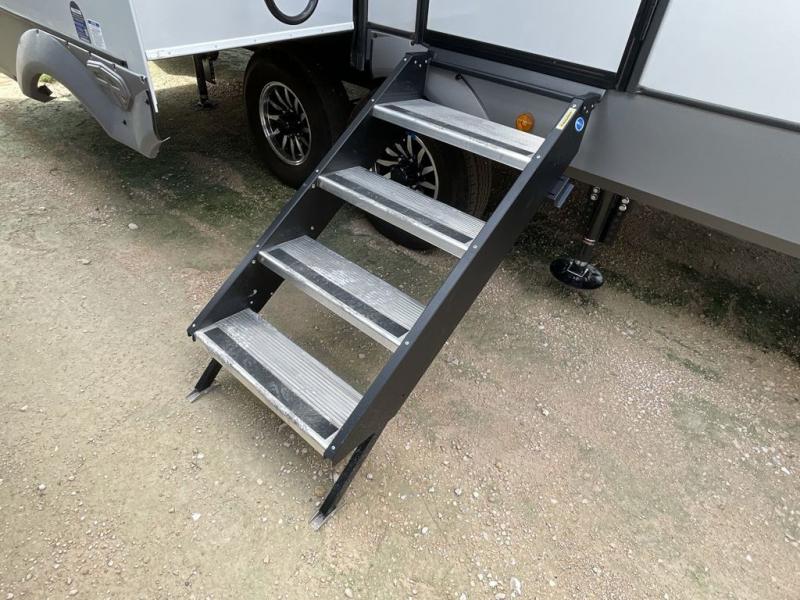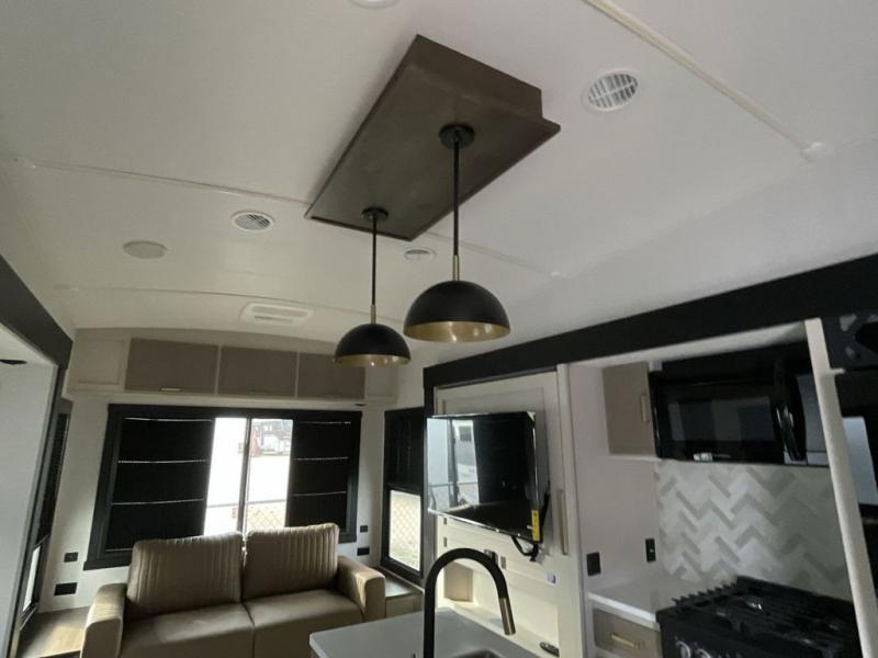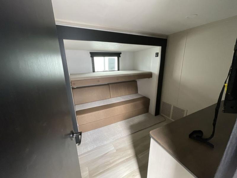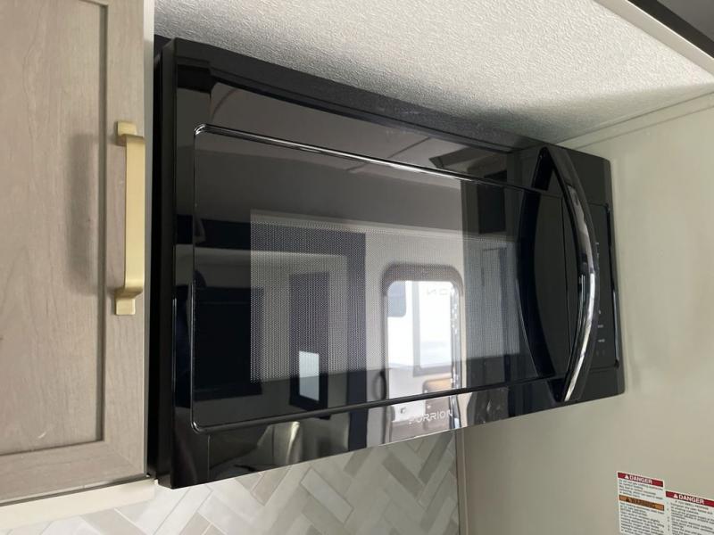 Imagine having your own master bedroom with a custom king bed, a full-width wardrobe, plus washer and dryer prep in this Wildwood Heritage Glen fifth wheel. You might even use the bench to put on your slippers before heading to the bathroom to get cleaned up in the residential walk-in shower. Your kids or friends can sleep in the middle bunkhouse that has a flip-up bunk, a Versa queen convertible sofa bed, and a loft above. You might also utilize this room as an office thanks to the desk. The chef will love all the appliances, the kitchen island, the deluxe French door pantry, and the 16 cu. ft. 12V refrigerator. There is also plenty of seating on all the furniture, and the cupholders in the theatre seats are handy.