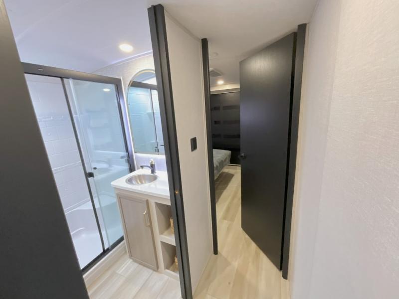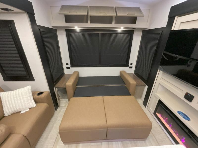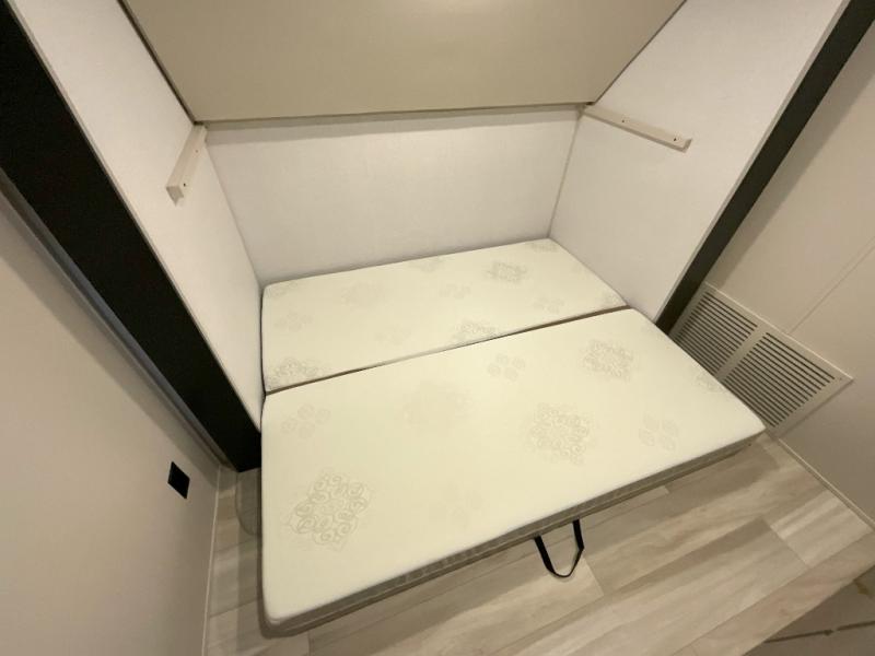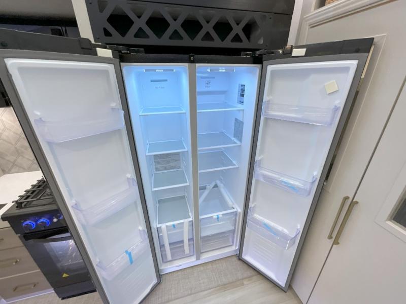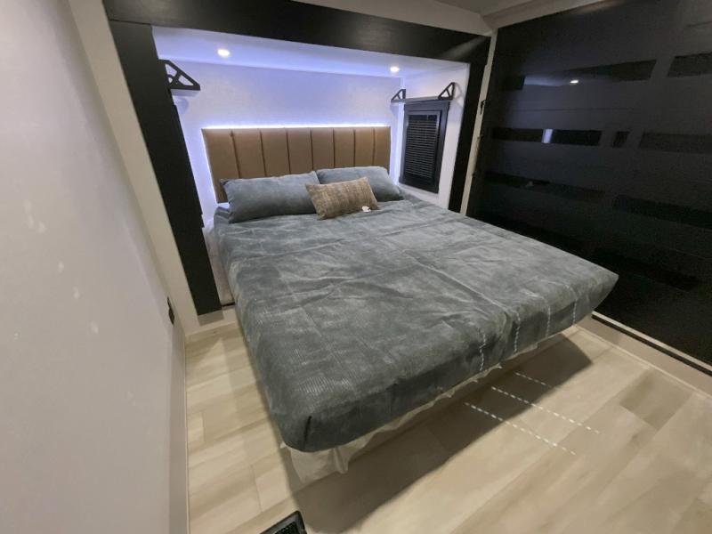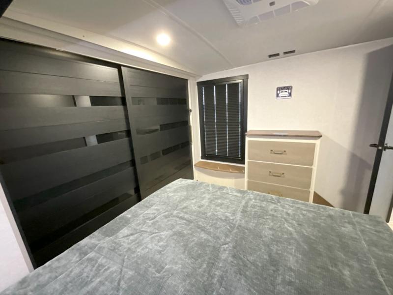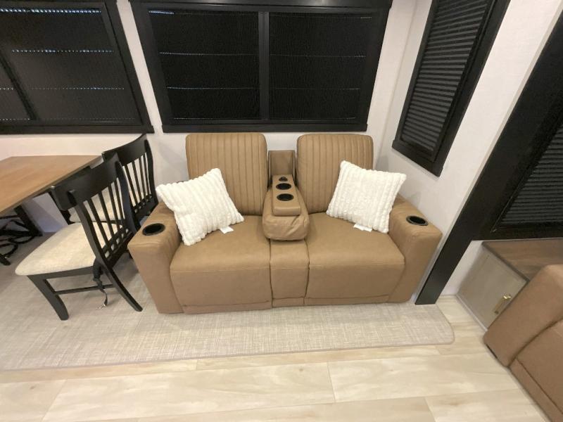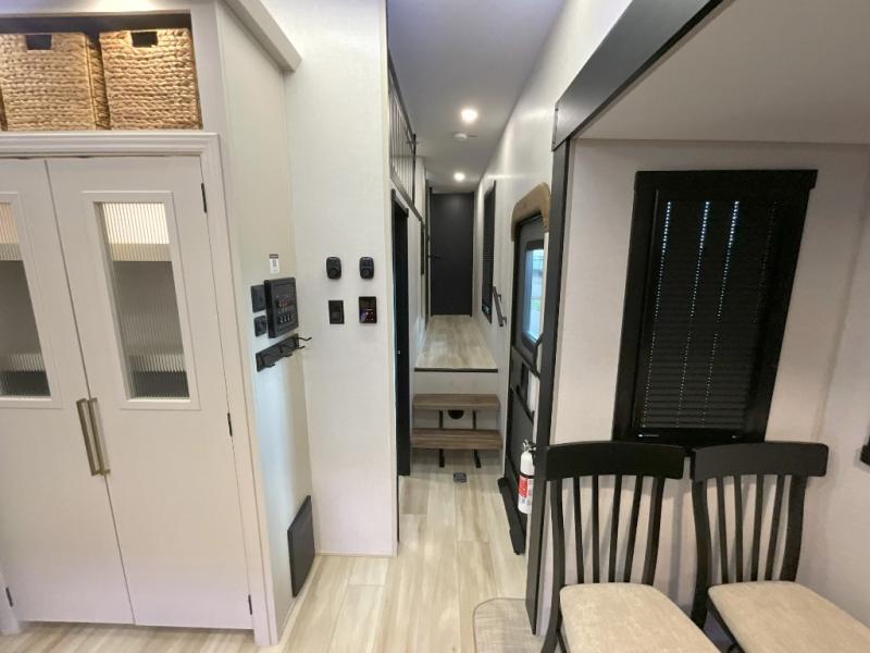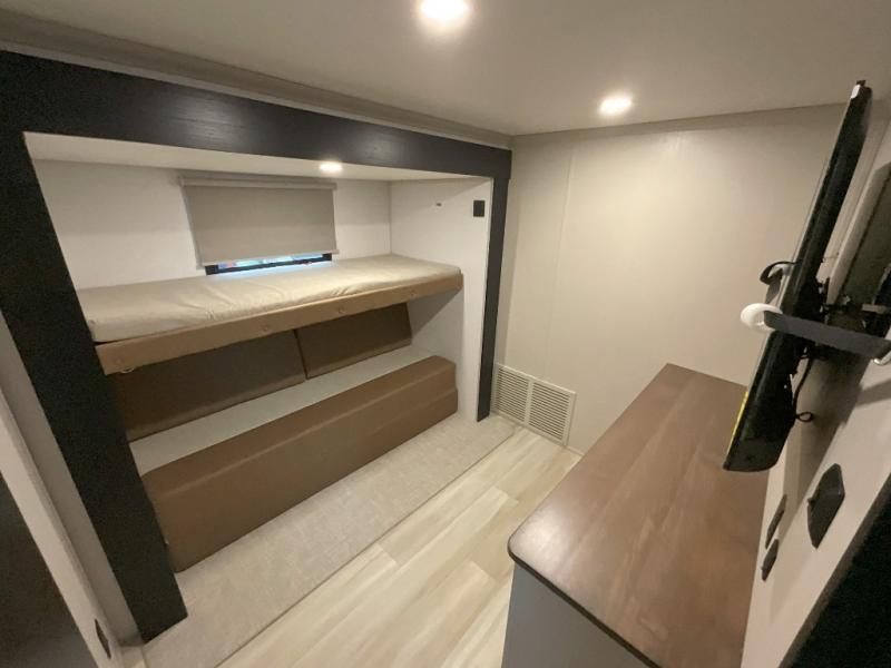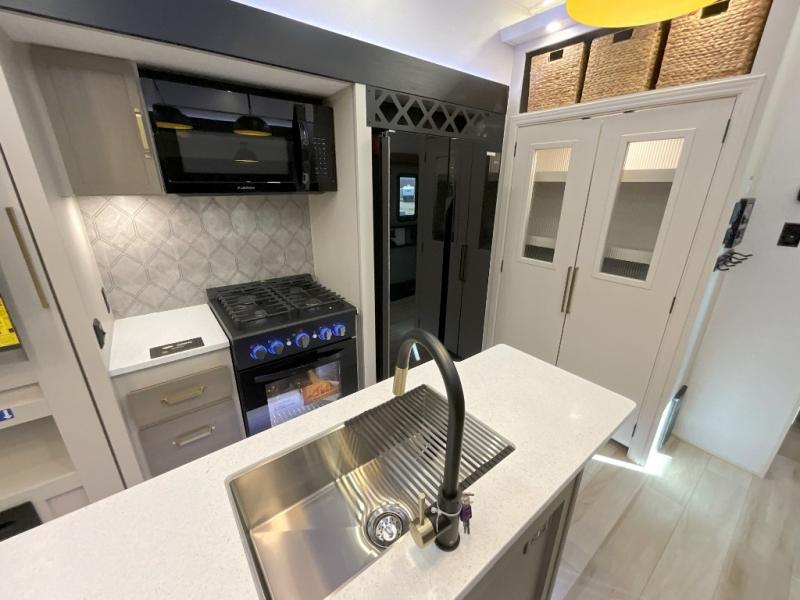Imagine having your own master bedroom with a custom king bed, a full-width wardrobe, plus washer and dryer prep in this Wildwood Heritage Glen fifth wheel. You might even use the bench to put on your slippers before heading to the bathroom to get cleaned up in the residential walk-in shower. Your kids or friends can sleep in the middle bunkhouse that has a flip-up bunk, a Versa queen convertible sofa bed, and a loft above. You might also utilize this room as an office thanks to the desk. The chef will love all the appliances, the kitchen island, the deluxe French door pantry, and the 16-cu. ft. 12V refrigerator. There is also plenty of seating on all the furniture, and the cupholders in the theatre seats are handy.