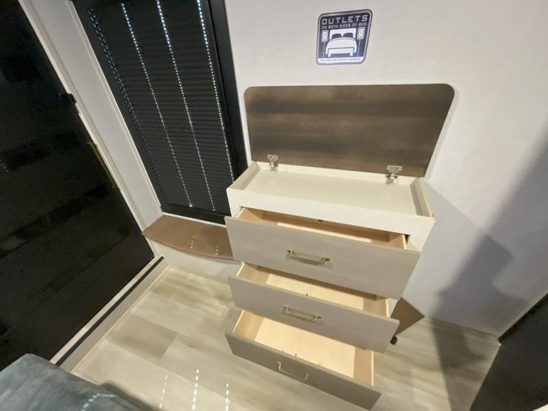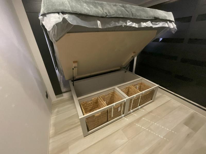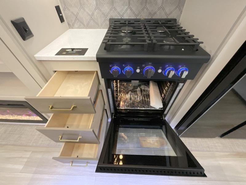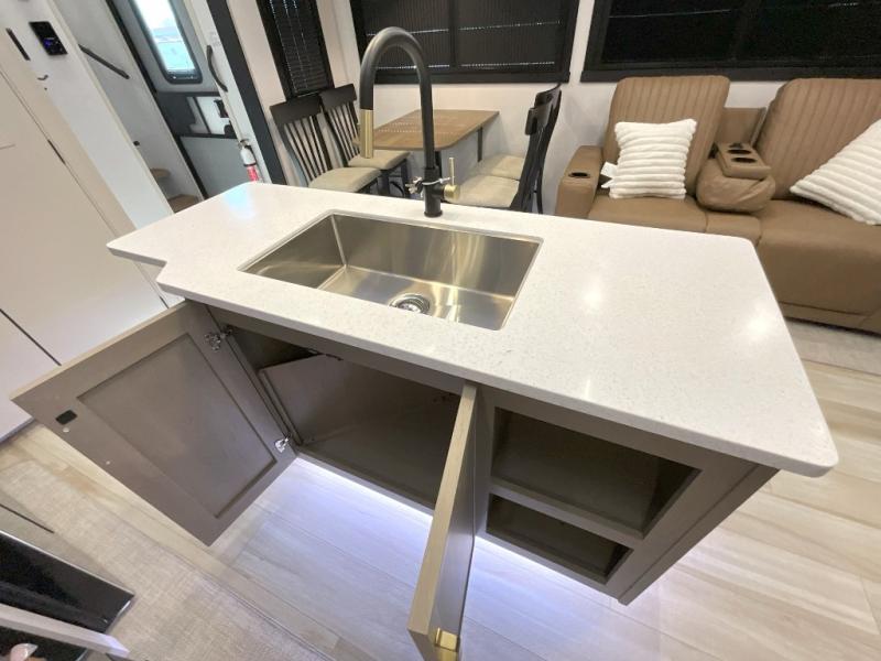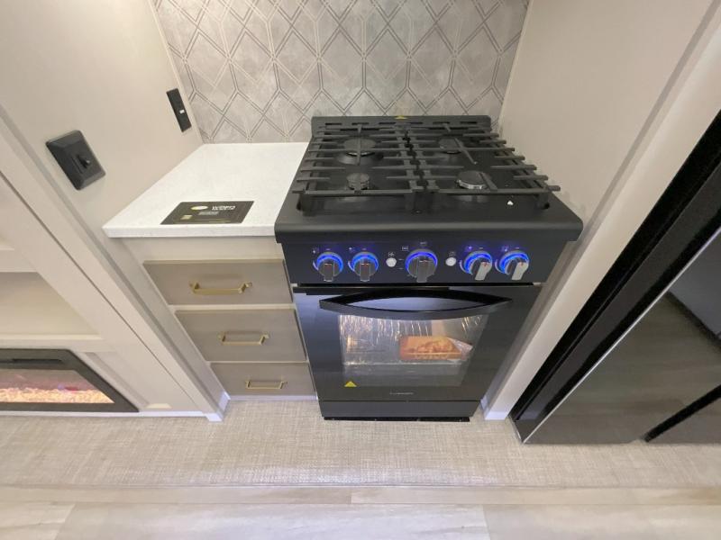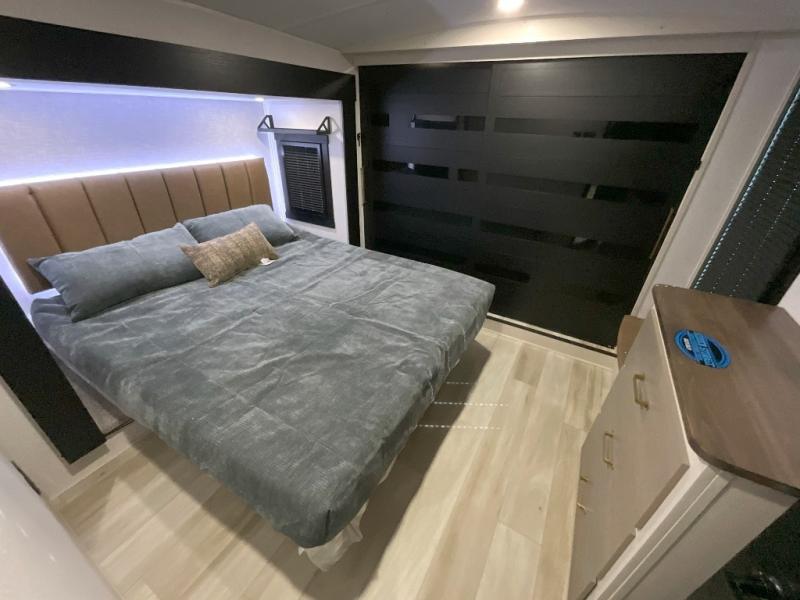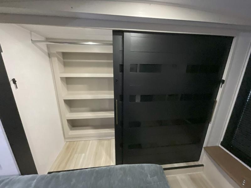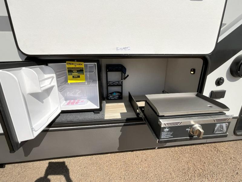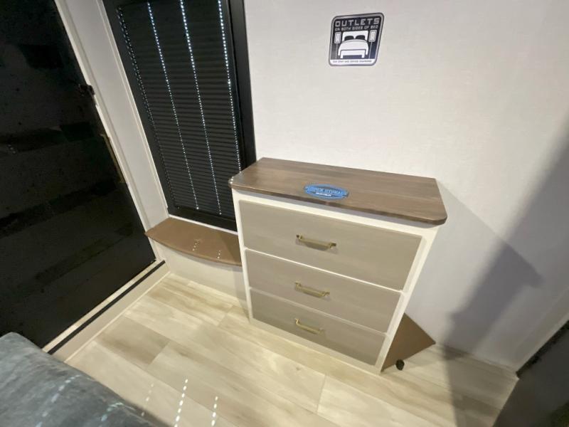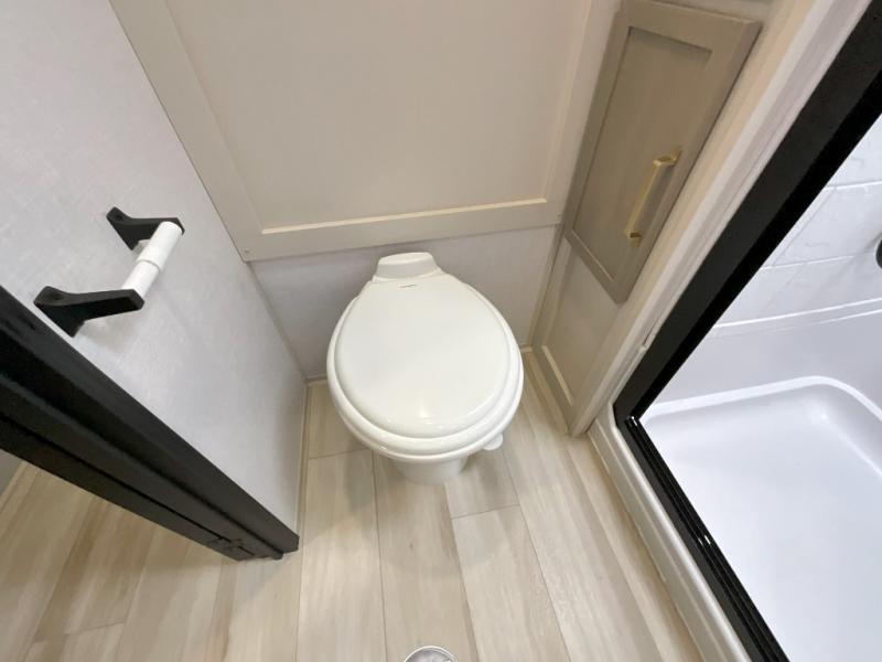 Imagine having your own master bedroom with a custom king bed, a full-width wardrobe, plus washer and dryer prep in this Wildwood Heritage Glen fifth wheel. You might even use the bench to put on your slippers before heading to the bathroom to get cleaned up in the residential walk-in shower. Your kids or friends can sleep in the middle bunkhouse that has a flip-up bunk, a Versa queen convertible sofa bed, and a loft above. You might also utilize this room as an office thanks to the desk. The chef will love all the appliances, the kitchen island, the deluxe French door pantry, and the 16-cu. ft. 12V refrigerator. There is also plenty of seating on all the furniture, and the cupholders in the theatre seats are handy.