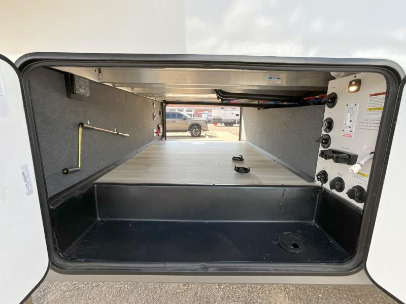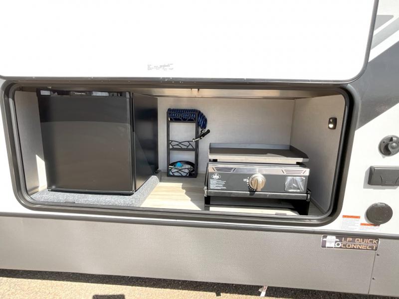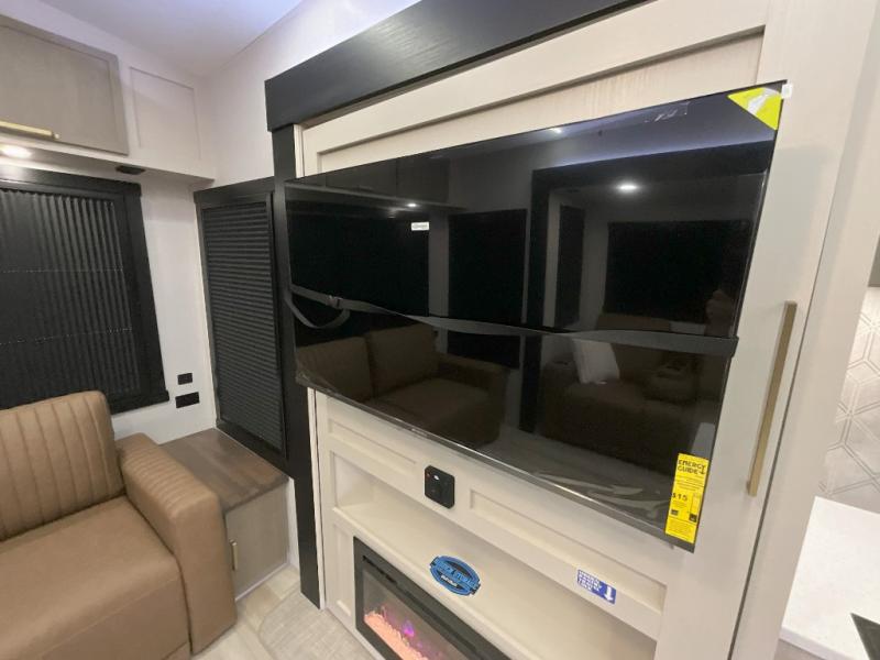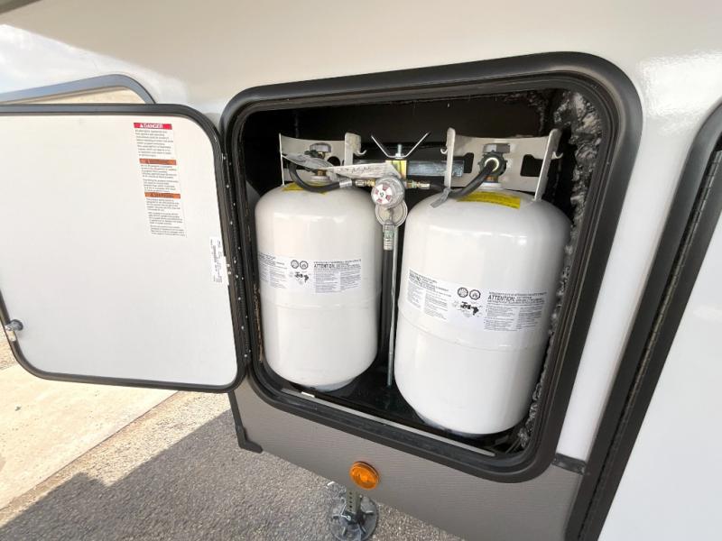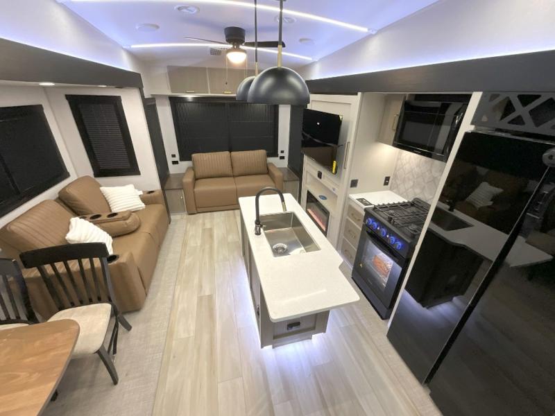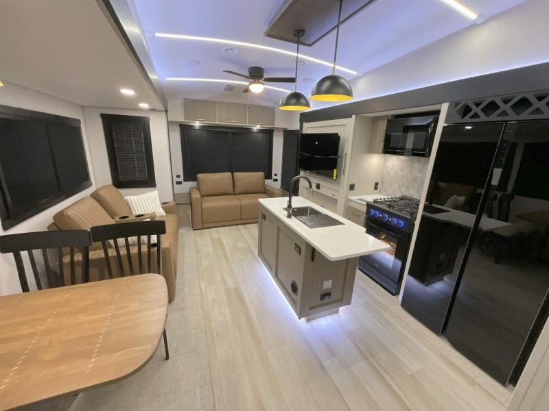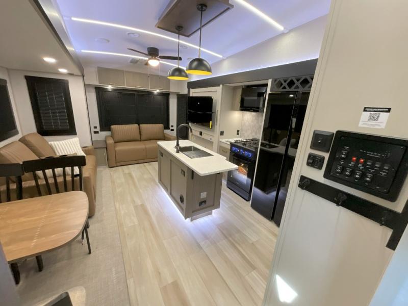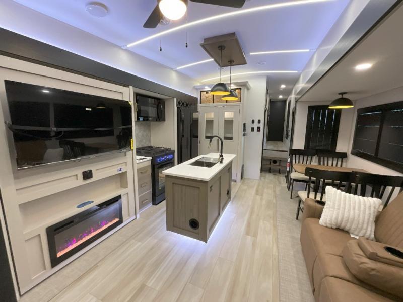 With any Wildwood Heritage Glen fifth wheel by Forest River, the quality construction, attention to detail and design along with a bright and welcoming interior allows you to relax in comfort. You'll love the high-end solid surface countertops included in the Elevated Value Package, along with a JBL sound system, full-length barreled ceilings, and an ultimate interior lighting upgrade. The included Expedition Package features an Accesibelly underbelly panel with 12V tank heaters, nitrogen-filled tires with aluminum rims, and a spacious 30" wide main entry door with a window. The Lippert On-The-Go ladder prep and back-up camera prep let you customize your fifth wheel even more, and the LED awning, front cap, marker and taillights will make it easier than ever to set up camp!