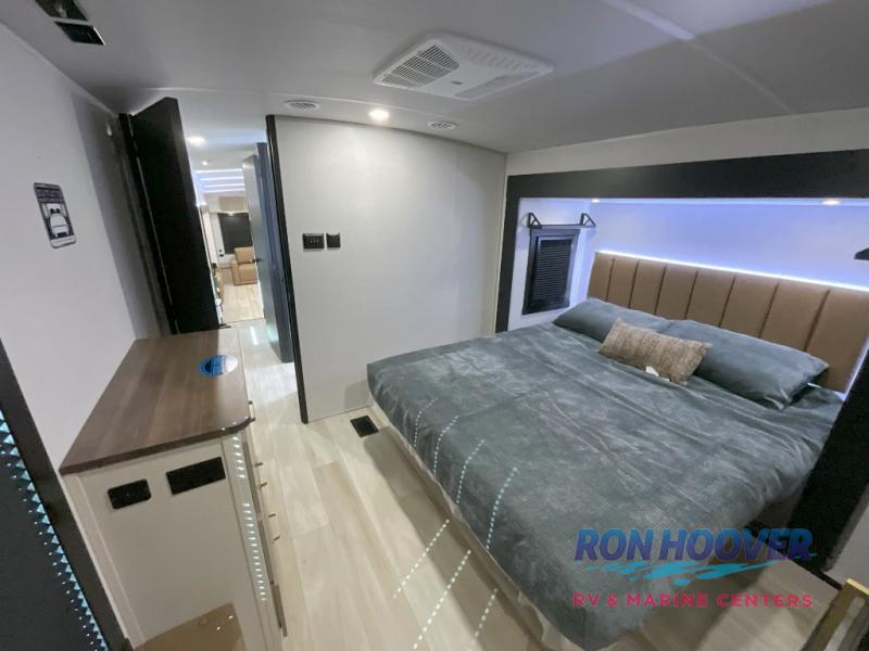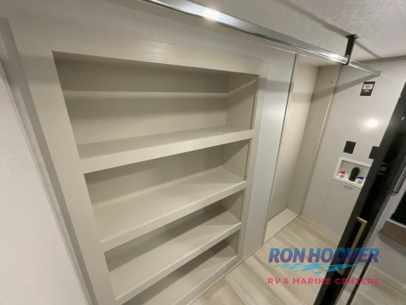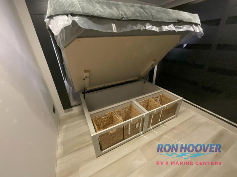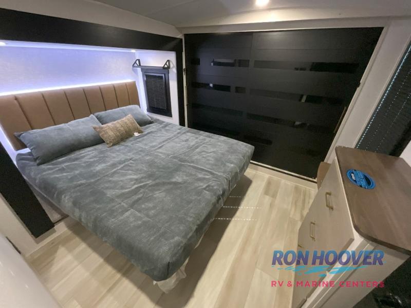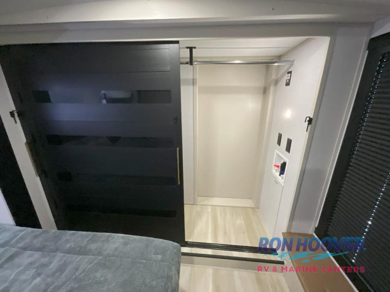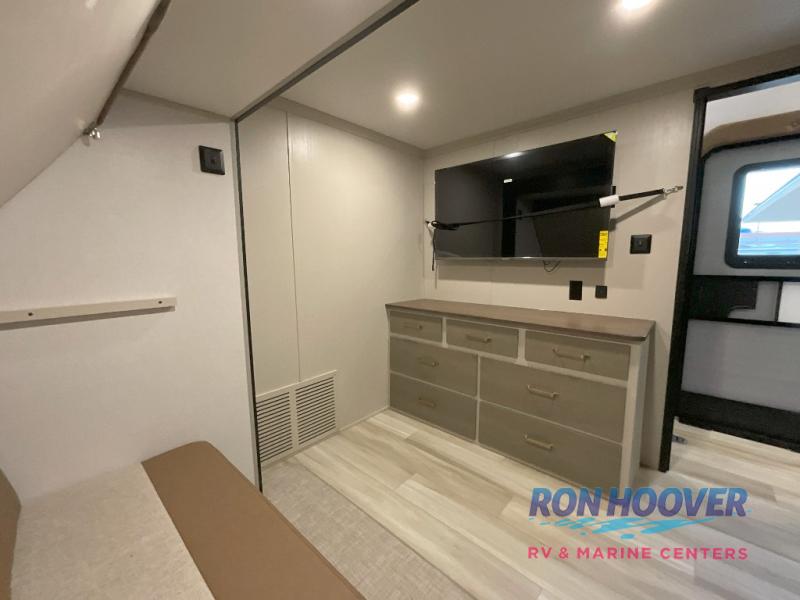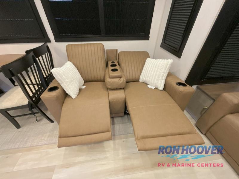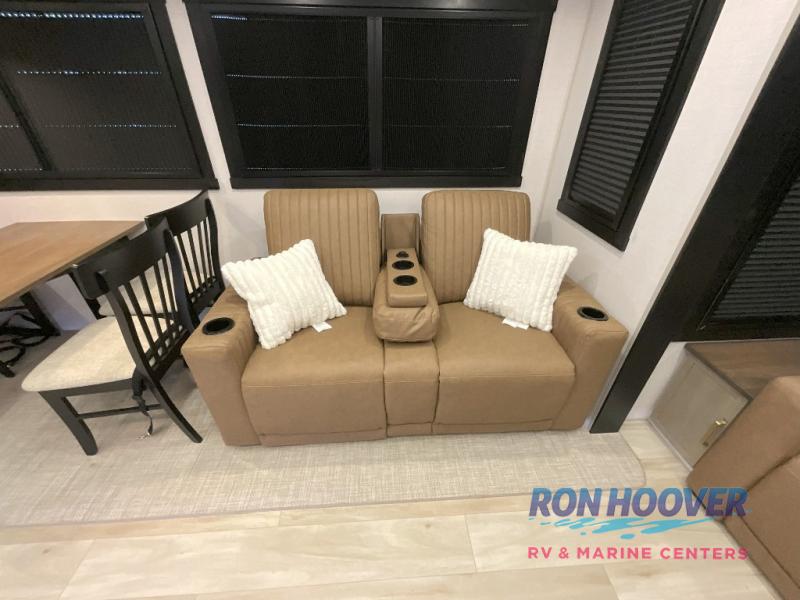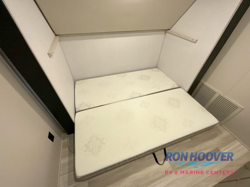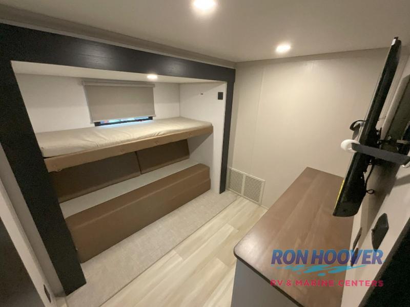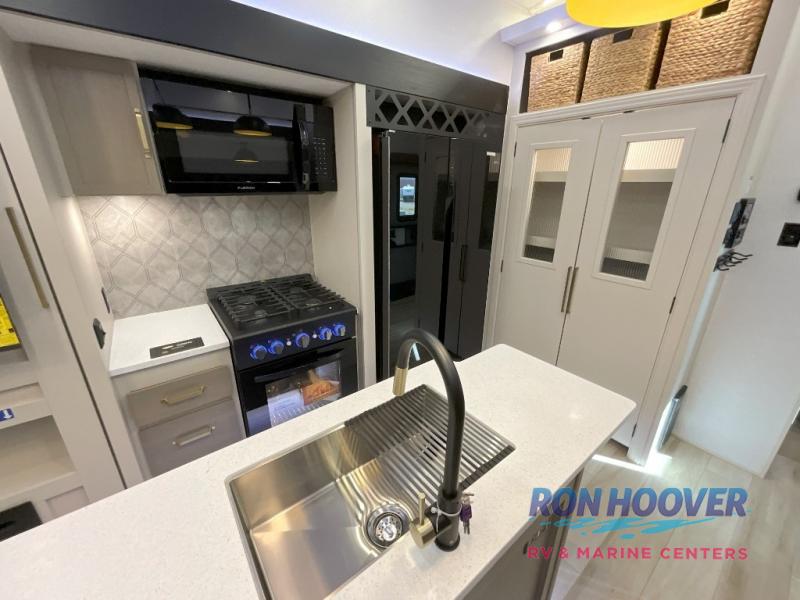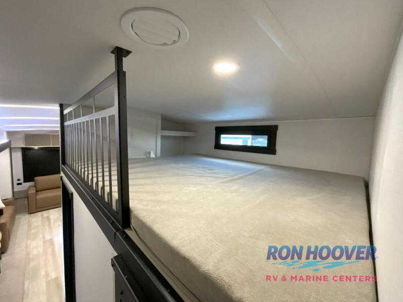 Imagine having your own master bedroom with a custom king bed, a full-width wardrobe, plus washer and dryer prep in this Wildwood Heritage Glen fifth wheel. You might even use the bench to put on your slippers before heading to the bathroom to get cleaned up in the residential walk-in shower. Your kids or friends can sleep in the middle bunkhouse that has a flip-up bunk, a Versa queen convertible sofa bed, and a loft above. You might also utilize this room as an office thanks to the desk. The chef will love all the appliances, the kitchen island, the deluxe French door pantry, and the 16-cu. ft. 12V refrigerator. There is also plenty of seating on all the furniture, and the cupholders in the theatre seats are handy.