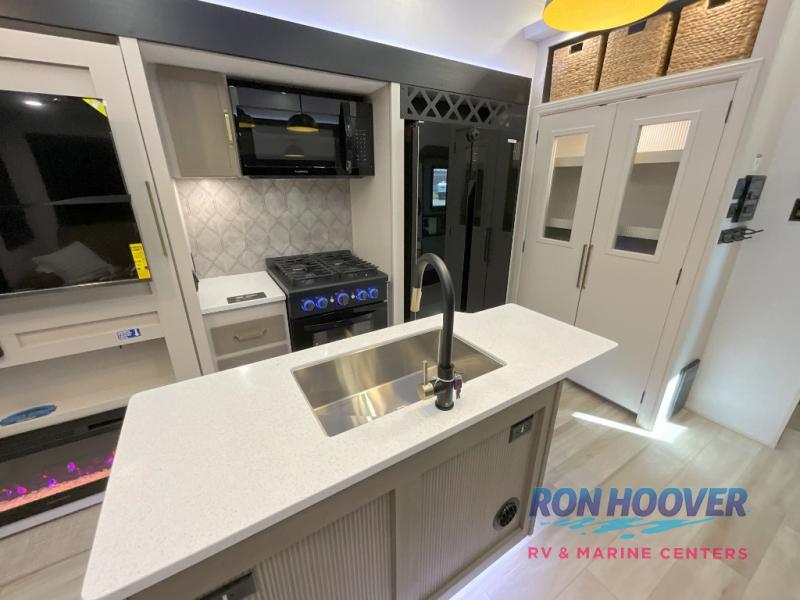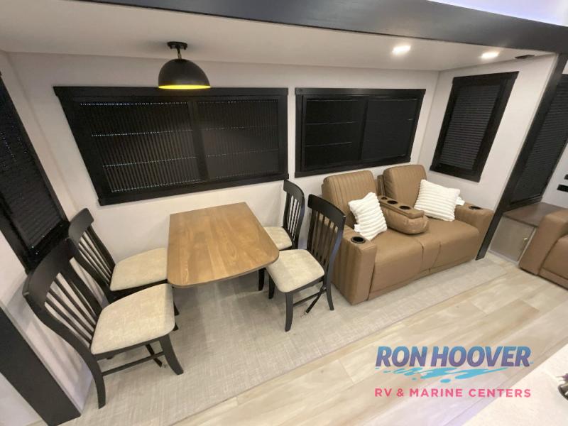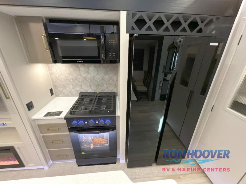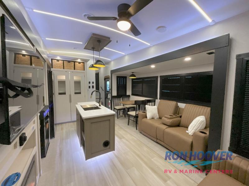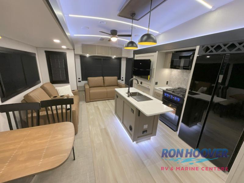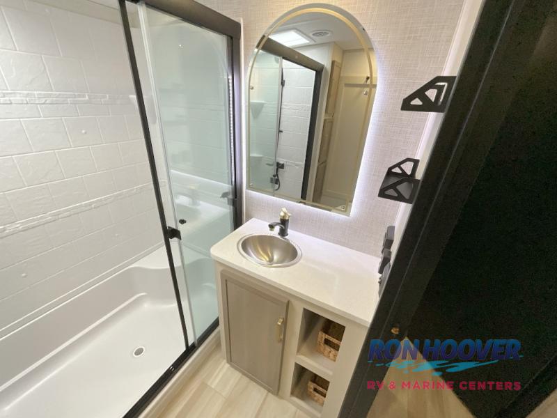 With any Wildwood Heritage Glen fifth wheel by Forest River, the quality construction, attention to detail and design along with a bright and welcoming interior allows you to relax in comfort. You'll love the high-end solid surface countertops included in the Elevated Value Package, along with a JBL sound system, full-length barreled ceilings, and an ultimate interior lighting upgrade. The included Expedition Package features an Accesibelly underbelly panel with 12V tank heaters, nitrogen-filled tires with aluminum rims, and a spacious 30" wide main entry door with a window. The Lippert On-The-Go ladder prep and back-up camera prep let you customize your fifth wheel even more, and the LED awning, front cap, marker and taillights will make it easier than ever to set up camp!