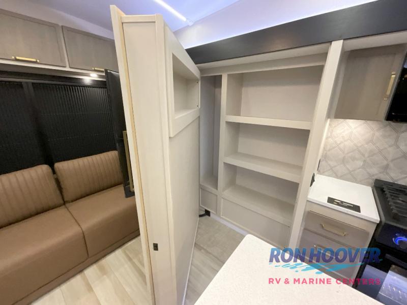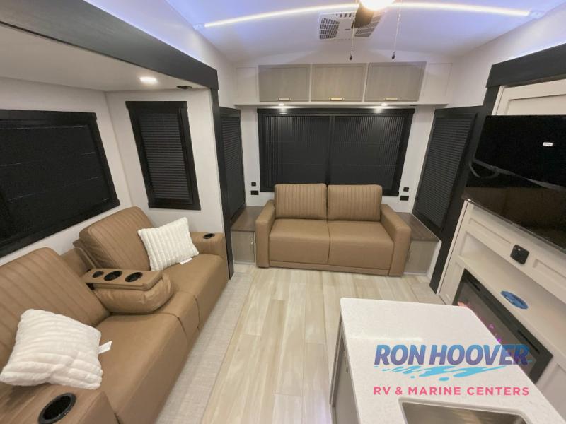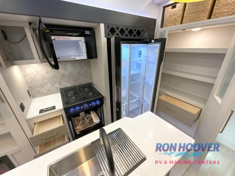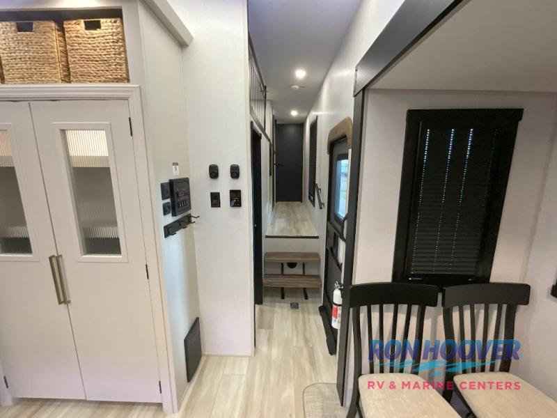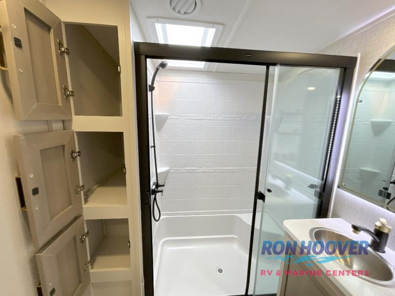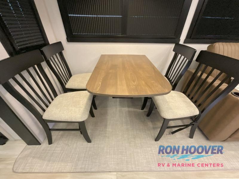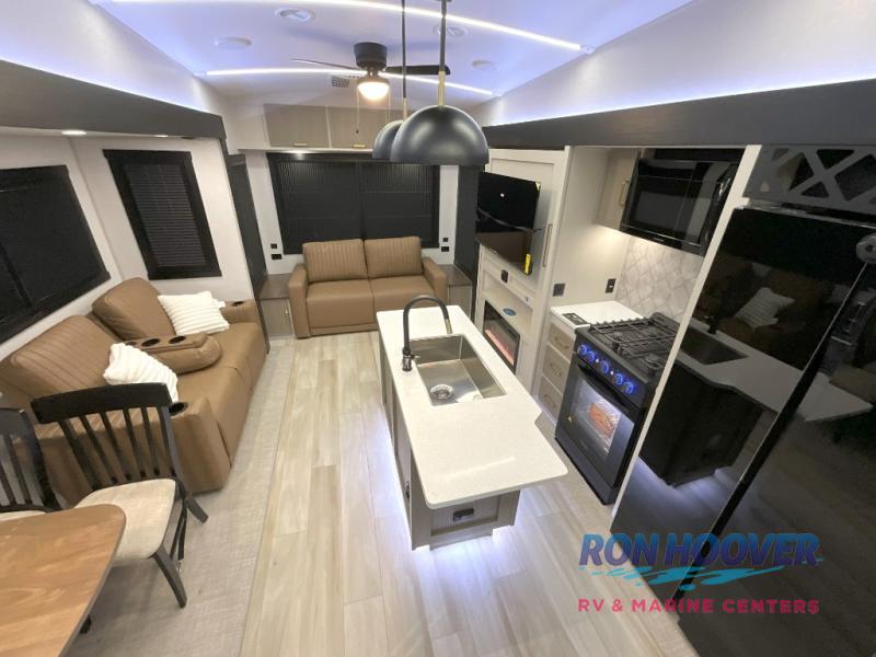 With any Wildwood Heritage Glen fifth wheel by Forest River, the quality construction, attention to detail and design along with a bright and welcoming interior allows you to relax in comfort. You'll love the high-end solid surface countertops included in the Elevated Value Package, along with a JBL sound system, full-length barreled ceilings, and an ultimate interior lighting upgrade. The included Expedition Package features an Accesibelly underbelly panel with 12V tank heaters, nitrogen-filled tires with aluminum rims, and a spacious 30" wide main entry door with a window. The Lippert On-The-Go ladder prep and back-up camera prep let you customize your fifth wheel even more, and the LED awning, front cap, marker and taillights will make it easier than ever to set up camp!