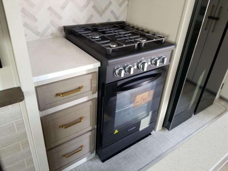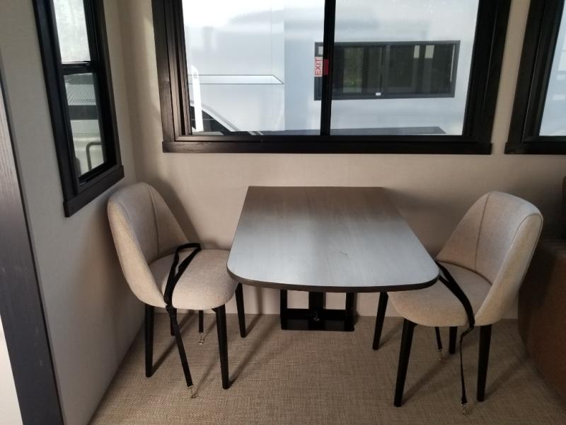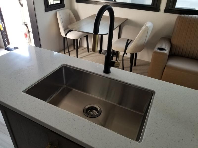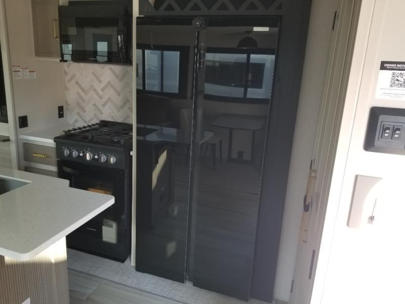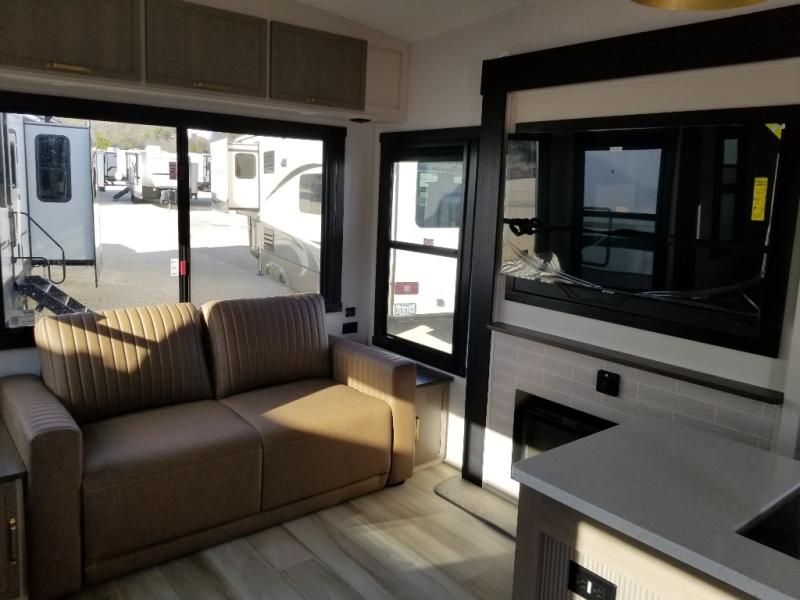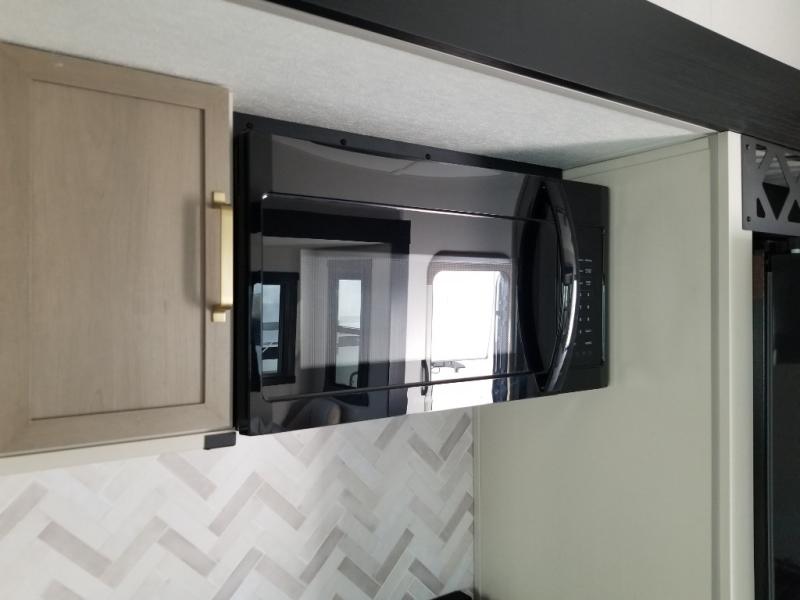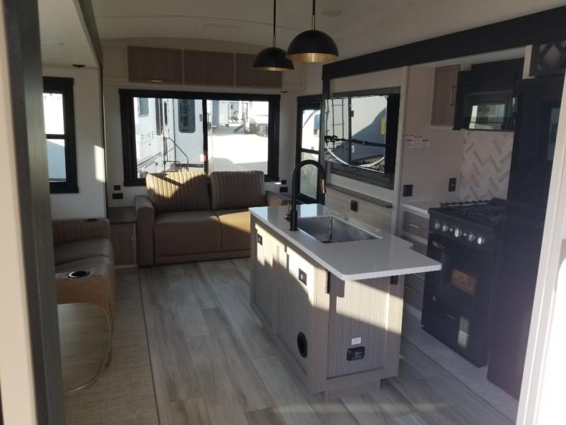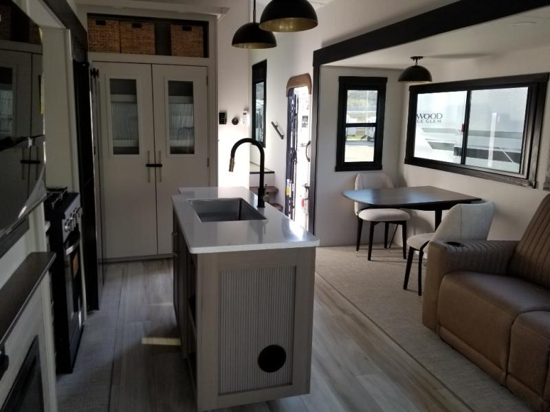 With any Wildwood Heritage Glen fifth wheel by Forest River, the quality construction, attention to detail and design along with a bright and welcoming interior allows you to relax in comfort. You'll love the high-end solid surface countertops included in the Elevated Value Package, along with a JBL sound system, full-length barreled ceilings, and an ultimate interior lighting upgrade. The included Expedition Package features an Accesibelly underbelly panel with 12V tank heaters, nitrogen-filled tires with aluminum rims, and a spacious 30" wide main entry door with a window. The Lippert On-The-Go ladder prep and back-up camera prep let you customize your fifth wheel even more, and the LED awning, front cap, marker and taillights will make it easier than ever to set up camp!
