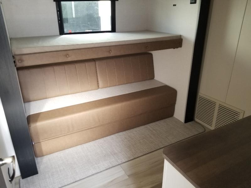 Imagine having your own master bedroom with a custom king bed, a full-width wardrobe, plus washer and dryer prep in this Wildwood Heritage Glen fifth wheel. You might even use the bench to put on your slippers before heading to the bathroom to get cleaned up in the residential walk-in shower. Your kids or friends can sleep in the middle bunkhouse that has a flip-up bunk, a Versa queen convertible sofa bed, and a loft above. You might also utilize this room as an office thanks to the desk. The chef will love all the appliances, the kitchen island, the deluxe French door pantry, and the 16-cu. ft. 12V refrigerator. There is also plenty of seating on all the furniture, and the cupholders in the theatre seats are handy.