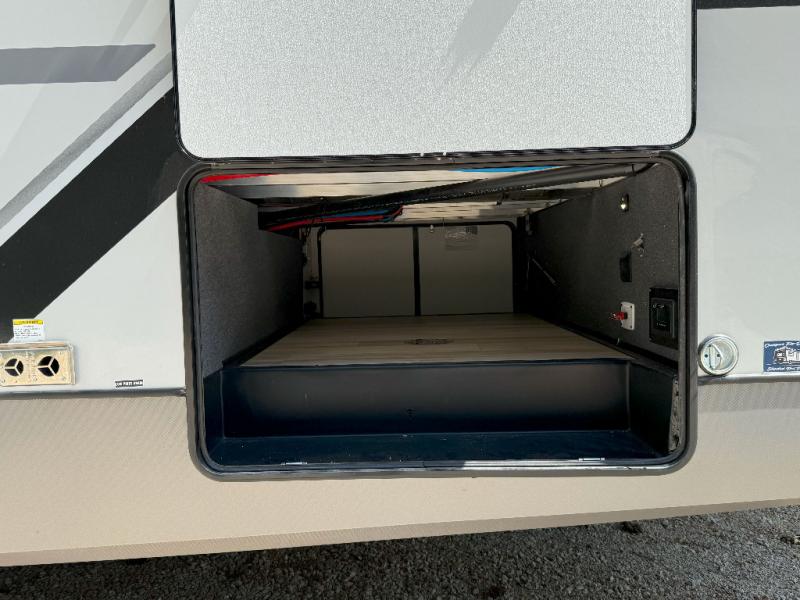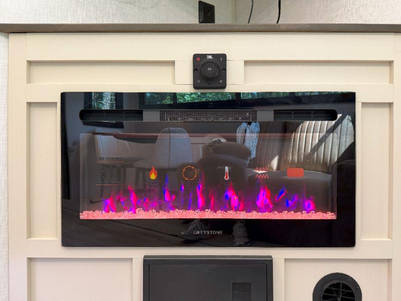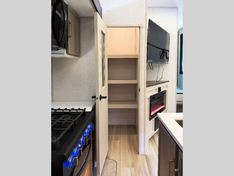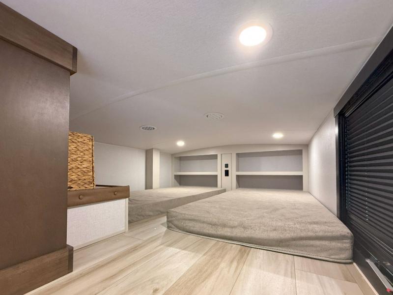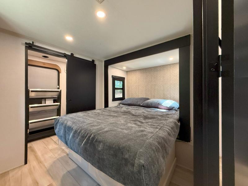 You can't beat this fifth wheel that has just about everything you could need for camping trips! There are two private bedrooms; one up front with a custom king bed with and one in the back with a custom queen bed and its own full rear bath. You'll also find the second entry door located in the rear bathroom for added convenience! The kids are sure to love the loft with a ladder, two bunk mats, plus storage, or you can utilize this space for just storage if you don't have any guests staying over. The middle living area will be the perfect place to meet together since there are dual opposing slides for added space, theater seating and a table and chairs, plus a large kitchen island that will bring the whole room together. There is even a fireplace for a more cozy feel and a walk-in pantry to keep snacks