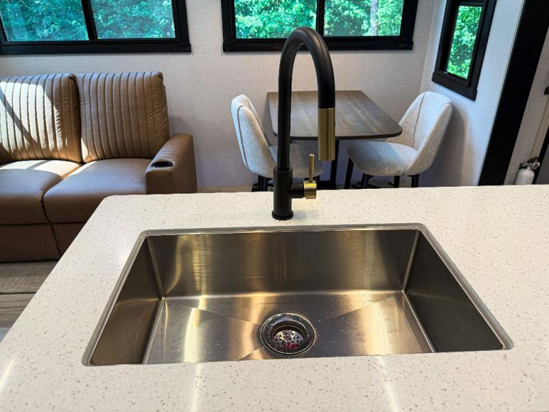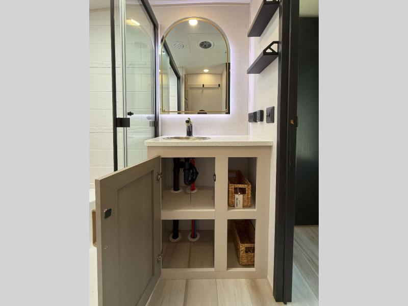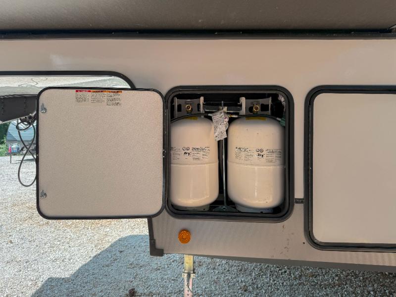 With any Wildwood Heritage Glen fifth wheel by Forest River, the quality construction, attention to detail and design along with a bright and welcoming interior allows you to relax in comfort with conveniences while exploring outdoors. The Summer Wind colored horizontal plank linoleum flooring is unique, beautiful and durable, and there are gold-accented faucets with stainless steel sinks in the bathrooms for added luxury. The Accessibelly underbelly with 12V tank heaters will help protect your unit from the elements, and the power stabilizer jacks and landing gear will make set-up a breeze. More features that provide convenience include the high-end solid surface countertops, an RV Airflow System that provides at least 25% better airflow, and solar prep for off-grid capabilities.