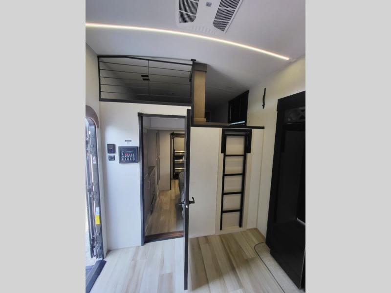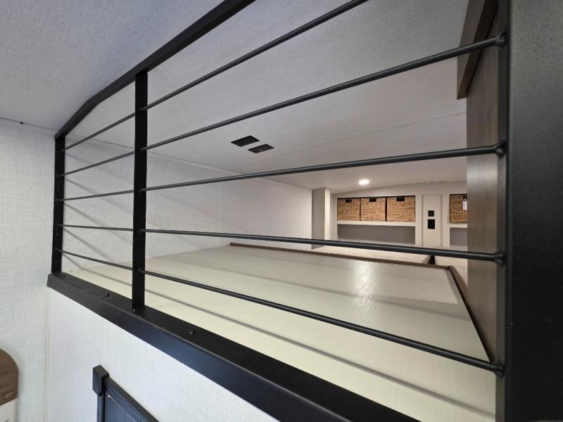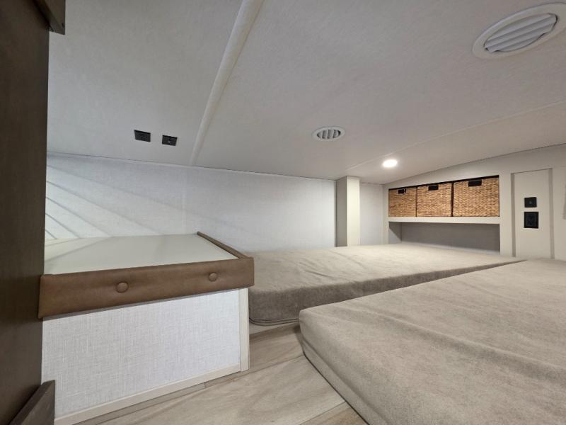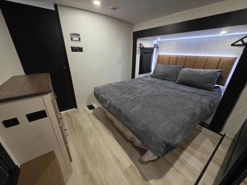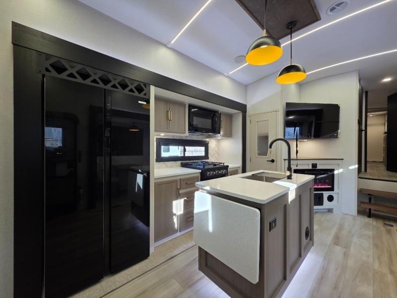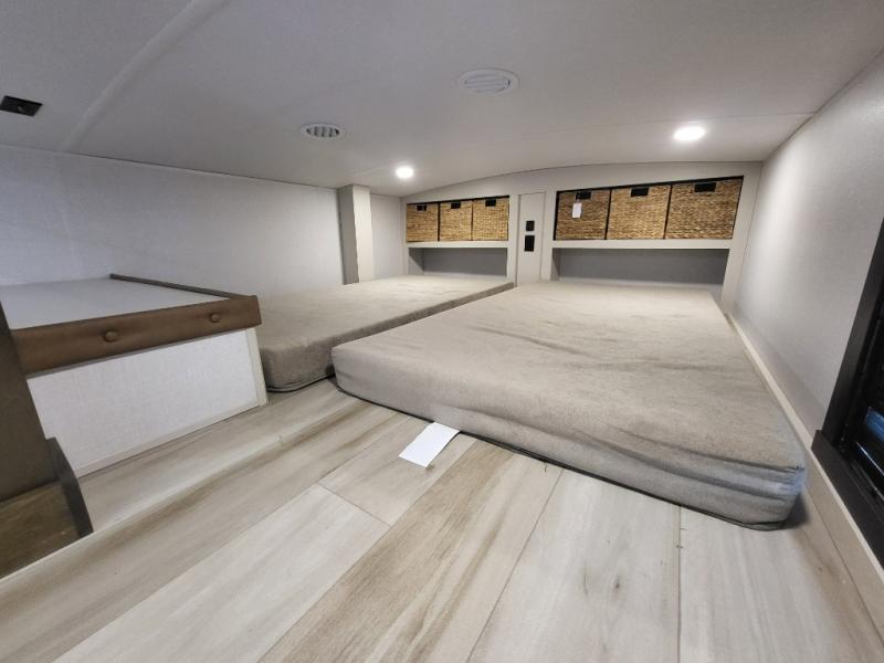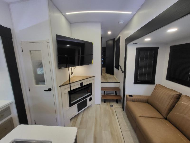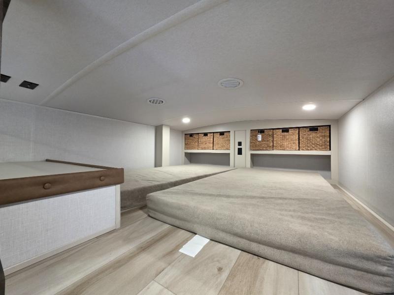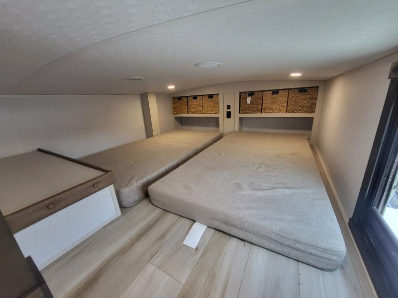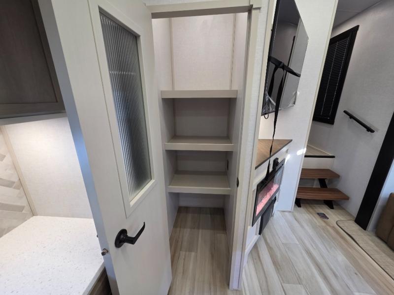 You can't beat this fifth wheel that has just about everything you could need for camping trips! There are two private bedrooms; one up front with a custom king bed with and one in the back with a custom queen bed and its own full rear bath. You'll also find the second entry door located in the rear bathroom for added convenience! The kids are sure to love the loft with a ladder, two bunk mats, plus storage, or you can utilize this space for just storage if you don't have any guests staying over. The middle living area will be the perfect place to meet together since there are dual opposing slides for added space, theater seating and a table and chairs, plus a large kitchen island that will bring the whole room together. There is even a fireplace for a more cozy feel and a walk-in pantry to keep snacks
