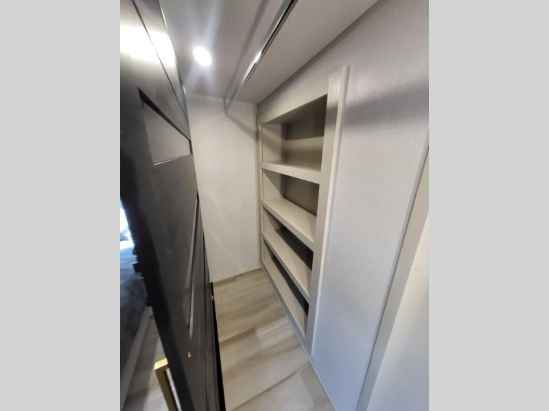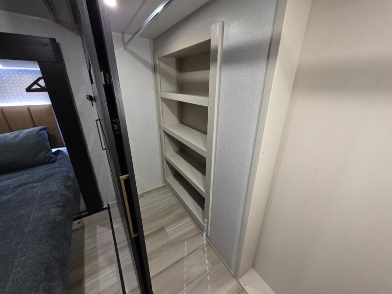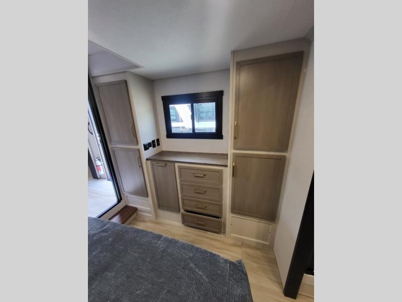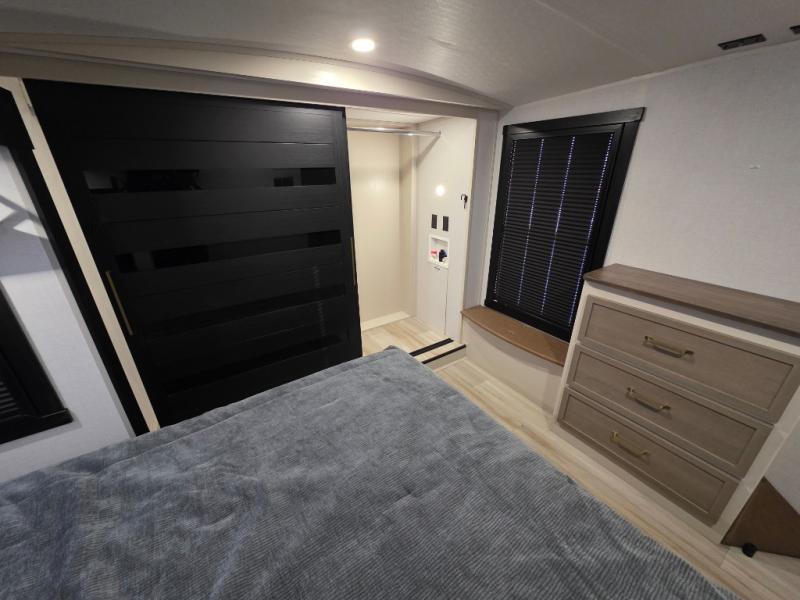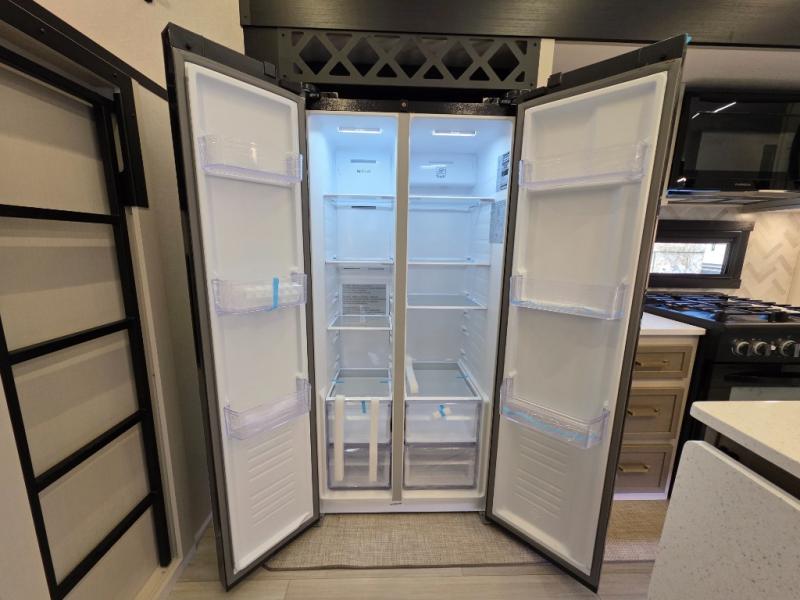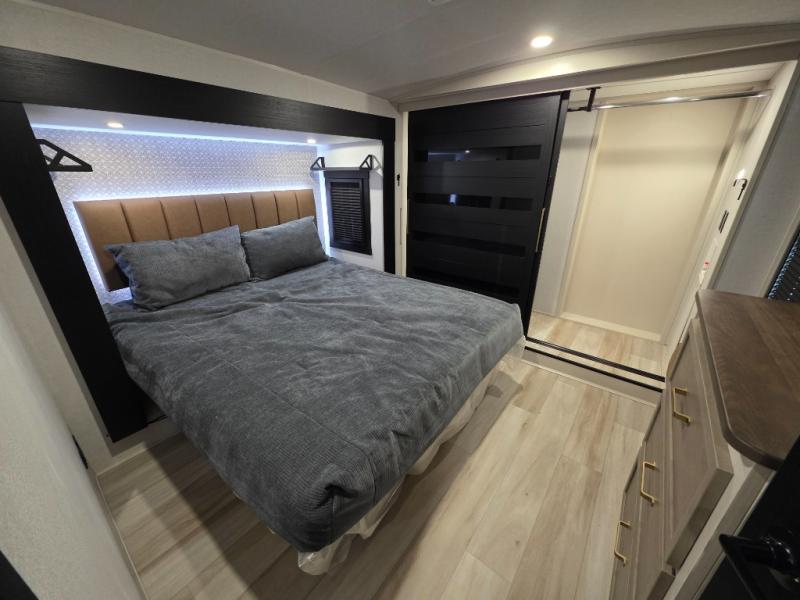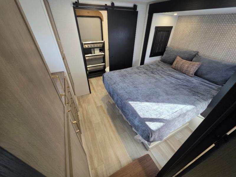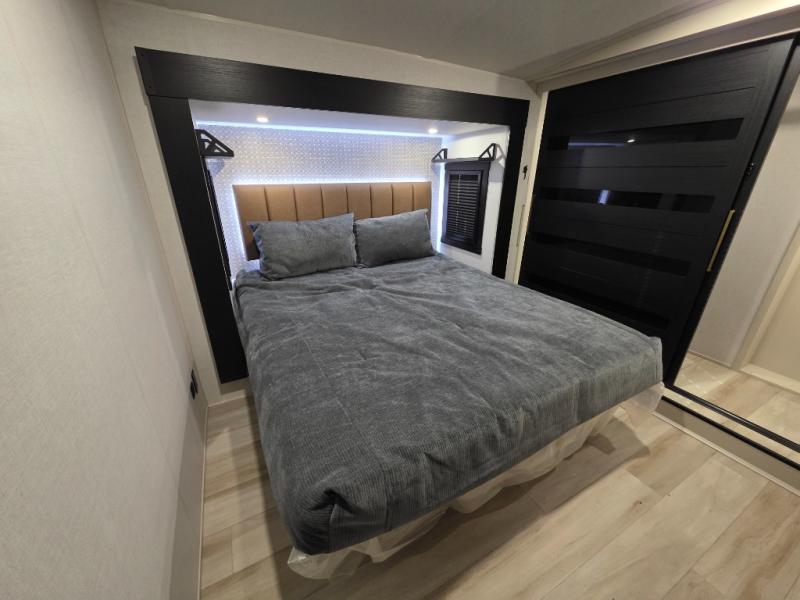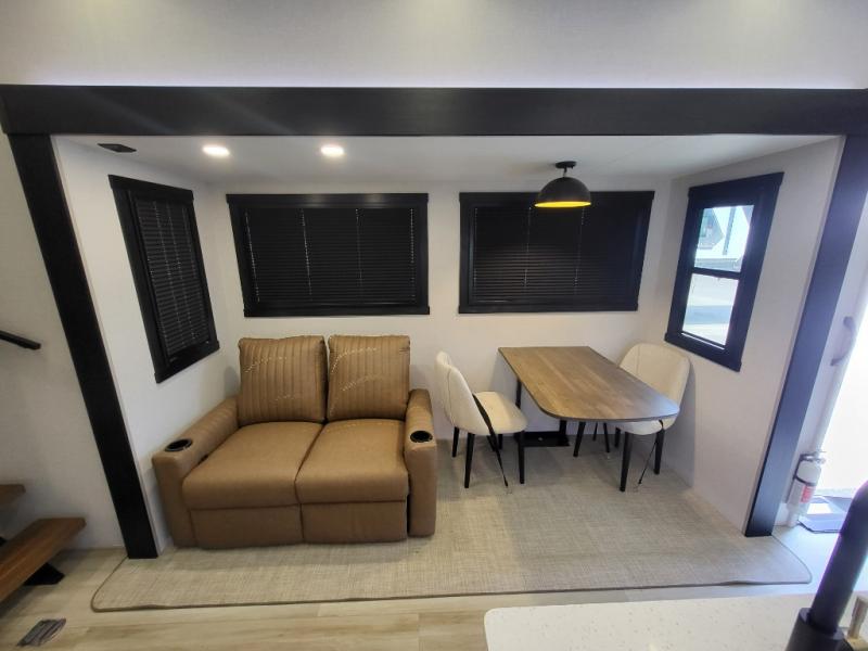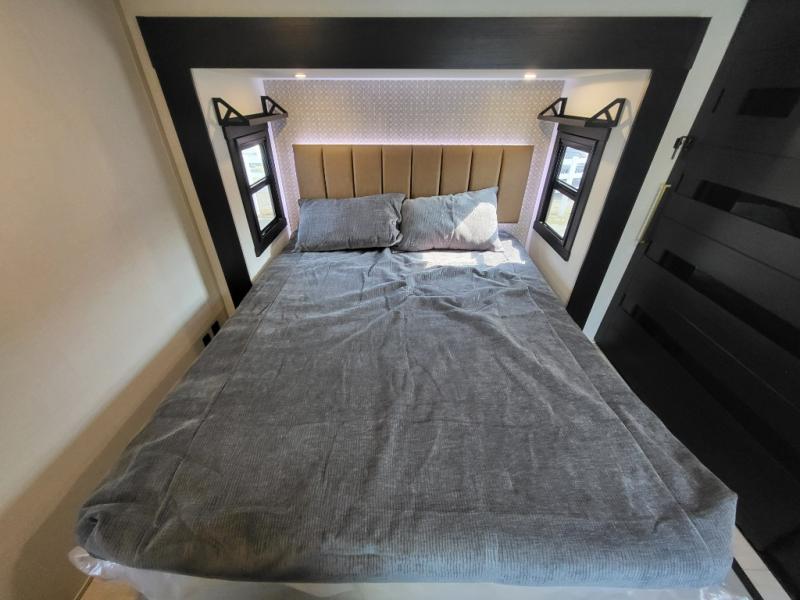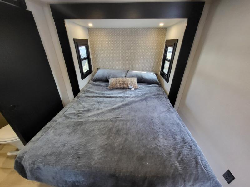 You can't beat this fifth wheel that has just about everything you could need for camping trips! There are two private bedrooms; one up front with a custom king bed with and one in the back with a custom queen bed and its own full rear bath. You'll also find the second entry door located in the rear bathroom for added convenience! The kids are sure to love the loft with a ladder, two bunk mats, plus storage, or you can utilize this space for just storage if you don't have any guests staying over. The middle living area will be the perfect place to meet together since there are dual opposing slides for added space, theater seating and a table and chairs, plus a large kitchen island that will bring the whole room together. There is even a fireplace for a more cozy feel and a walk-in pantry to keep snacks