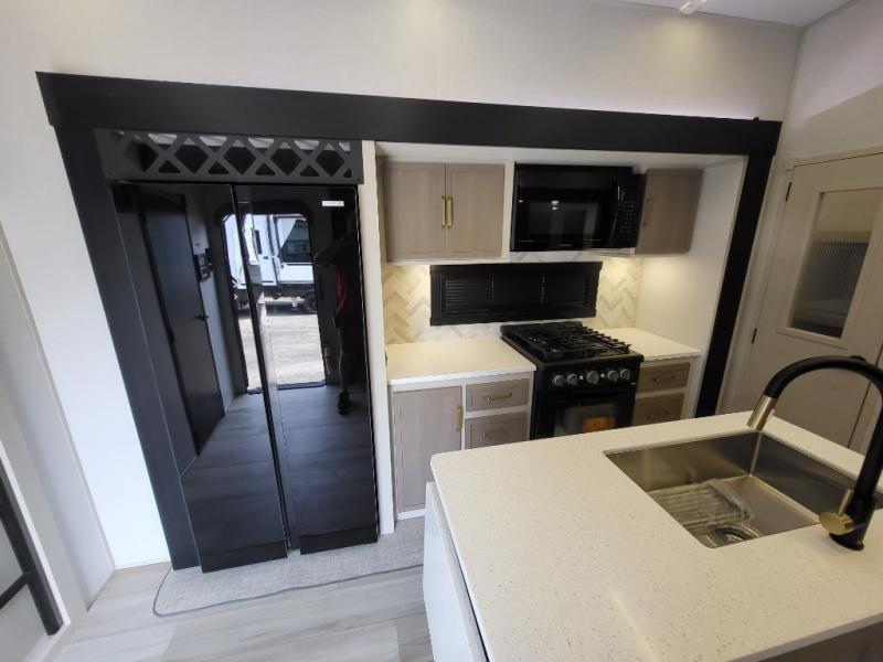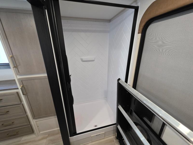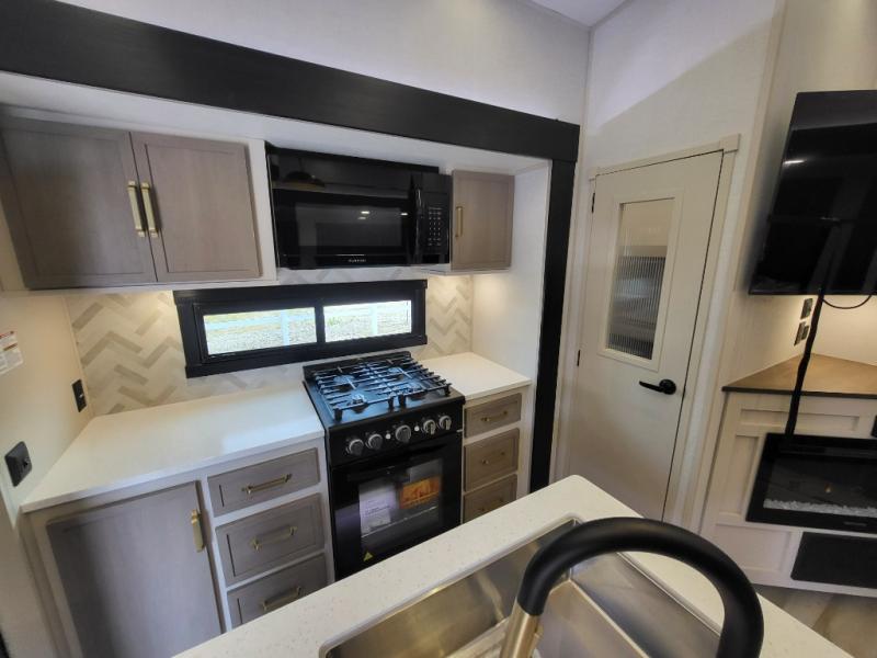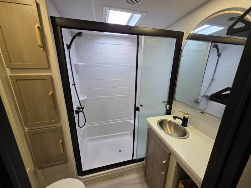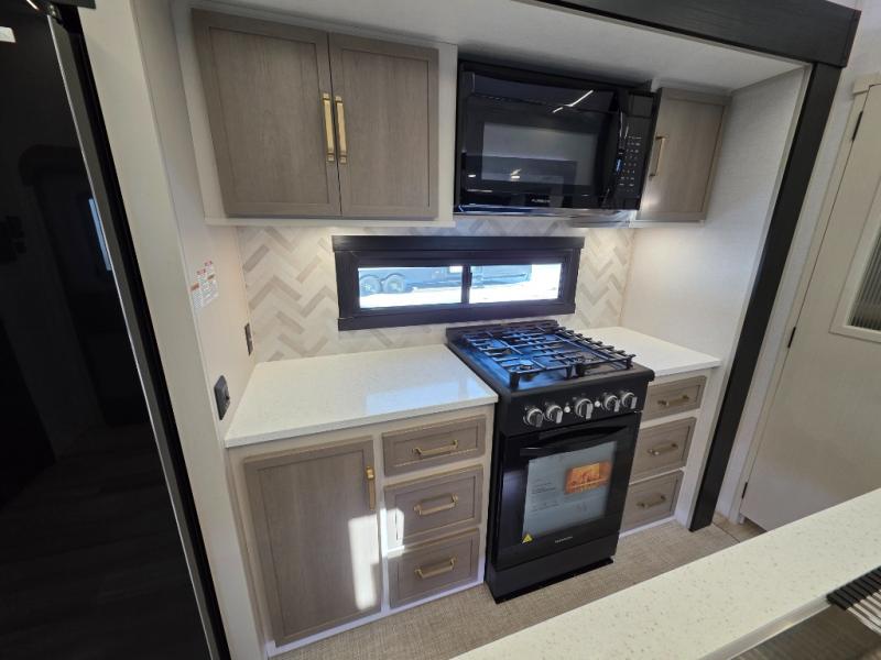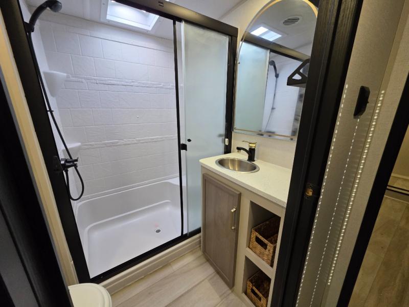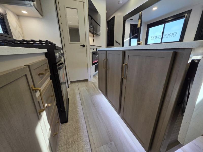 With any Wildwood Heritage Glen fifth wheel by Forest River, the quality construction, attention to detail and design along with a bright and welcoming interior allows you to relax in comfort with conveniences while exploring outdoors. The Summer Wind colored horizontal plank linoleum flooring is unique, beautiful and durable, and there are gold-accented faucets with stainless steel sinks in the bathrooms for added luxury. The Accessibelly underbelly with 12V tank heaters will help protect your unit from the elements, and the power stabilizer jacks and landing gear will make set-up a breeze. More features that provide convenience include the high-end solid surface countertops, an RV Airflow System that provides at least 25% better airflow, and solar prep for off-grid capabilities.