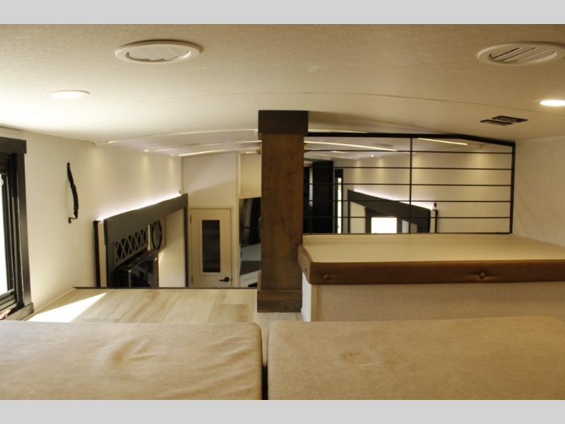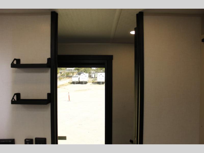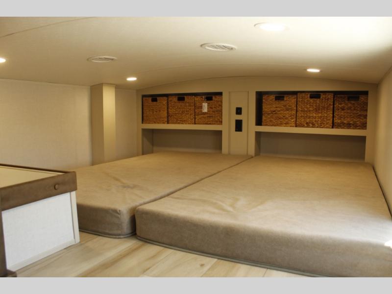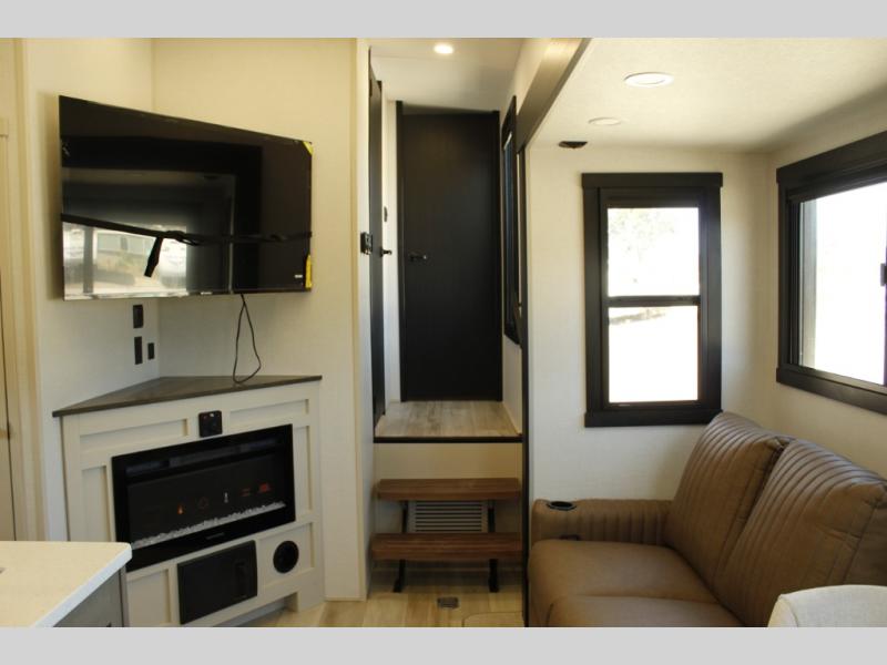 You can't beat this fifth wheel that has just about everything you could need for camping trips! There are two private bedrooms; one up front with a custom king bed with and one in the back with a custom queen bed and its own full rear bath. You'll also find the second entry door located in the rear bathroom for added convenience! The kids are sure to love the loft with a ladder, two bunk mats, plus storage, or you can utilize this space for just storage if you don't have any guests staying over. The middle living area will be the perfect place to meet together since there are dual opposing slides for added space, theater seating and a table and chairs, plus a large kitchen island that will bring the whole room together. There is even a fireplace for a more cozy feel and a walk-in pantry to keep snacks