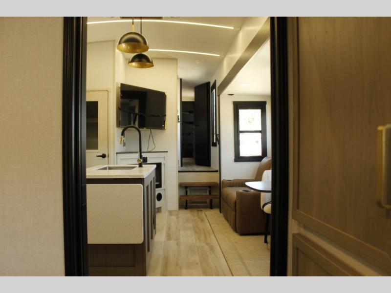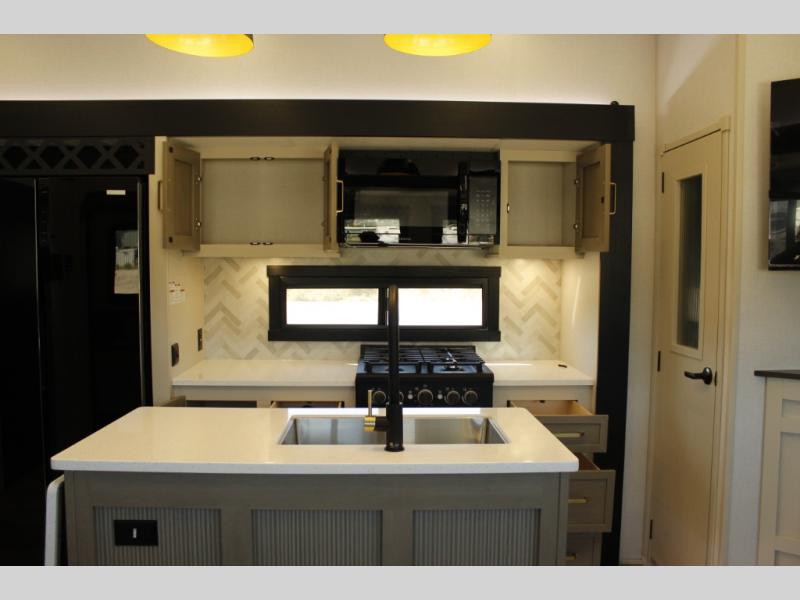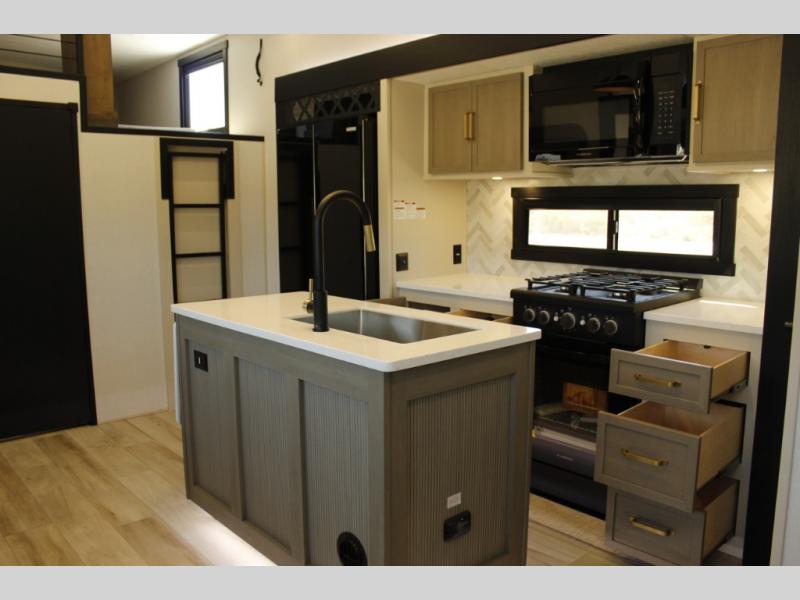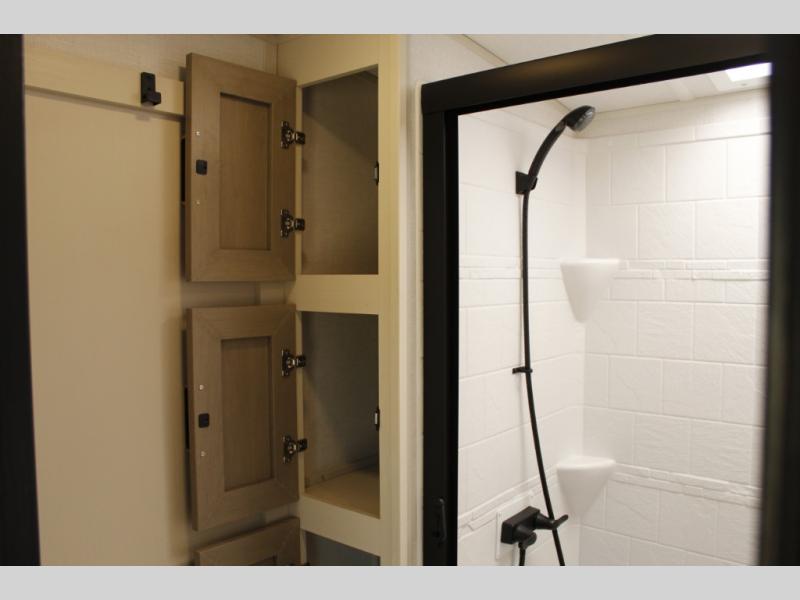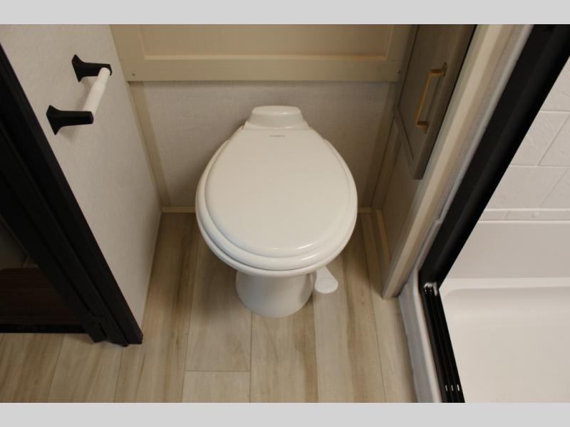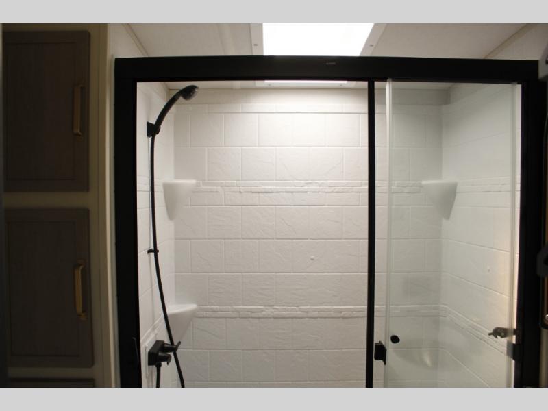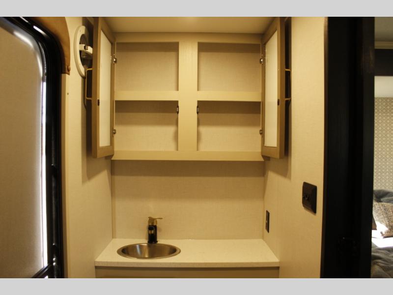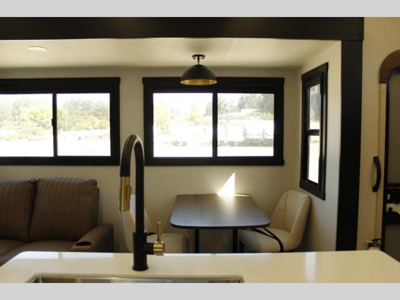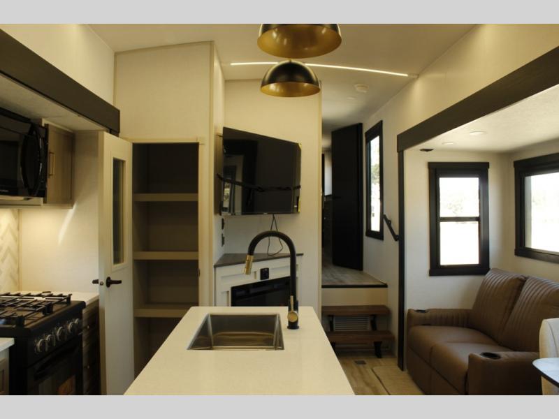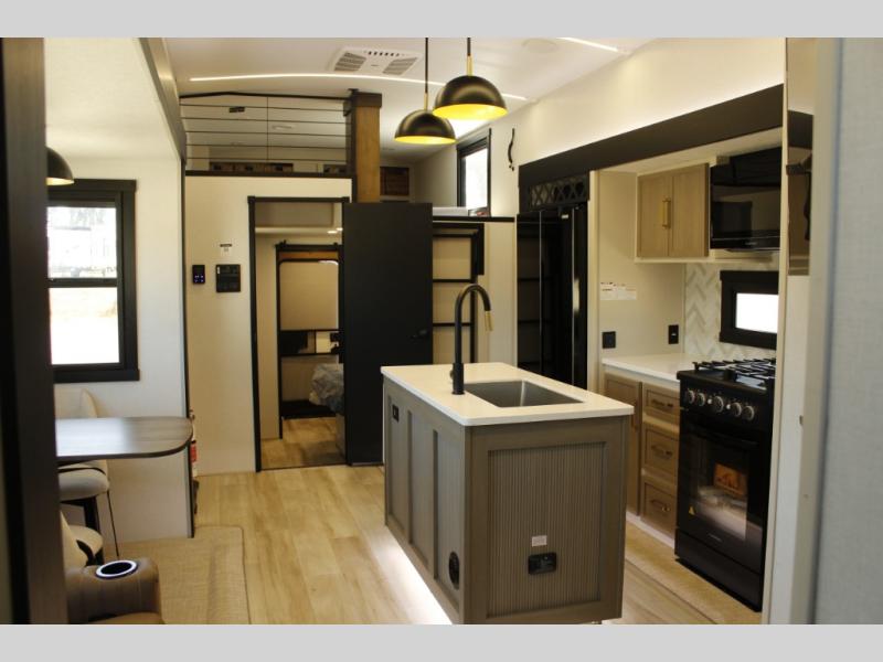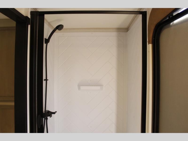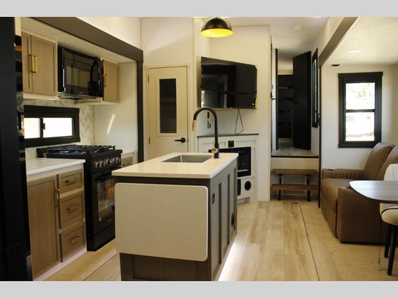 With any Wildwood Heritage Glen fifth wheel by Forest River, the quality construction, attention to detail and design along with a bright and welcoming interior allows you to relax in comfort with conveniences while exploring outdoors. The Summer Wind colored horizontal plank linoleum flooring is unique, beautiful and durable, and there are gold-accented faucets with stainless steel sinks in the bathrooms for added luxury. The Accessibelly underbelly with 12V tank heaters will help protect your unit from the elements, and the power stabilizer jacks and landing gear will make set-up a breeze. More features that provide convenience include the high-end solid surface countertops, an RV Airflow System that provides at least 25% better airflow, and solar prep for off-grid capabilities.