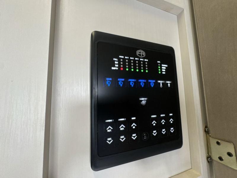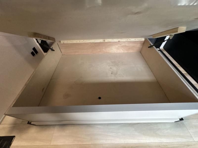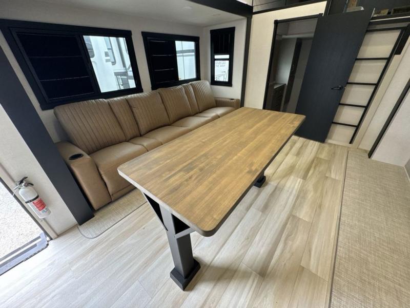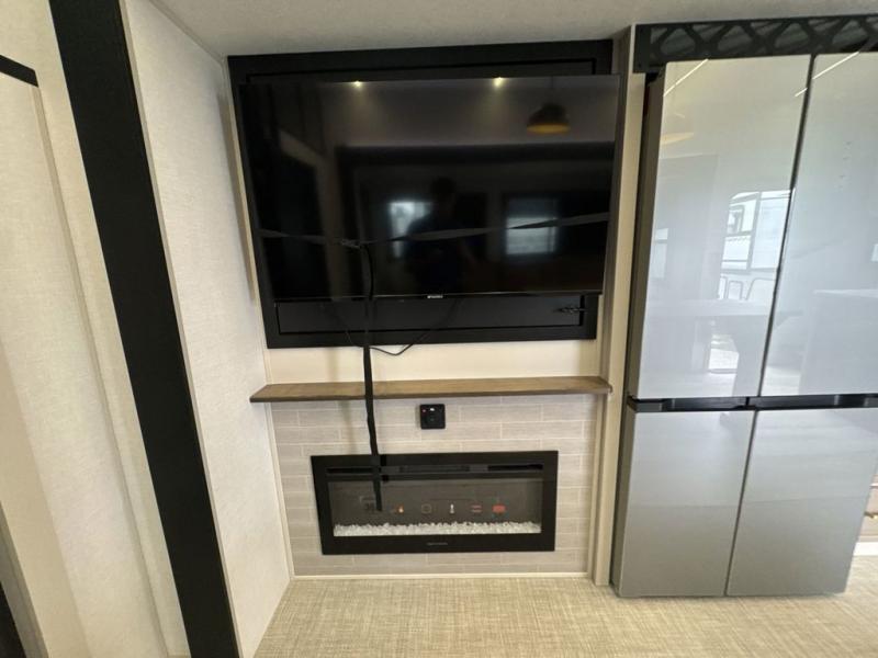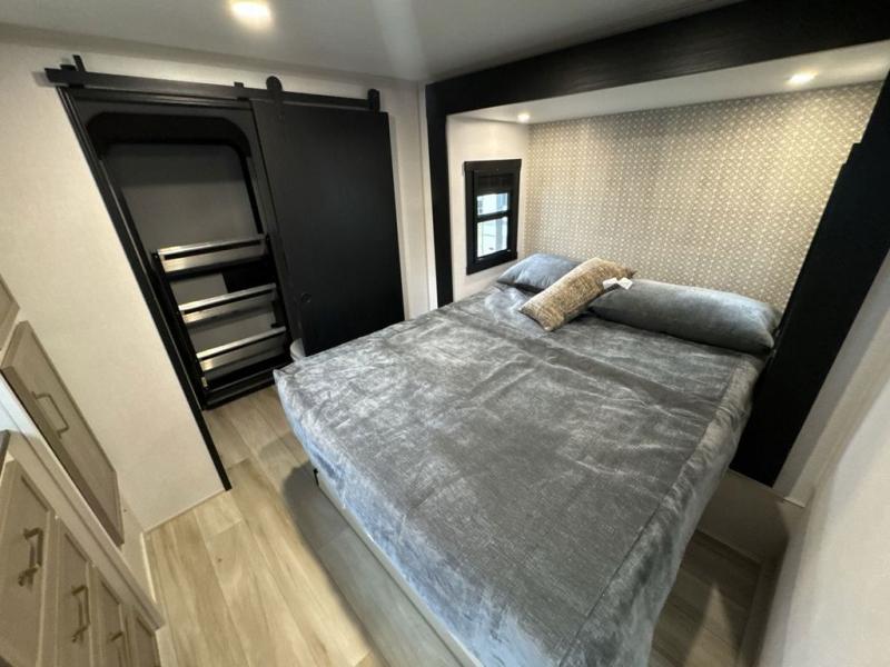 The whole family will love camping in this spacious fifth wheel! There are four slide outs, two bedrooms, plus two full baths, one of which is located in the rear master bedroom. A custom queen bed and dual wardrobes are also found in the master, while a custom king bed is found in the front private bedroom. And the loft with bunk mats can be used for additional sleeping or storage space! The chef of your group will find a full kitchen to cook meals, including ample counter space and a 16-cu. ft. 12V refrigerator and hidden storage behind the 50" TV for snacks or movies. The theater seating with cup holders provides a comfy place to relax each day, and the kitchen island with chairs will be perfect for dining space!