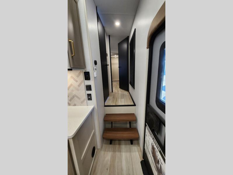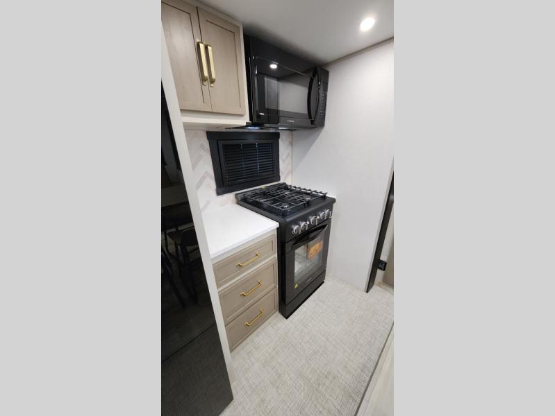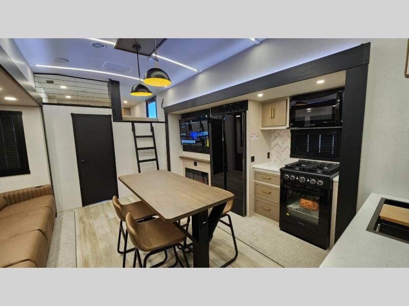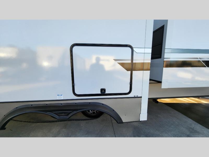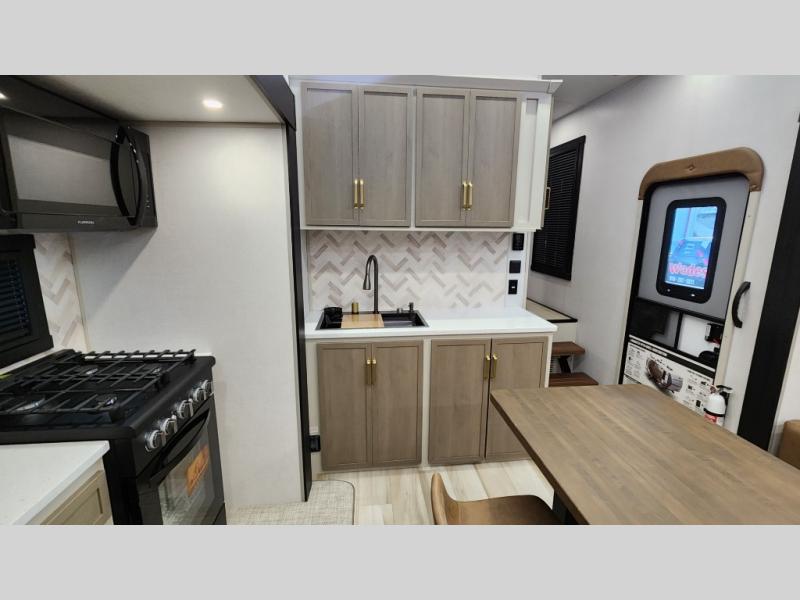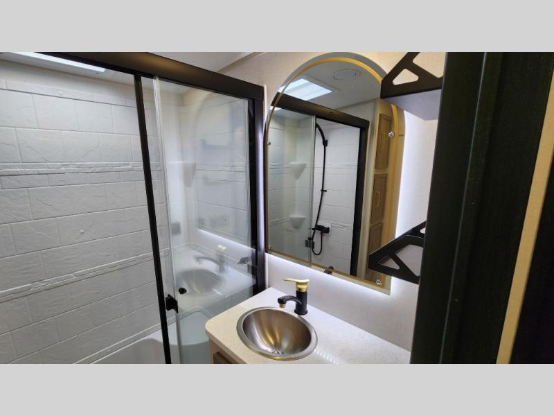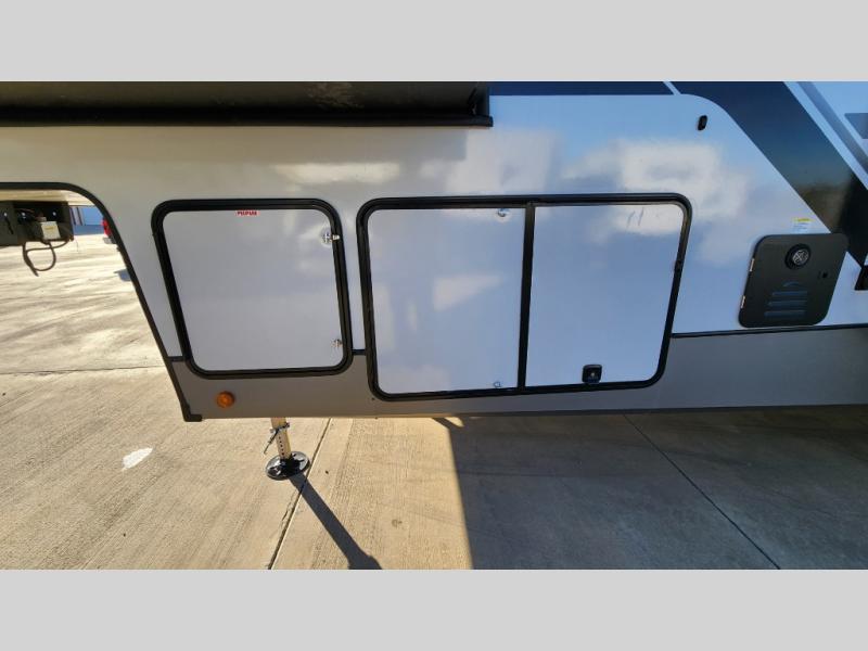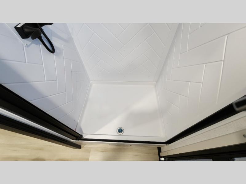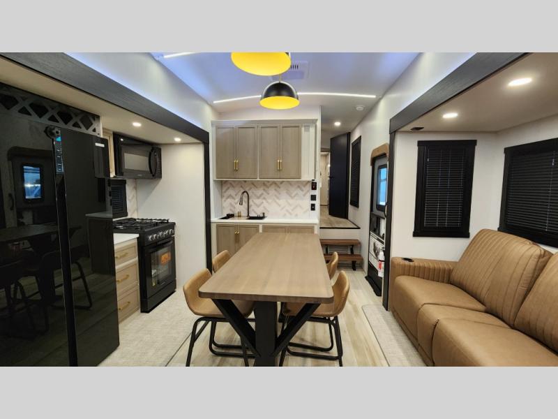 With any Wildwood Heritage Glen fifth wheel by Forest River, the quality construction, attention to detail and design along with a bright and welcoming interior allows you to relax in comfort. You'll love the high-end solid surface countertops included in the Elevated Value Package, along with a JBL sound system, full-length barreled ceilings, and an ultimate interior lighting upgrade. The included Expedition Package features an Accesibelly underbelly panel with 12V tank heaters, nitrogen-filled tires with aluminum rims, and a spacious 30" wide main entry door with a window. The Lippert On-The-Go ladder prep and back-up camera prep let you customize your fifth wheel even more, and the LED awning, front cap, marker and taillights will make it easier than ever to set up camp!