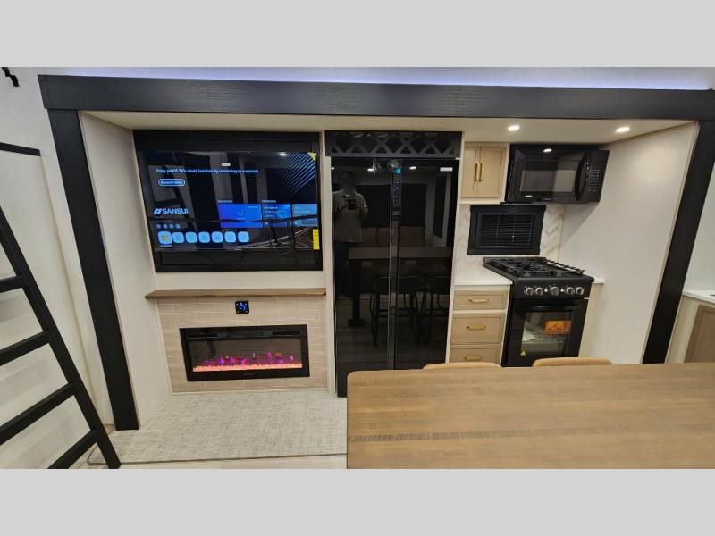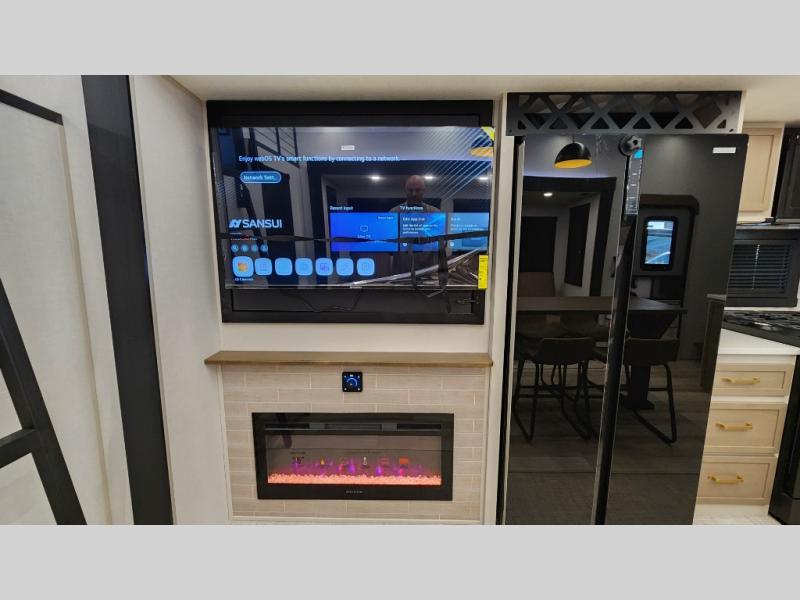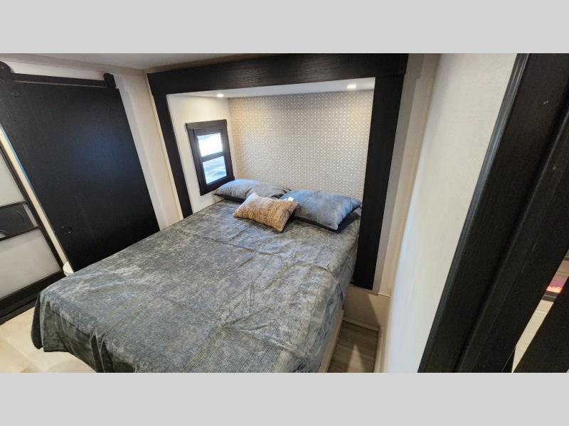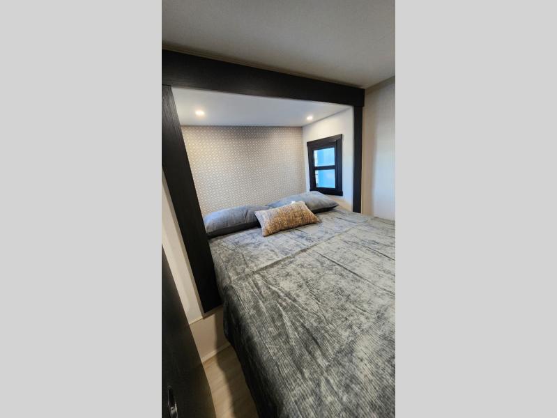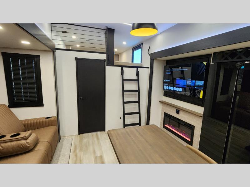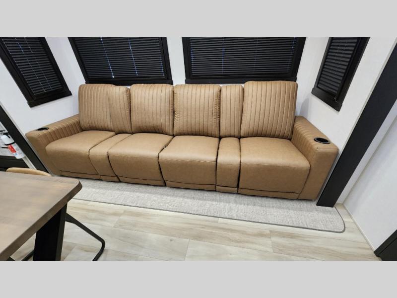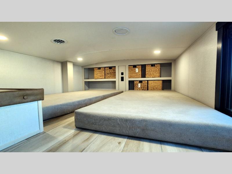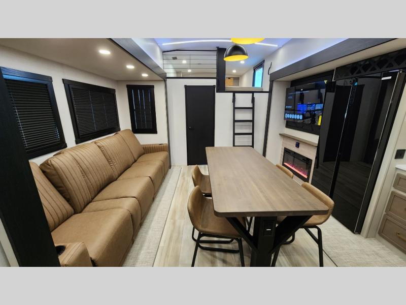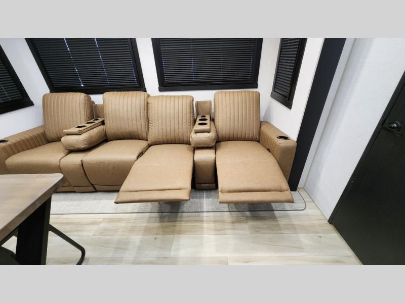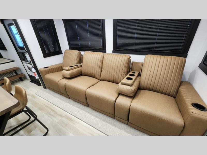 The whole family will love camping in this spacious fifth wheel! There are four slide outs, two bedrooms, plus two full baths, one of which is located in the rear master bedroom. A custom queen bed and dual wardrobes are also found in the master, while a custom king bed is found in the front private bedroom. And the loft with bunk mats can be used for additional sleeping or storage space! The chef of your group will find a full kitchen to cook meals, including ample counter space and a 16-cu. ft. 12V refrigerator and hidden storage behind the 50" TV for snacks or movies. The theater seating with cup holders provides a comfy place to relax each day, and the kitchen island with chairs will be perfect for dining space!