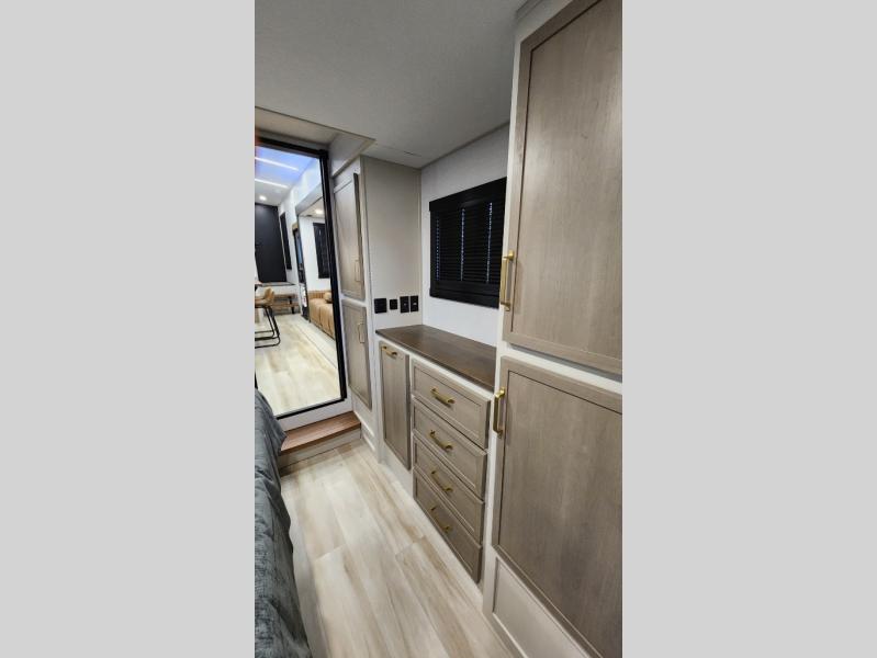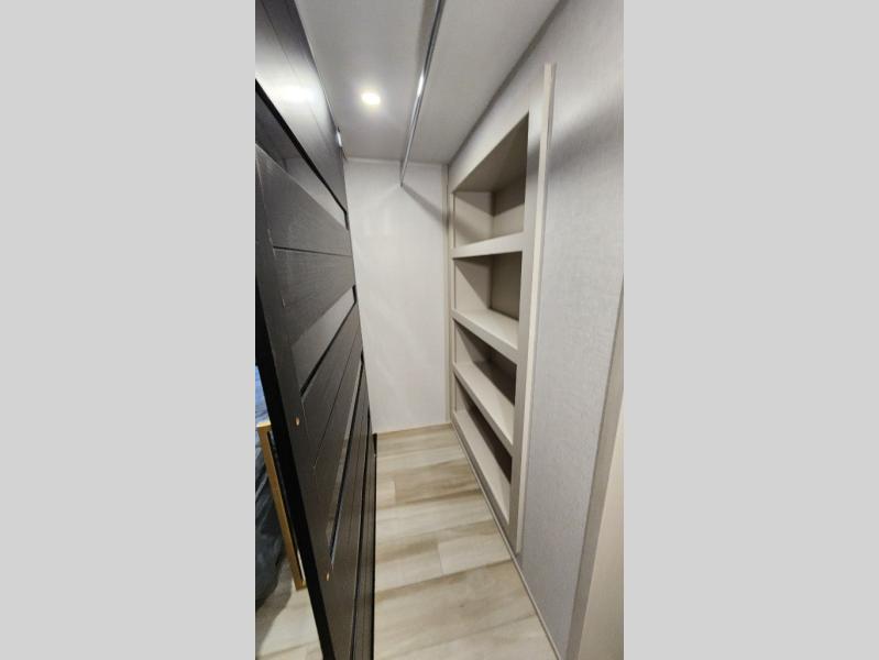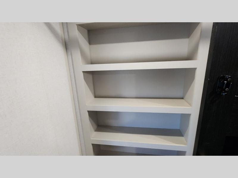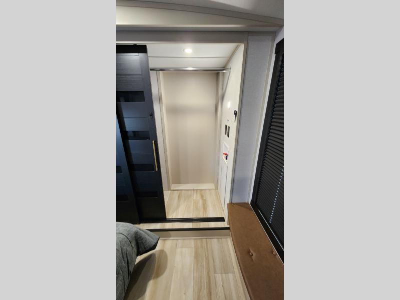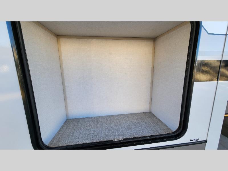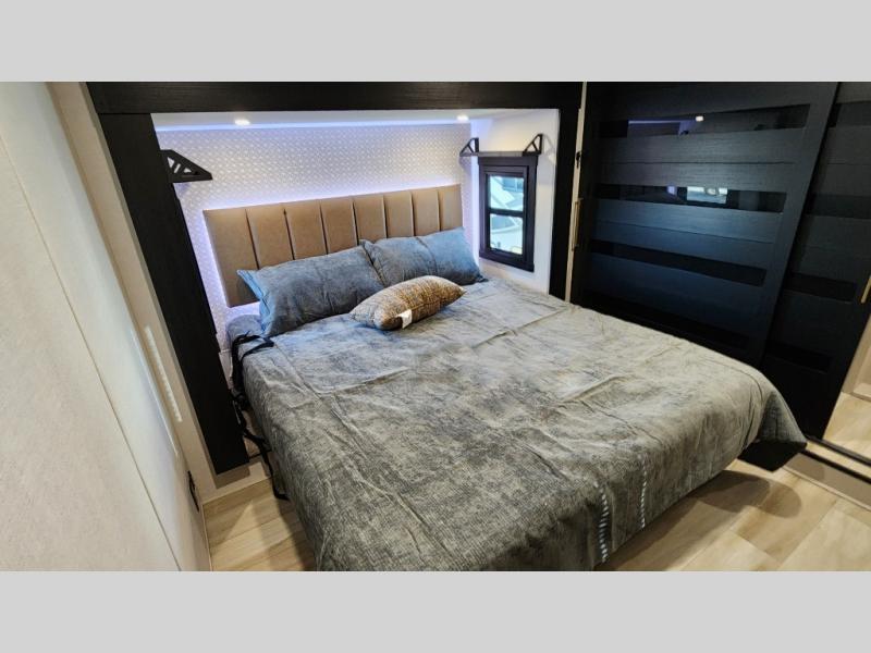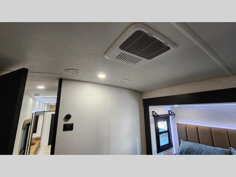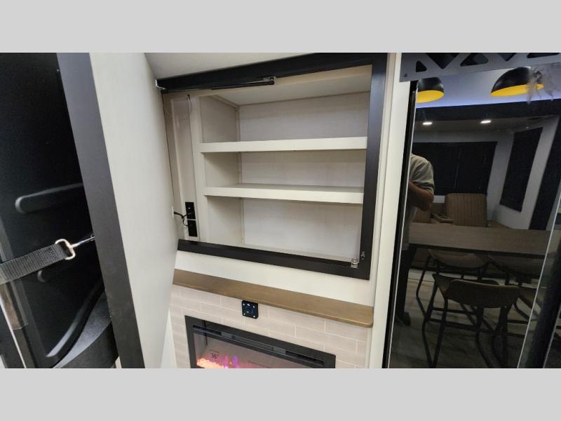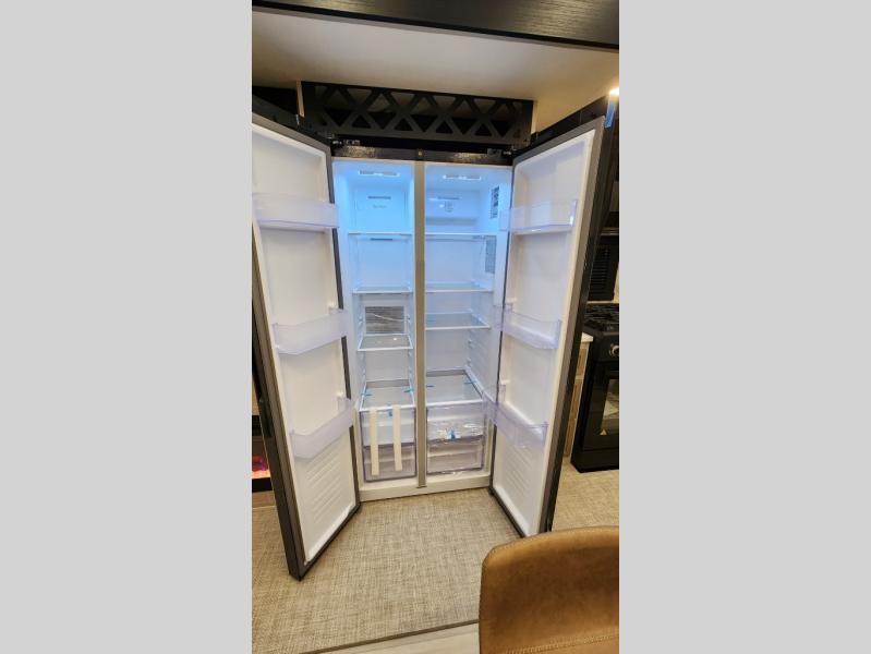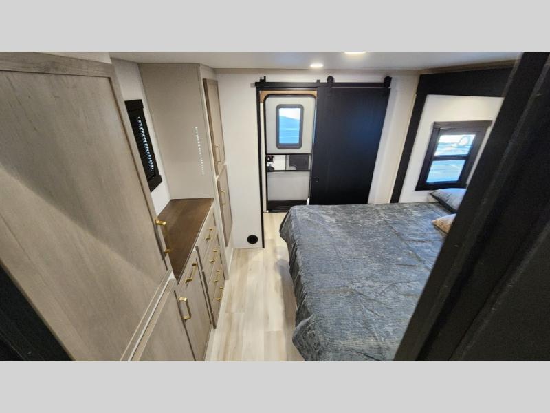 The whole family will love camping in this spacious fifth wheel! There are four slide outs, two bedrooms, plus two full baths, one of which is located in the rear master bedroom. A custom queen bed and dual wardrobes are also found in the master, while a custom king bed is found in the front private bedroom. And the loft with bunk mats can be used for additional sleeping or storage space! The chef of your group will find a full kitchen to cook meals, including ample counter space and a 16-cu. ft. 12V refrigerator and hidden storage behind the 50" TV for snacks or movies. The theater seating with cup holders provides a comfy place to relax each day, and the kitchen island with chairs will be perfect for dining space!