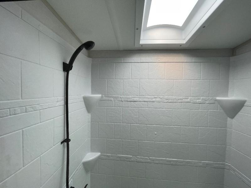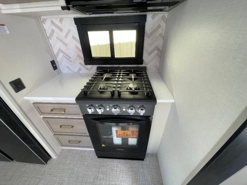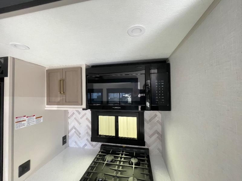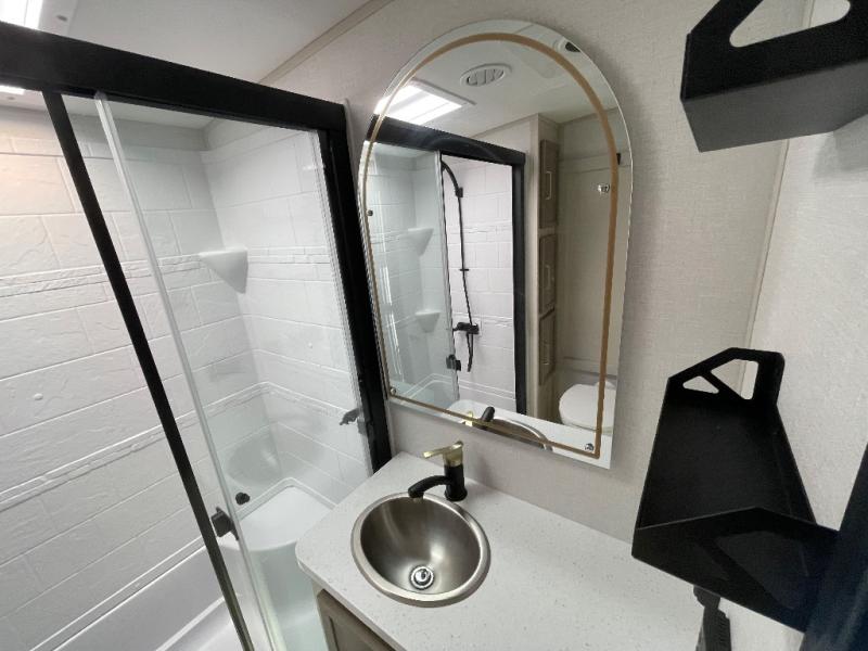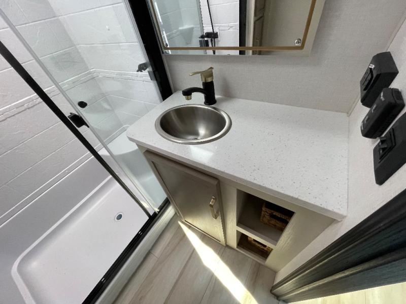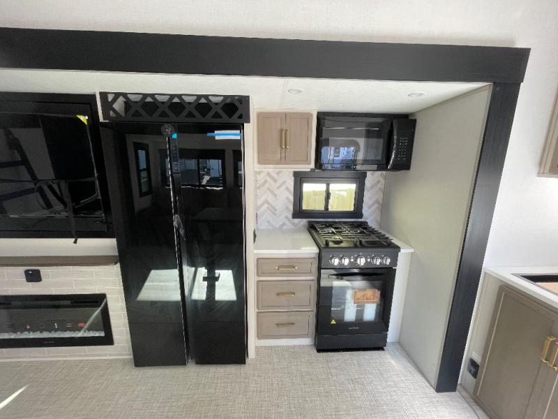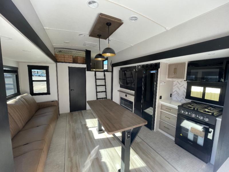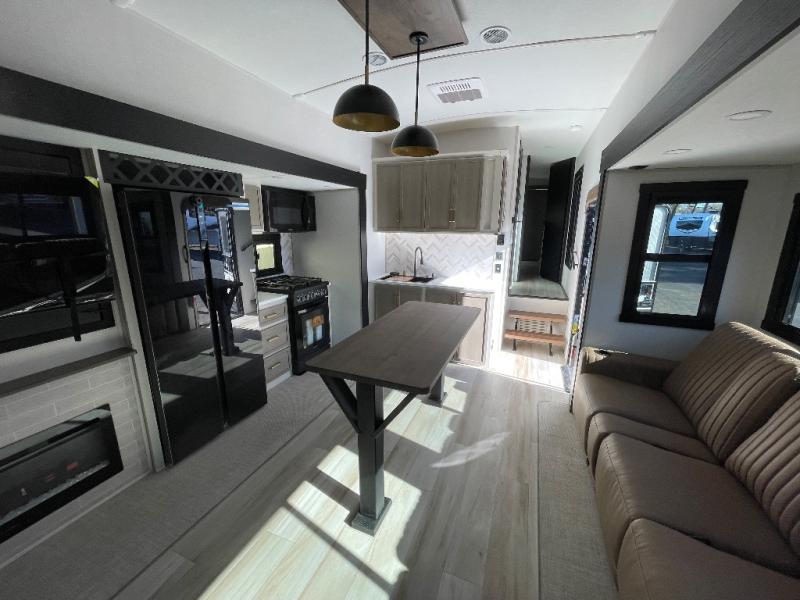 With any Wildwood Heritage Glen fifth wheel by Forest River, the quality construction, attention to detail and design along with a bright and welcoming interior allows you to relax in comfort. You'll love the high-end solid surface countertops included in the Elevated Value Package, along with a JBL sound system, full-length barreled ceilings, and an ultimate interior lighting upgrade. The included Expedition Package features an Accesibelly underbelly panel with 12V tank heaters, nitrogen-filled tires with aluminum rims, and a spacious 30" wide main entry door with a window. The Lippert On-The-Go ladder prep and back-up camera prep let you customize your fifth wheel even more, and the LED awning, front cap, marker and taillights will make it easier than ever to set up camp!