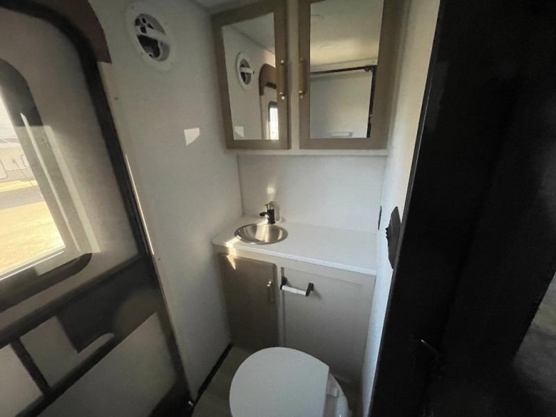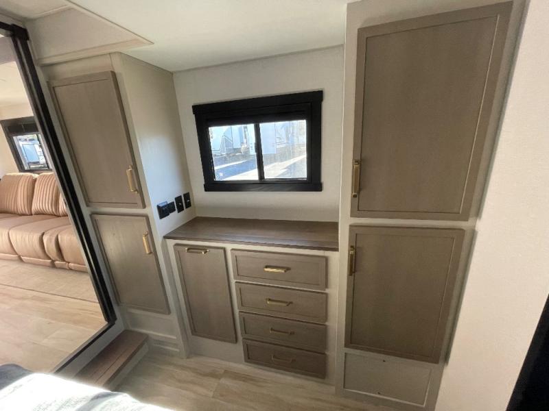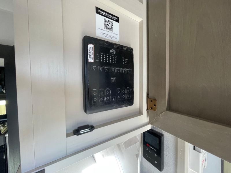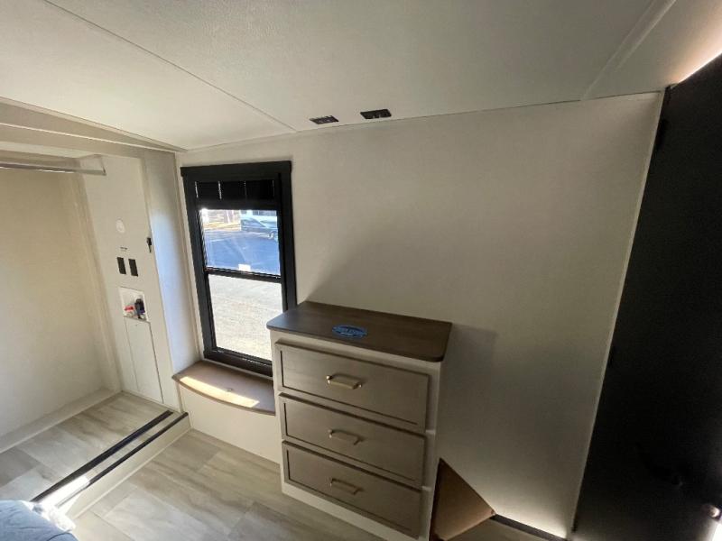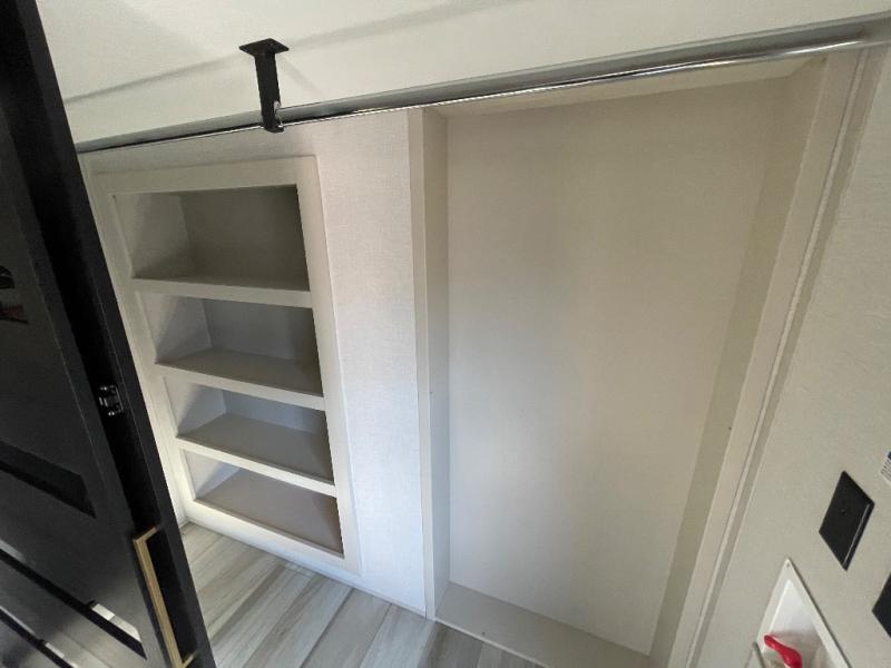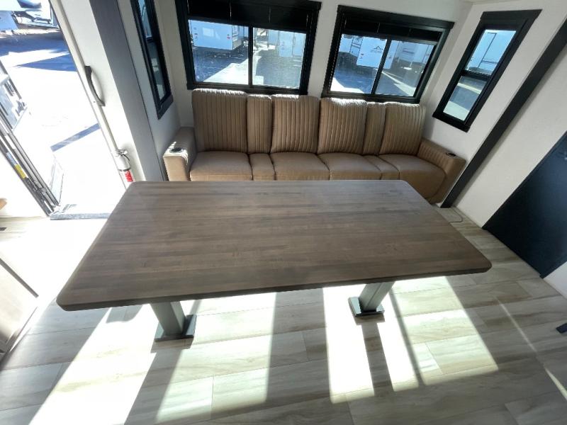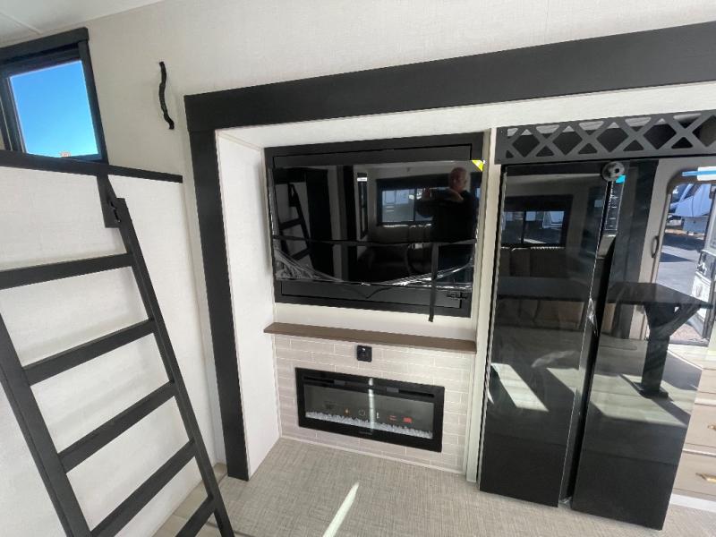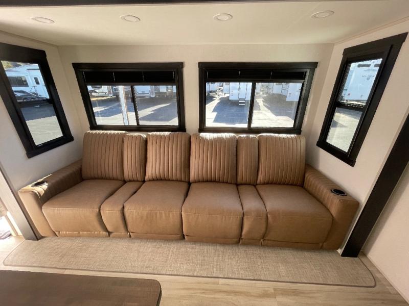 The whole family will love camping in this spacious fifth wheel! There are four slide outs, two bedrooms, plus two full baths, one of which is located in the rear master bedroom. A custom queen bed and dual wardrobes are also found in the master, while a custom king bed is found in the front private bedroom. And the loft with bunk mats can be used for additional sleeping or storage space! The chef of your group will find a full kitchen to cook meals, including ample counter space and a 16-cu. ft. 12V refrigerator and hidden storage behind the 50" TV for snacks or movies. The theater seating with cup holders provides a comfy place to relax each day, and the kitchen island with chairs will be perfect for dining space!