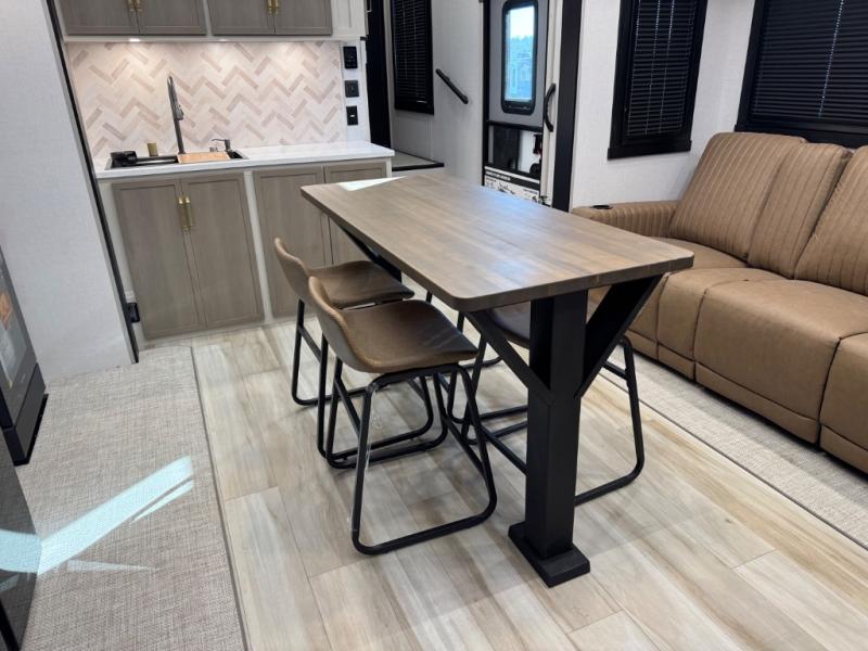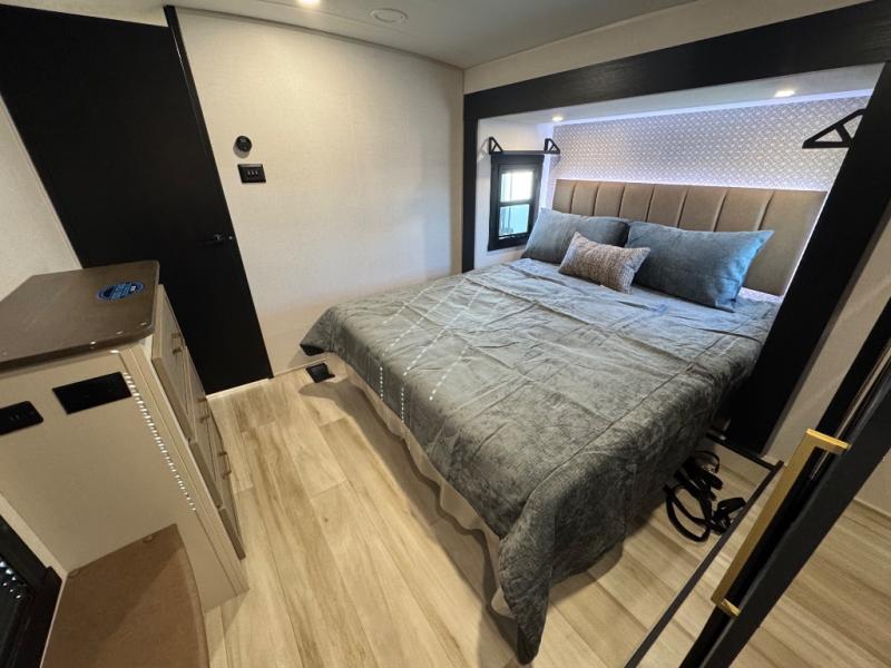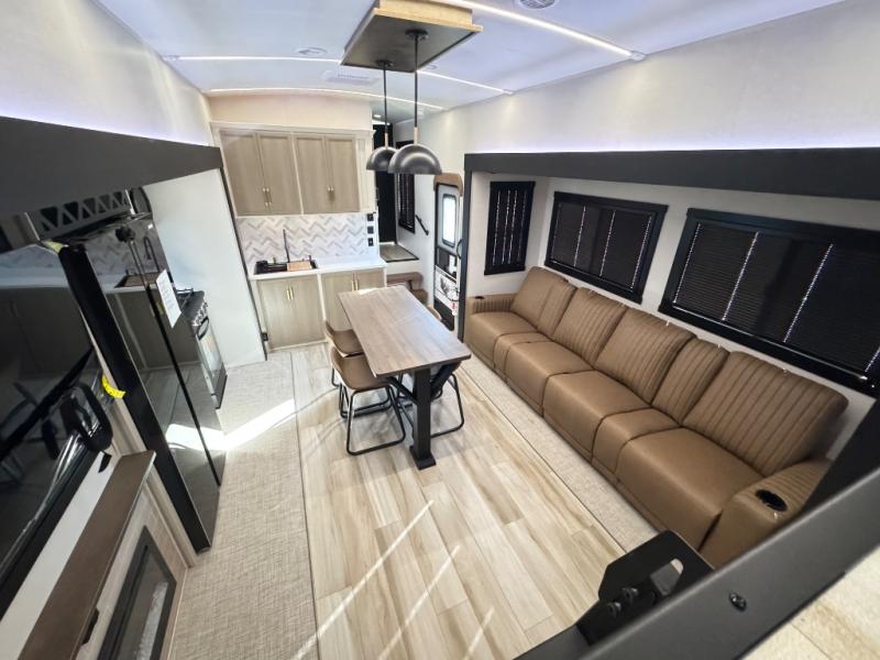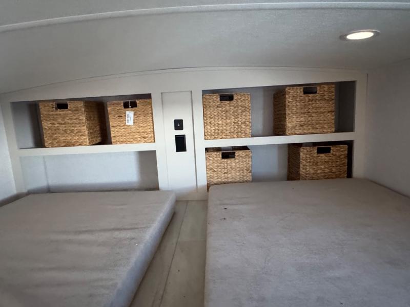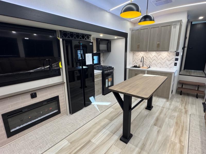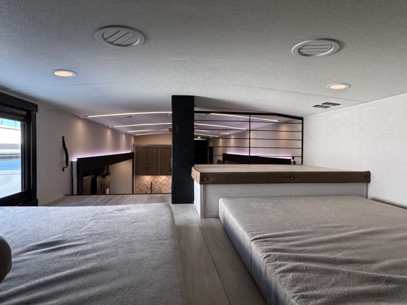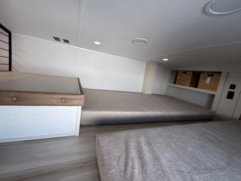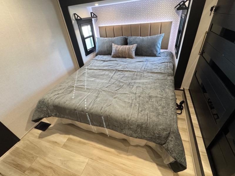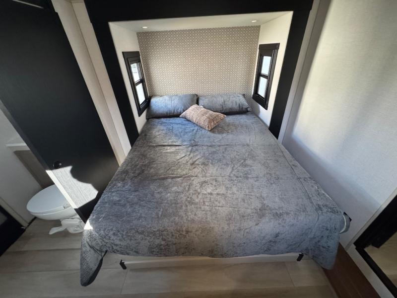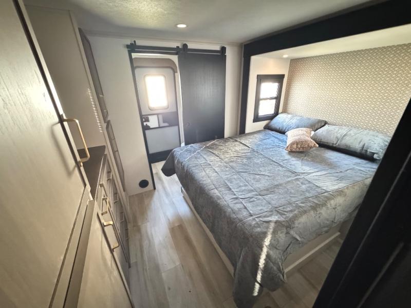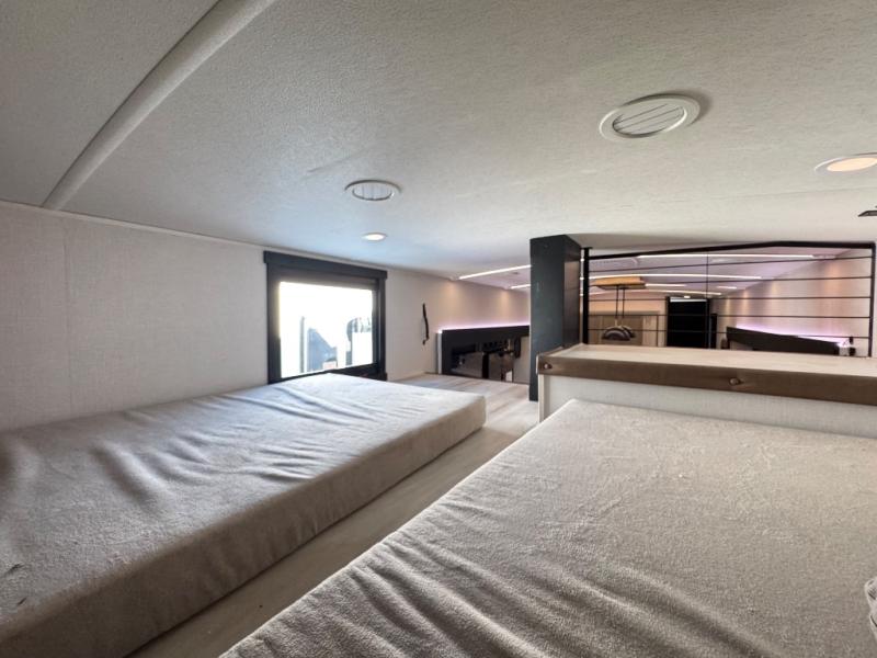 The whole family will love camping in this spacious fifth wheel! There are four slide outs, two bedrooms, plus two full baths, one of which is located in the rear master bedroom. A custom queen bed and dual wardrobes are also found in the master, while a custom king bed is found in the front private bedroom. And the loft with bunk mats can be used for additional sleeping or storage space! The chef of your group will find a full kitchen to cook meals, including ample counter space and a 16-cu. ft. 12V refrigerator and hidden storage behind the 50" TV for snacks or movies. The theater seating with cup holders provides a comfy place to relax each day, and the kitchen island with chairs will be perfect for dining space!