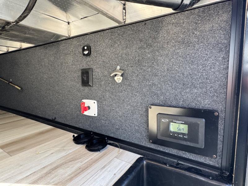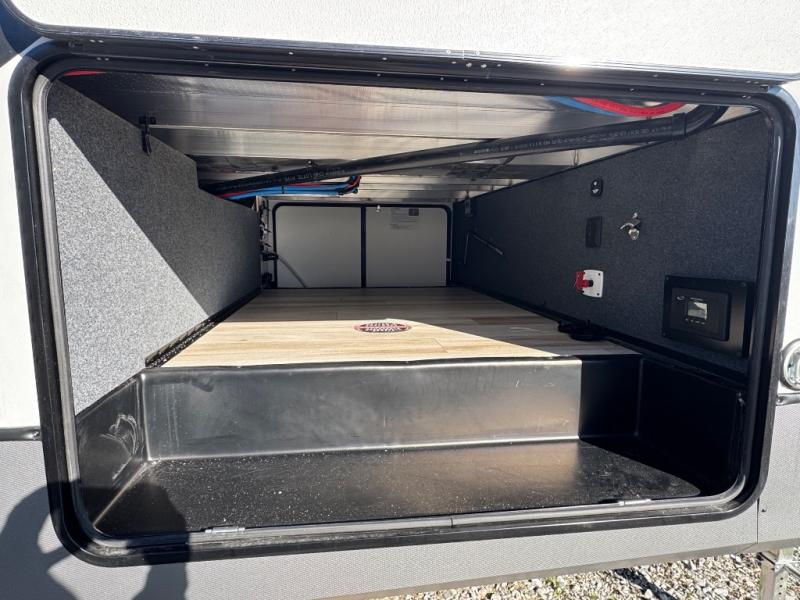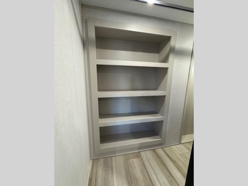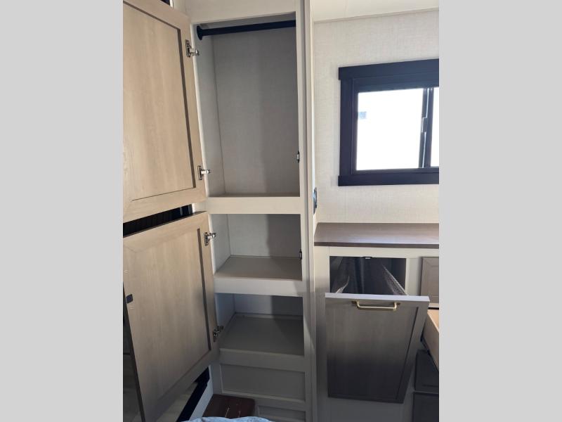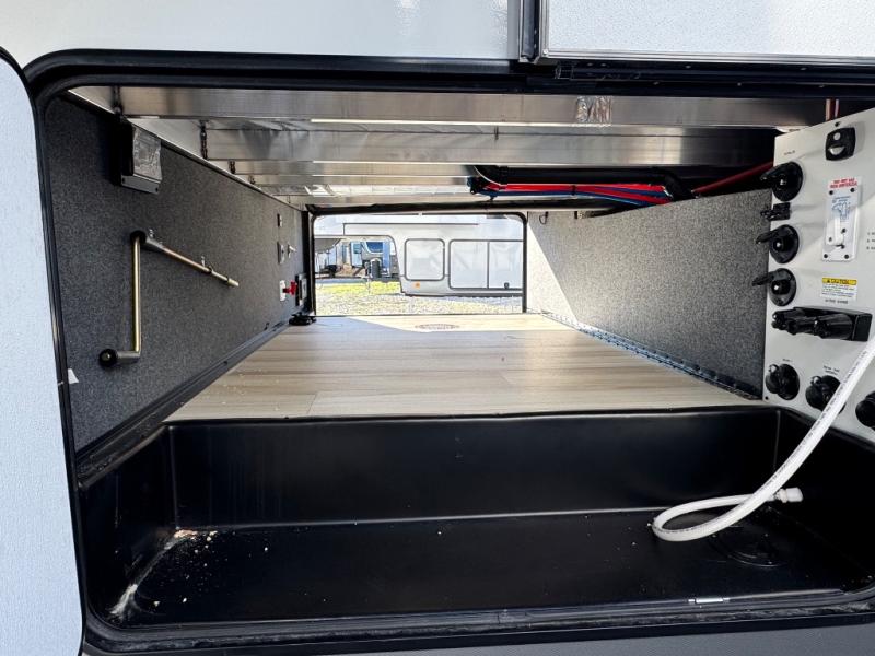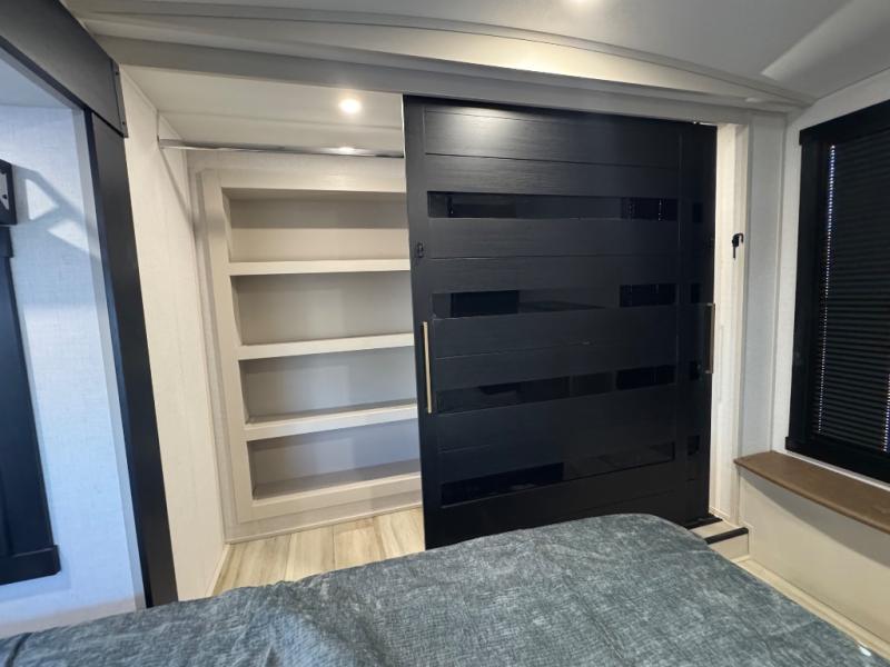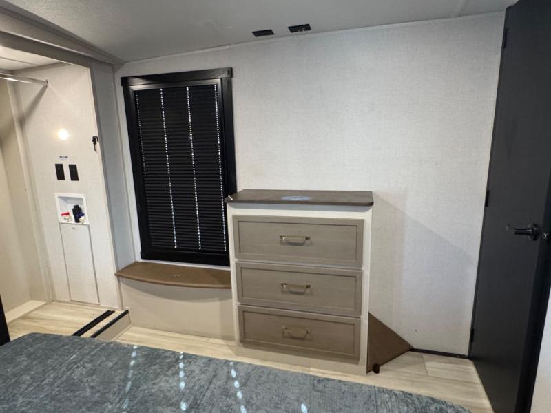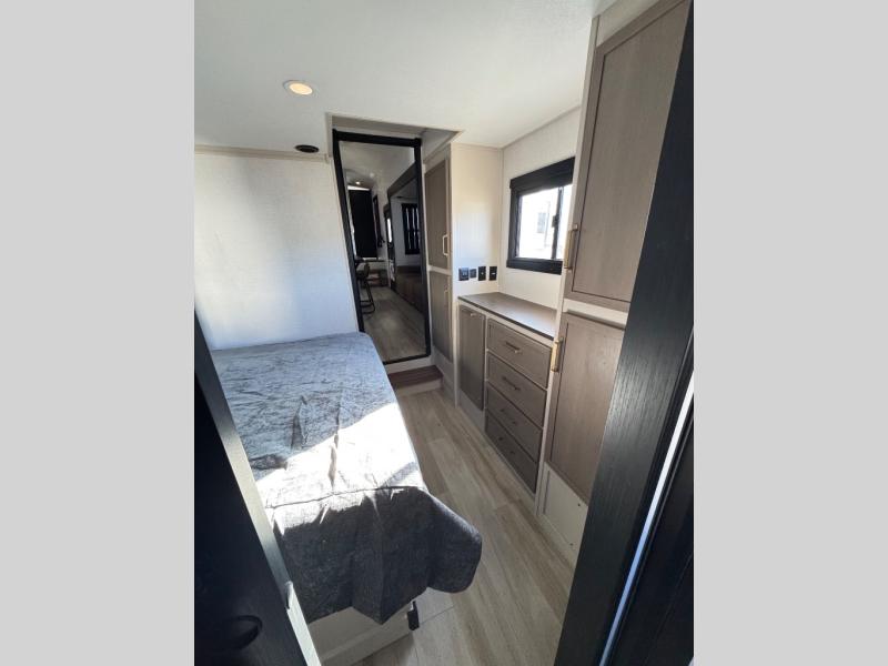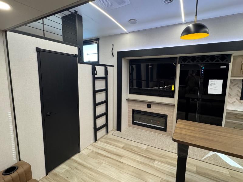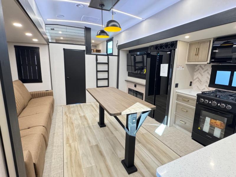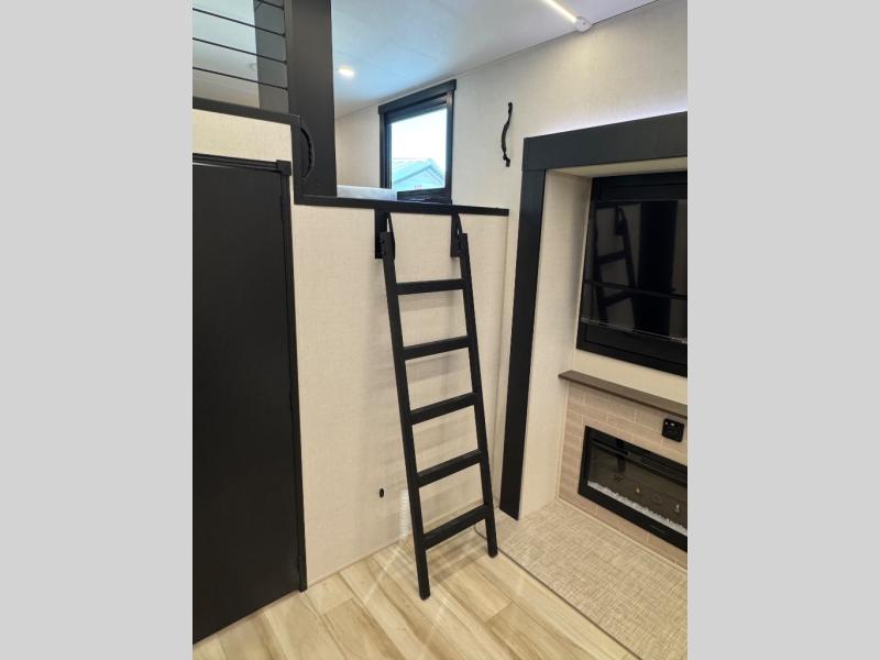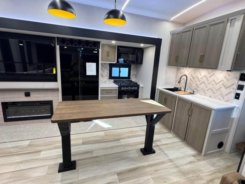 The whole family will love camping in this spacious fifth wheel! There are four slide outs, two bedrooms, plus two full baths, one of which is located in the rear master bedroom. A custom queen bed and dual wardrobes are also found in the master, while a custom king bed is found in the front private bedroom. And the loft with bunk mats can be used for additional sleeping or storage space! The chef of your group will find a full kitchen to cook meals, including ample counter space and a 16-cu. ft. 12V refrigerator and hidden storage behind the 50" TV for snacks or movies. The theater seating with cup holders provides a comfy place to relax each day, and the kitchen island with chairs will be perfect for dining space!