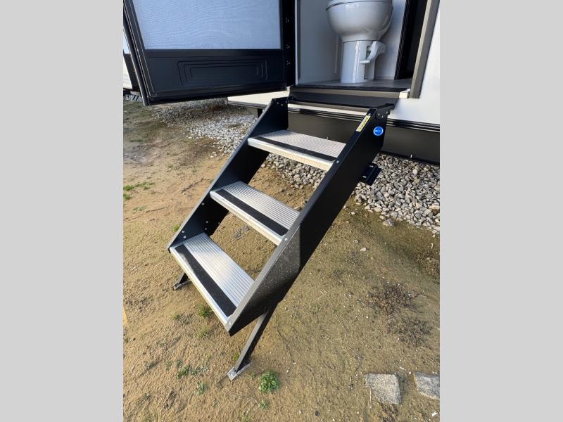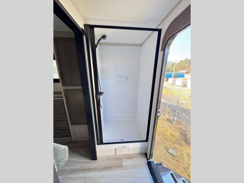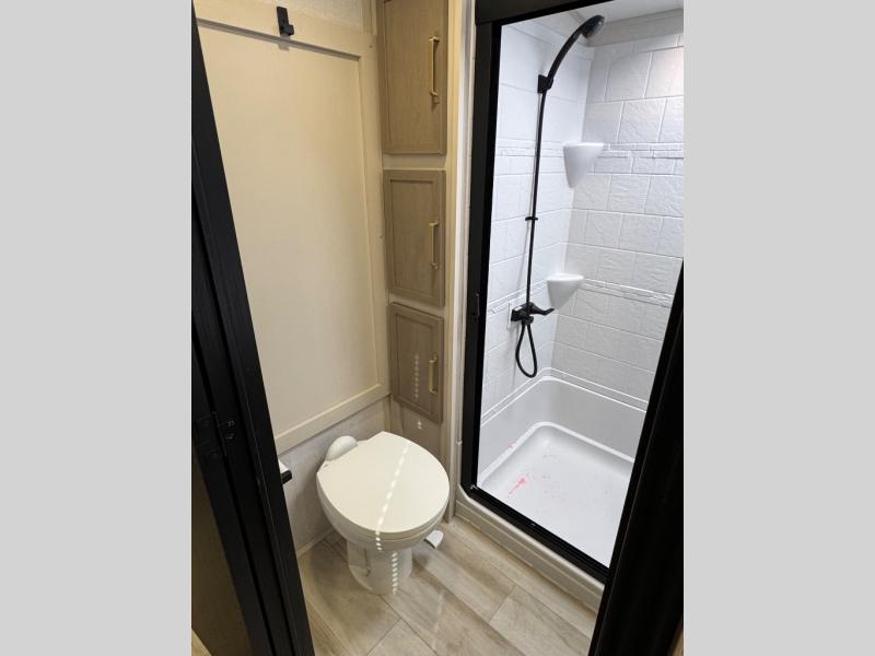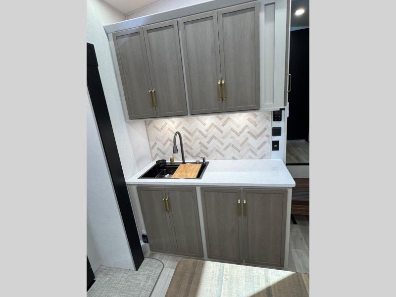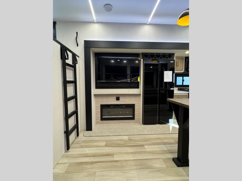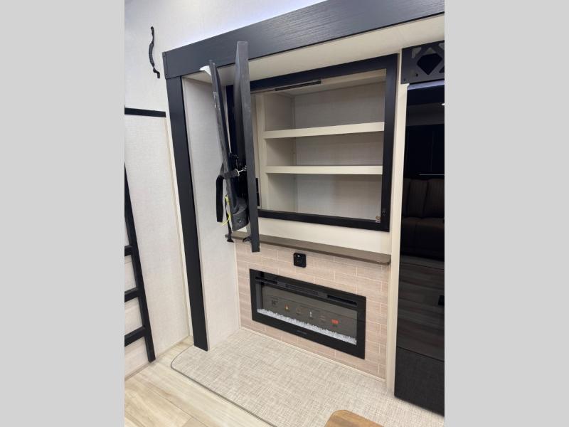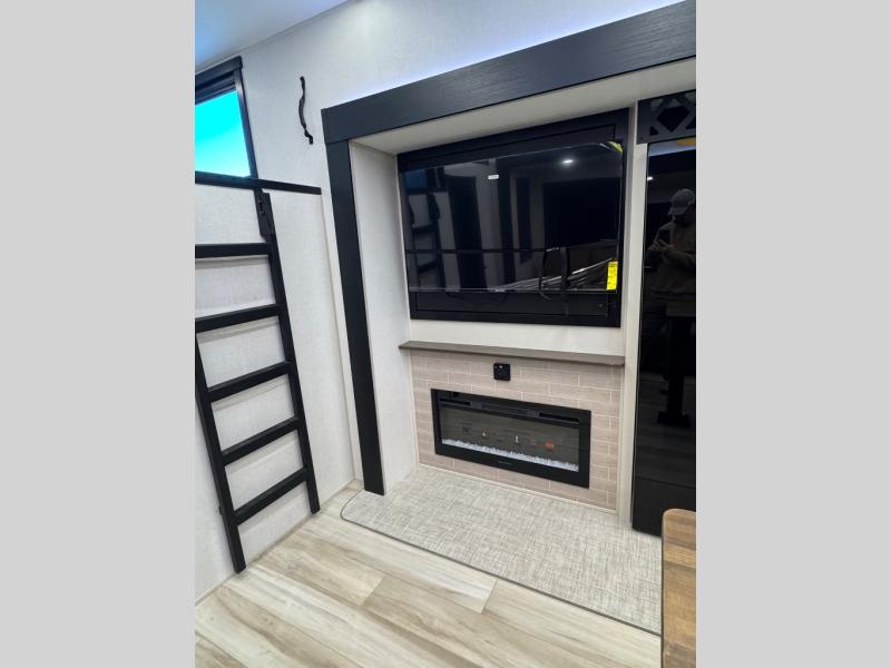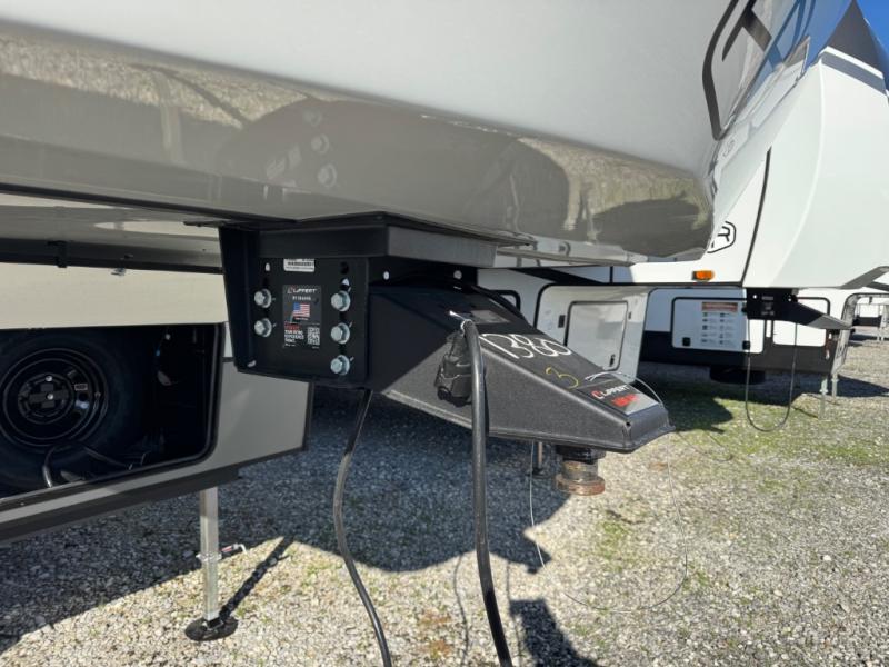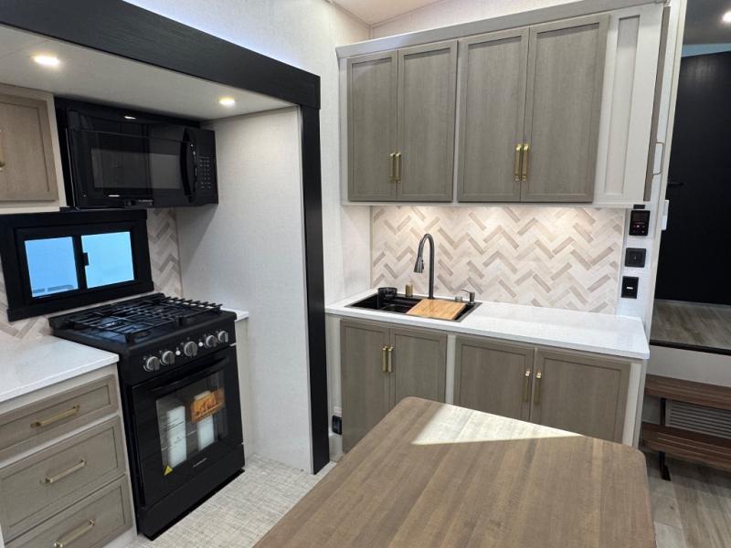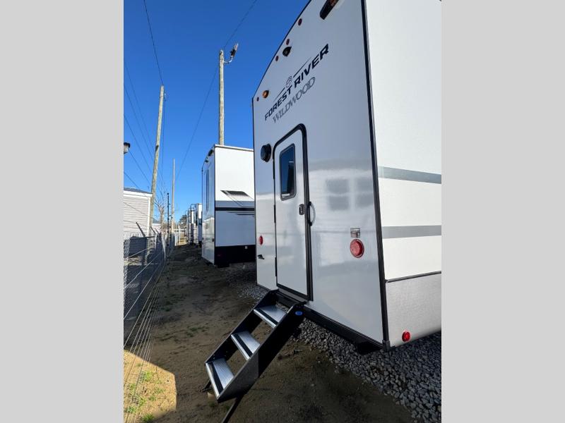 With any Wildwood Heritage Glen fifth wheel by Forest River, the quality construction, attention to detail and design along with a bright and welcoming interior allows you to relax in comfort. You'll love the high-end solid surface countertops included in the Elevated Value Package, along with a JBL sound system, full-length barreled ceilings, and an ultimate interior lighting upgrade. The included Expedition Package features an Accesibelly underbelly panel with 12V tank heaters, nitrogen-filled tires with aluminum rims, and a spacious 30" wide main entry door with a window. The Lippert On-The-Go ladder prep and back-up camera prep let you customize your fifth wheel even more, and the LED awning, front cap, marker and taillights will make it easier than ever to set up camp!