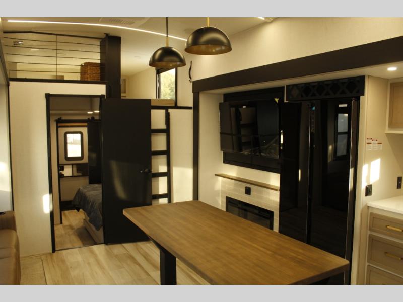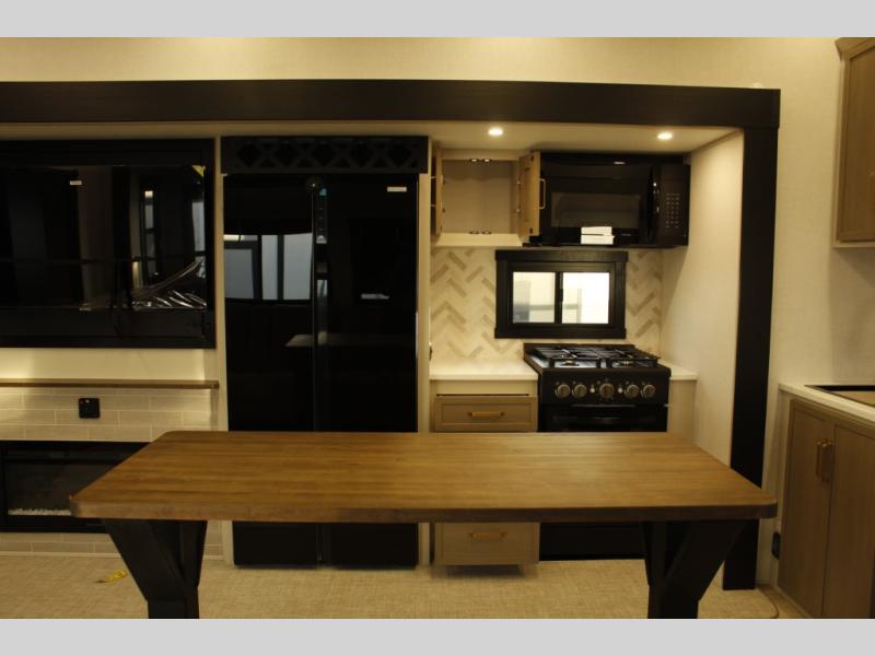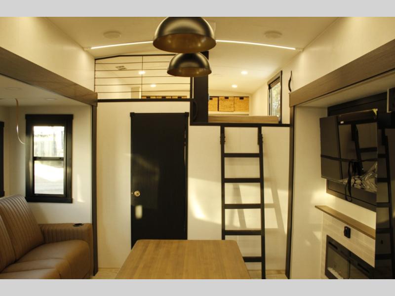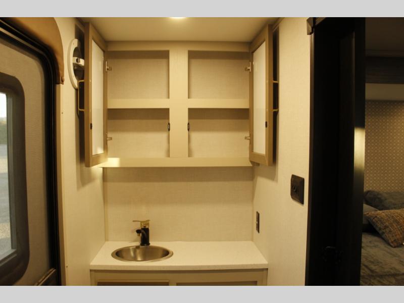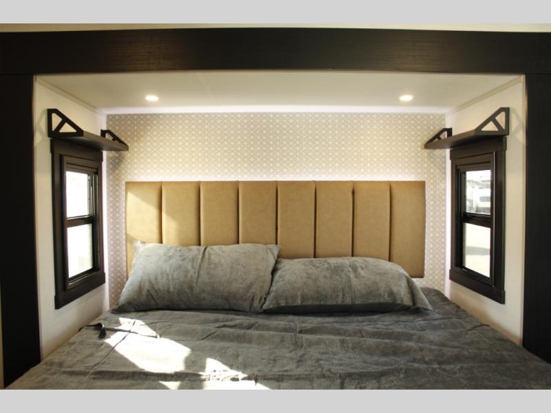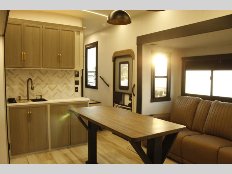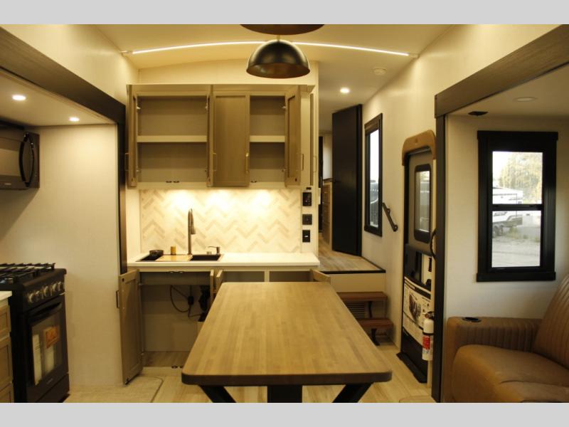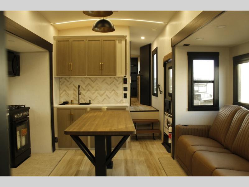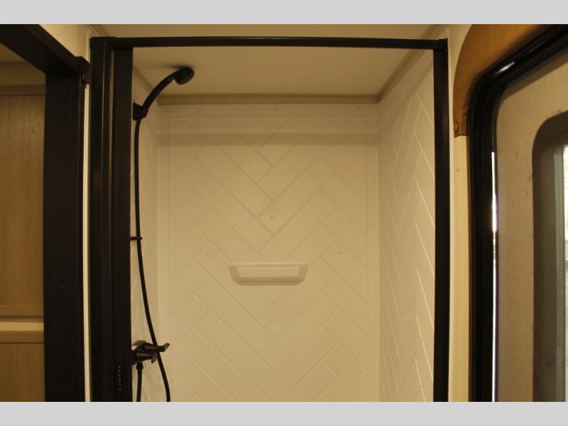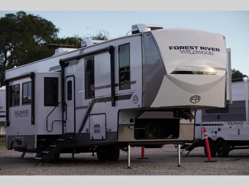 With any Wildwood Heritage Glen fifth wheel by Forest River, the quality construction, attention to detail and design along with a bright and welcoming interior allows you to relax in comfort. You'll love the high-end solid surface countertops included in the Elevated Value Package, along with a JBL sound system, full-length barreled ceilings, and an ultimate interior lighting upgrade. The included Expedition Package features an Accesibelly underbelly panel with 12V tank heaters, nitrogen-filled tires with aluminum rims, and a spacious 30" wide main entry door with a window. The Lippert On-The-Go ladder prep and back-up camera prep let you customize your fifth wheel even more, and the LED awning, front cap, marker and taillights will make it easier than ever to set up camp!