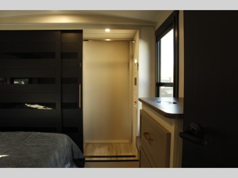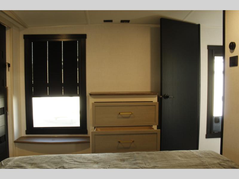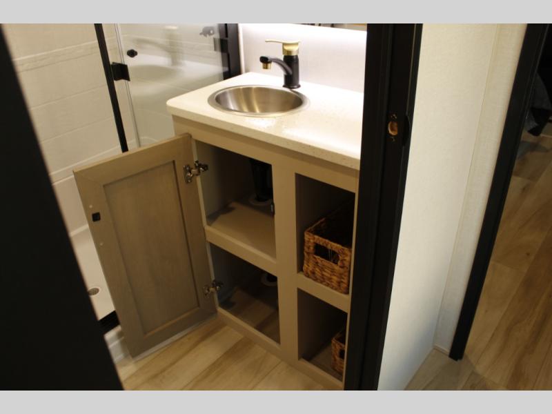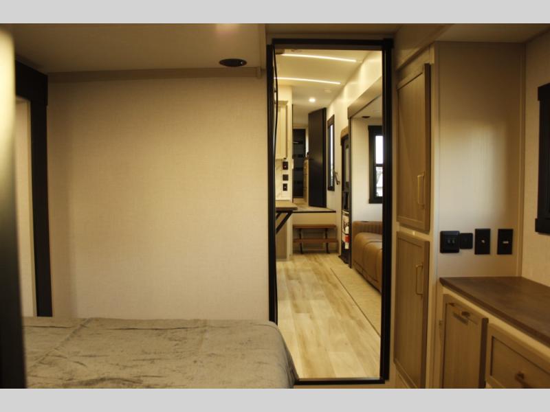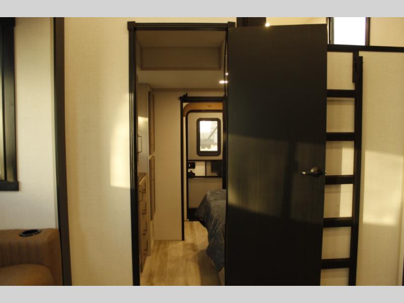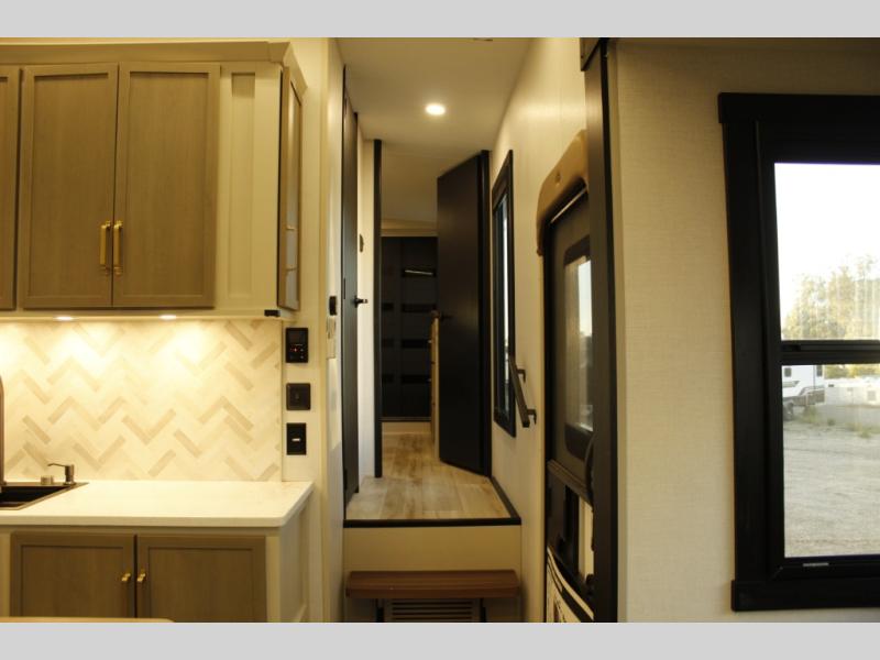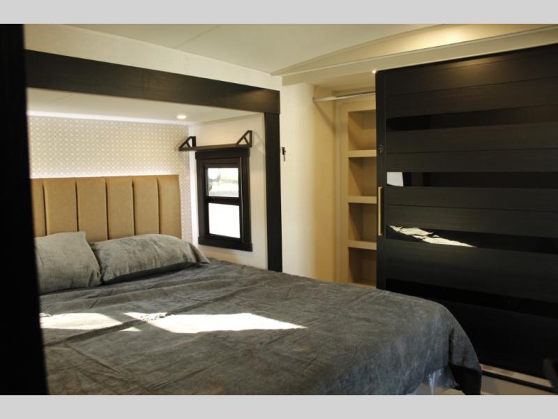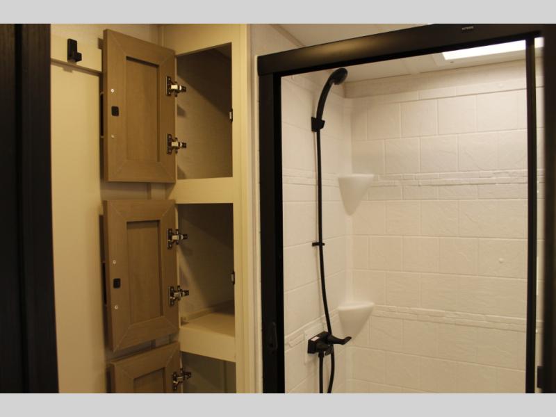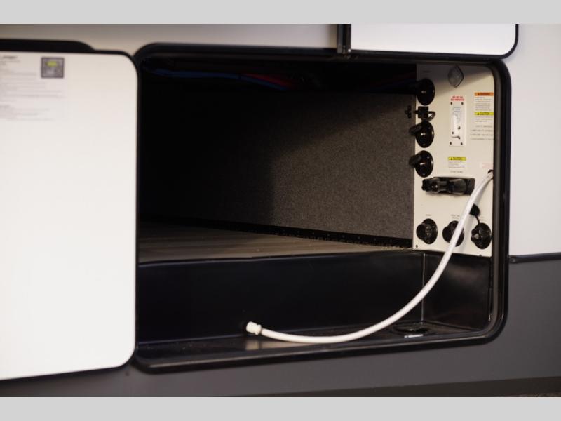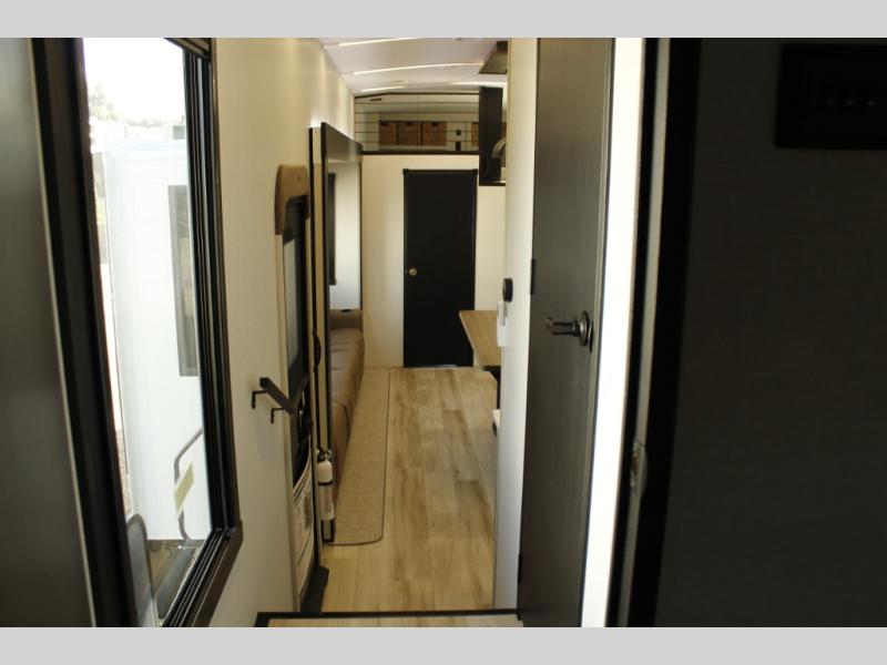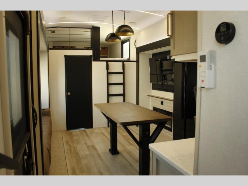 With any Wildwood Heritage Glen fifth wheel by Forest River, the quality construction, attention to detail and design along with a bright and welcoming interior allows you to relax in comfort. You'll love the high-end solid surface countertops included in the Elevated Value Package, along with a JBL sound system, full-length barreled ceilings, and an ultimate interior lighting upgrade. The included Expedition Package features an Accesibelly underbelly panel with 12V tank heaters, nitrogen-filled tires with aluminum rims, and a spacious 30" wide main entry door with a window. The Lippert On-The-Go ladder prep and back-up camera prep let you customize your fifth wheel even more, and the LED awning, front cap, marker and taillights will make it easier than ever to set up camp!