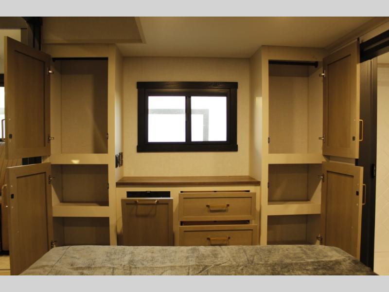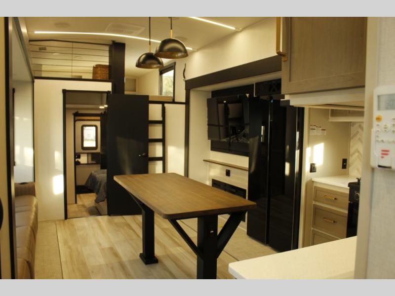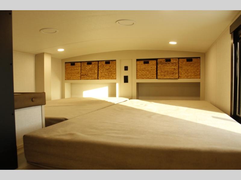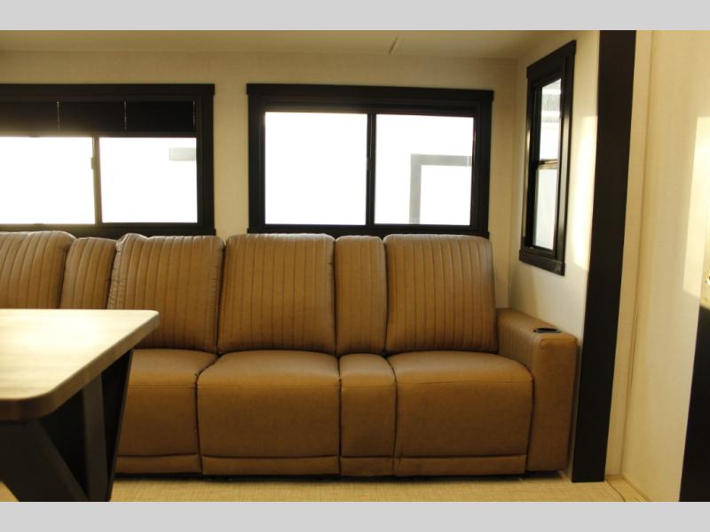 The whole family will love camping in this spacious fifth wheel! There are four slide outs, two bedrooms, plus two full baths, one of which is located in the rear master bedroom. A custom queen bed and dual wardrobes are also found in the master, while a custom king bed is found in the front private bedroom. And the loft with bunk mats can be used for additional sleeping or storage space! The chef of your group will find a full kitchen to cook meals, including ample counter space and a 16-cu. ft. 12V refrigerator and hidden storage behind the 50" TV for snacks or movies. The theater seating with cup holders provides a comfy place to relax each day, and the kitchen island with chairs will be perfect for dining space!