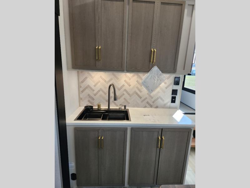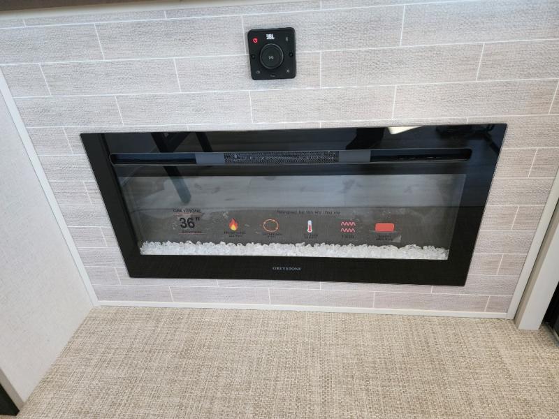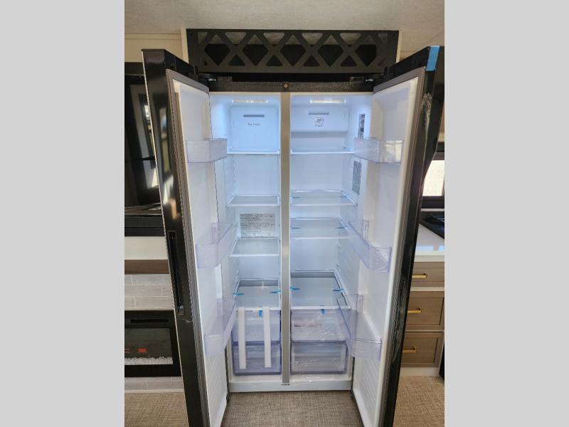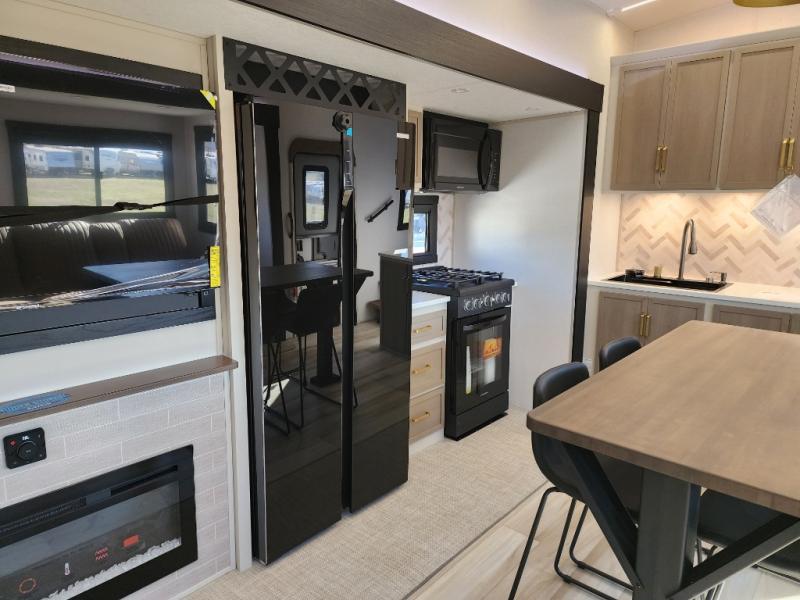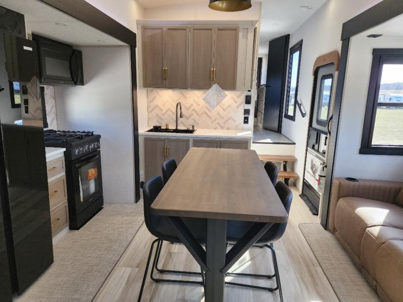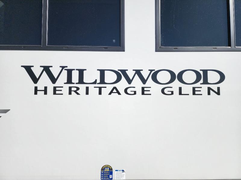 With any Wildwood Heritage Glen fifth wheel by Forest River, the quality construction, attention to detail and design along with a bright and welcoming interior allows you to relax in comfort. You'll love the high-end solid surface countertops included in the Elevated Value Package, along with a JBL sound system, full-length barreled ceilings, and an ultimate interior lighting upgrade. The included Expedition Package features an Accesibelly underbelly panel with 12V tank heaters, nitrogen-filled tires with aluminum rims, and a spacious 30" wide main entry door with a window. The Lippert On-The-Go ladder prep and back-up camera prep let you customize your fifth wheel even more, and the LED awning, front cap, marker and taillights will make it easier than ever to set up camp!