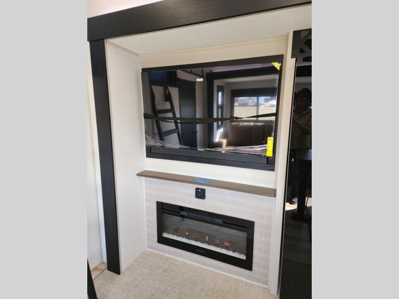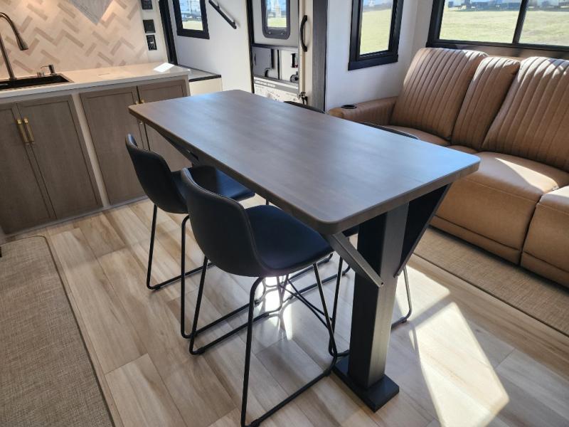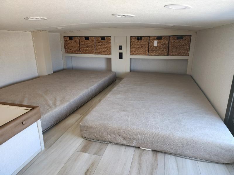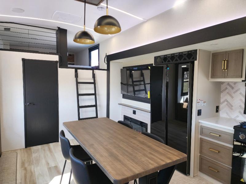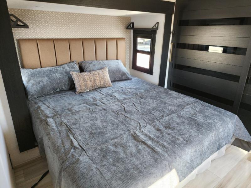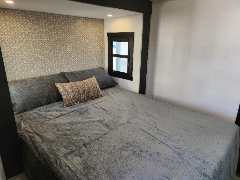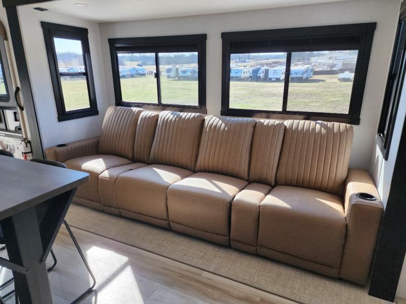 The whole family will love camping in this spacious fifth wheel! There are four slide outs, two bedrooms, plus two full baths, one of which is located in the rear master bedroom. A custom queen bed and dual wardrobes are also found in the master, while a custom king bed is found in the front private bedroom. And the loft with bunk mats can be used for additional sleeping or storage space! The chef of your group will find a full kitchen to cook meals, including ample counter space and a 16-cu. ft. 12V refrigerator and hidden storage behind the 50" TV for snacks or movies. The theater seating with cup holders provides a comfy place to relax each day, and the kitchen island with chairs will be perfect for dining space!
